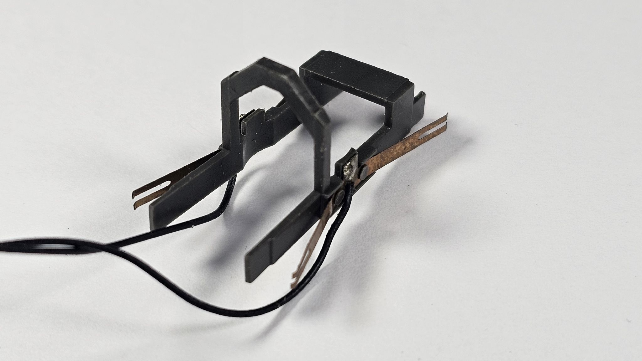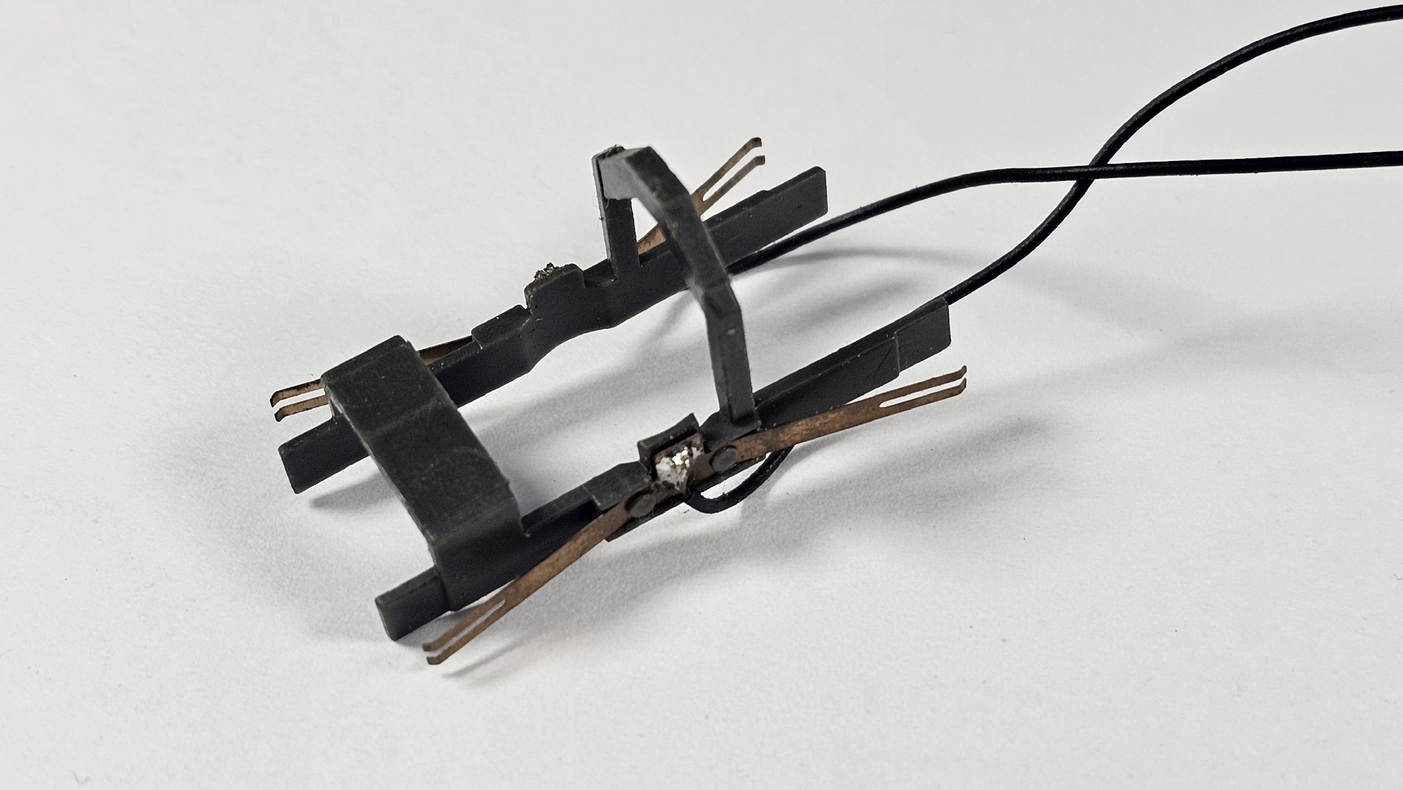 This is truck holder for some Vossloh locos, G2000, G1700, HLD77. It comes with pickups for electricity and soldered wires on them