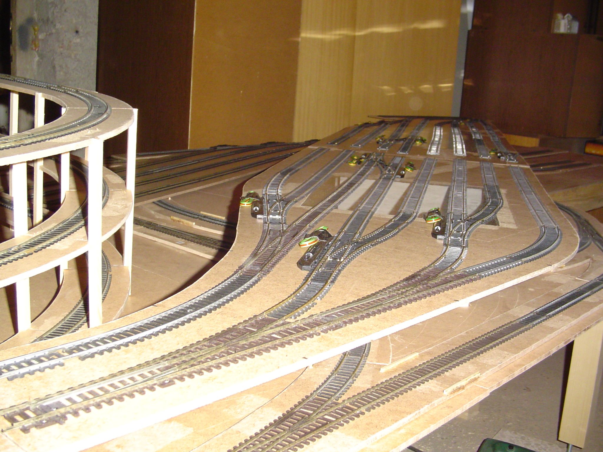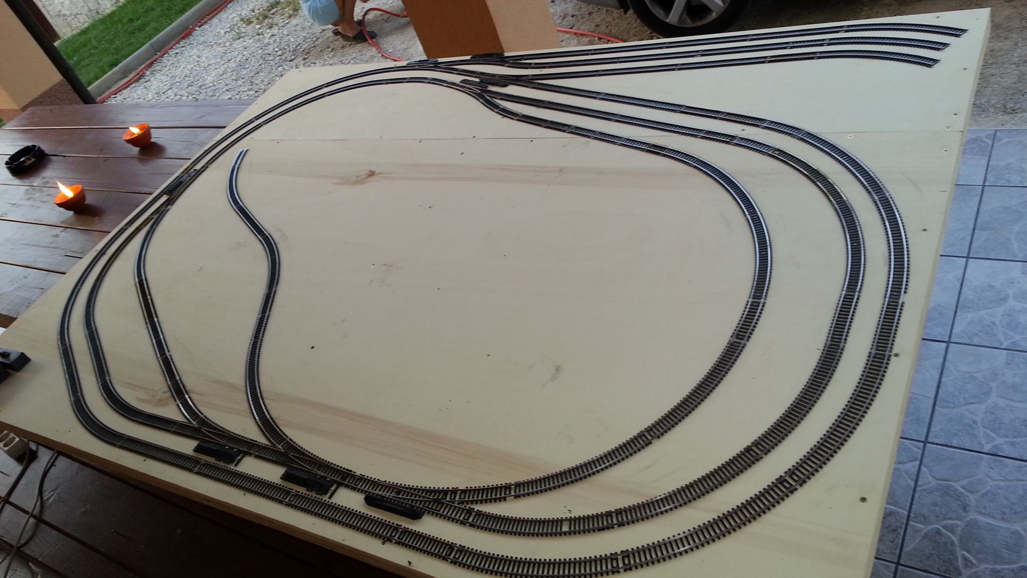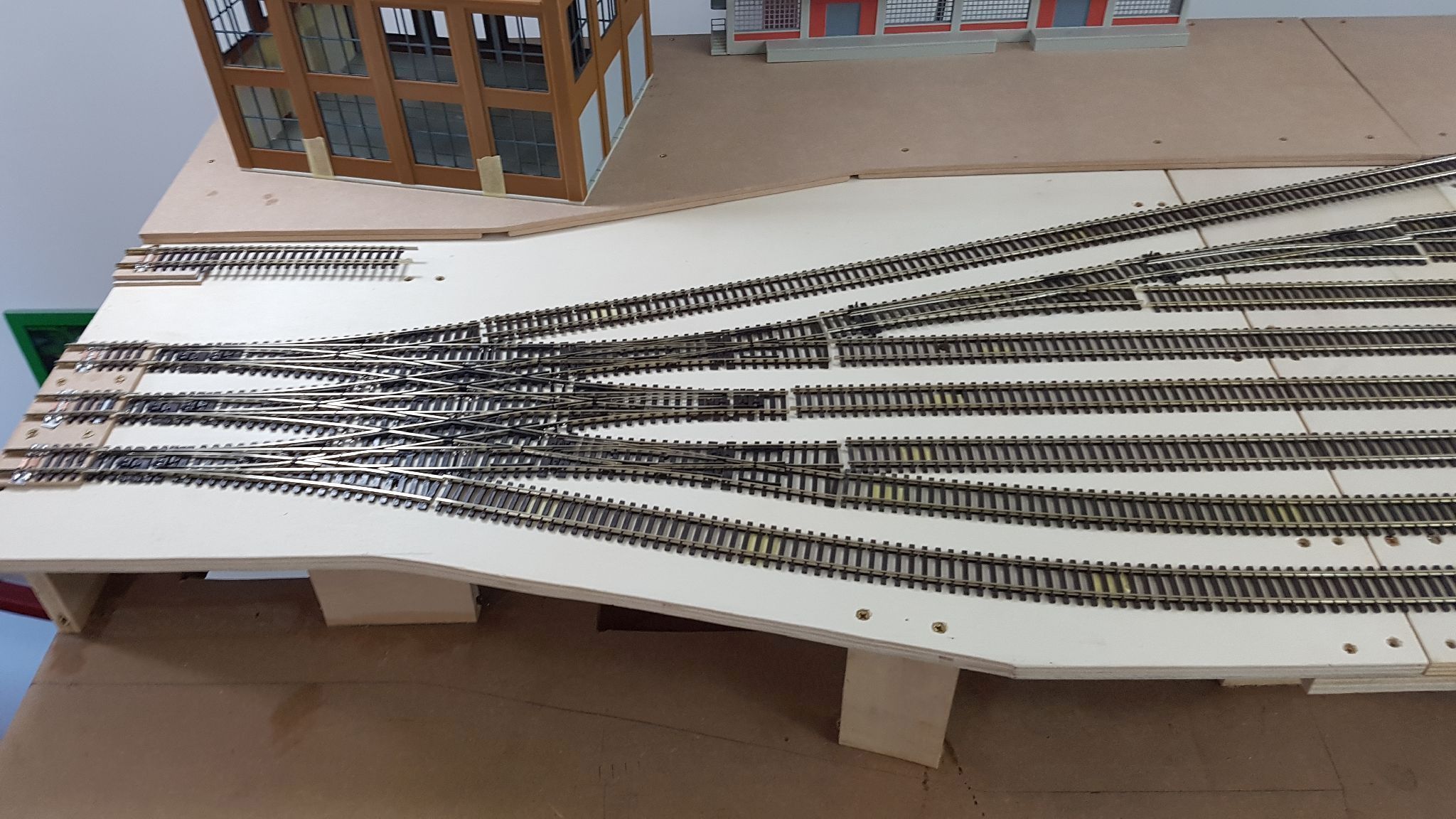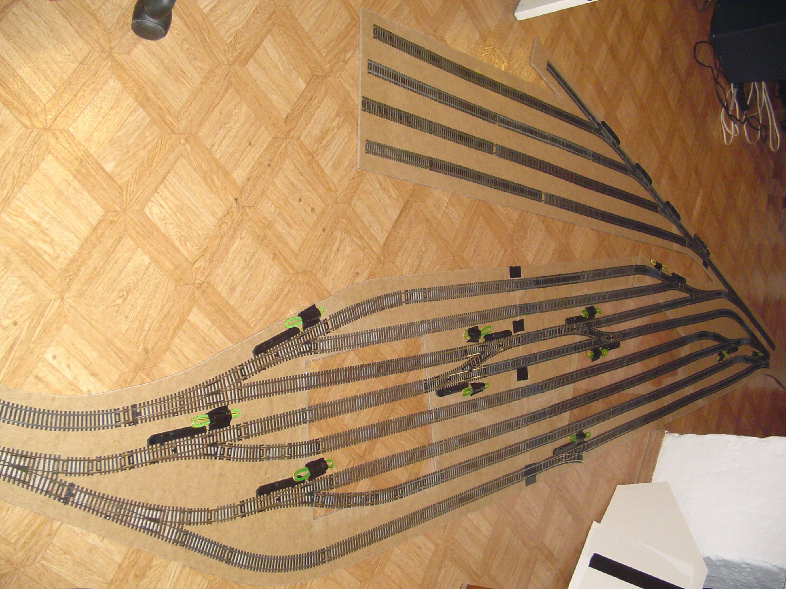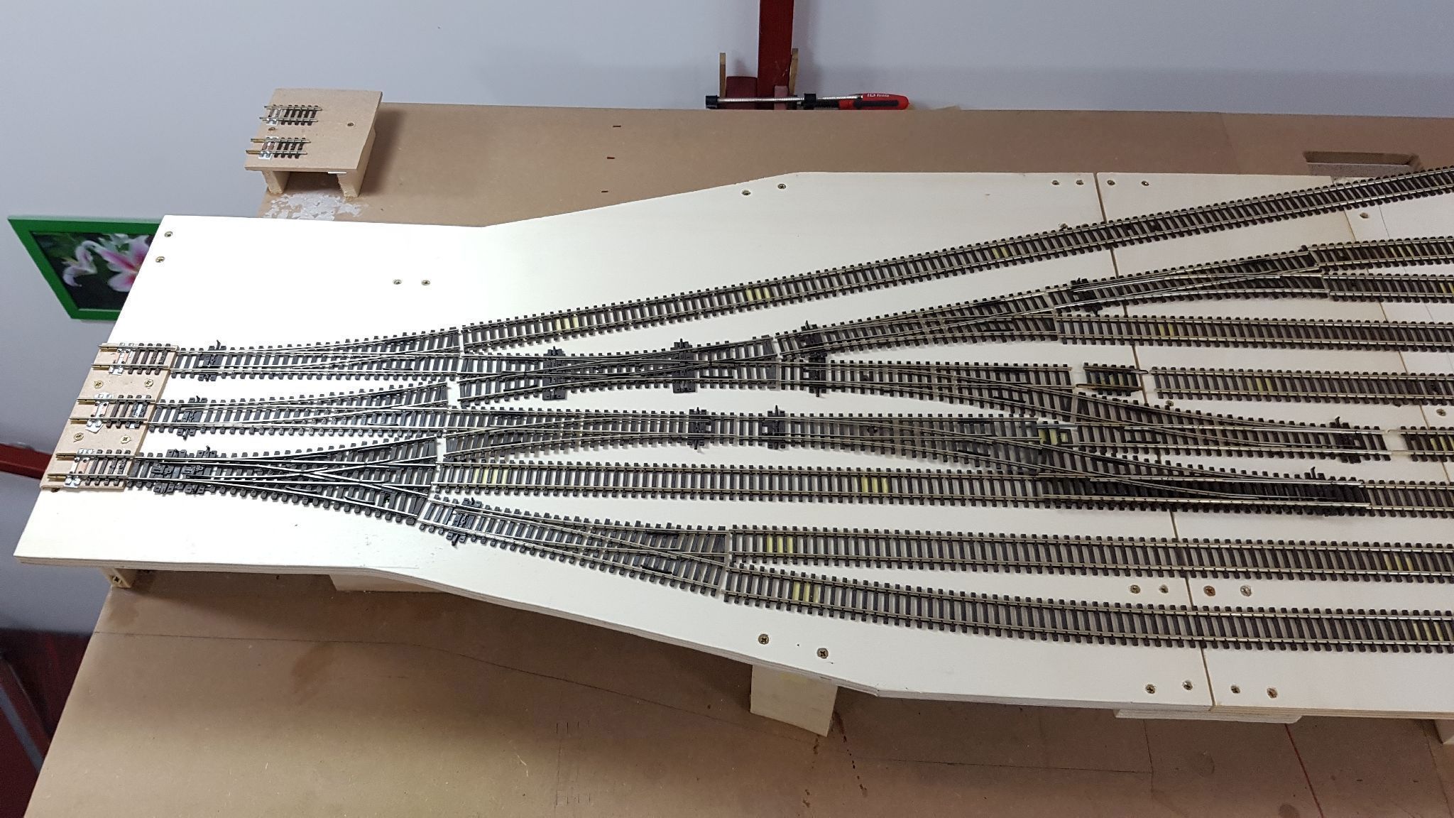 Tu sem za test izdelal lik z kretnicami katerega je namen da iz enega tira, iz obeh smeri pridete na drugega in obratno. To dvojno kretnico sem seveda uporabil kasneje. Izdelava se je nadaljevala z polaganjem tirov na skriti postaji kjer sem uporabil 4 kretnice krmiljene z motorji. Ko je bilo to narejeno sem naredil pokrove te skrite postaje, kateri so pa osnova za module na keterih bodo objekti in bodo seveda premakljivi, torej se bo dalo te module odstraniti zaradi dostopa do skrite postaje.