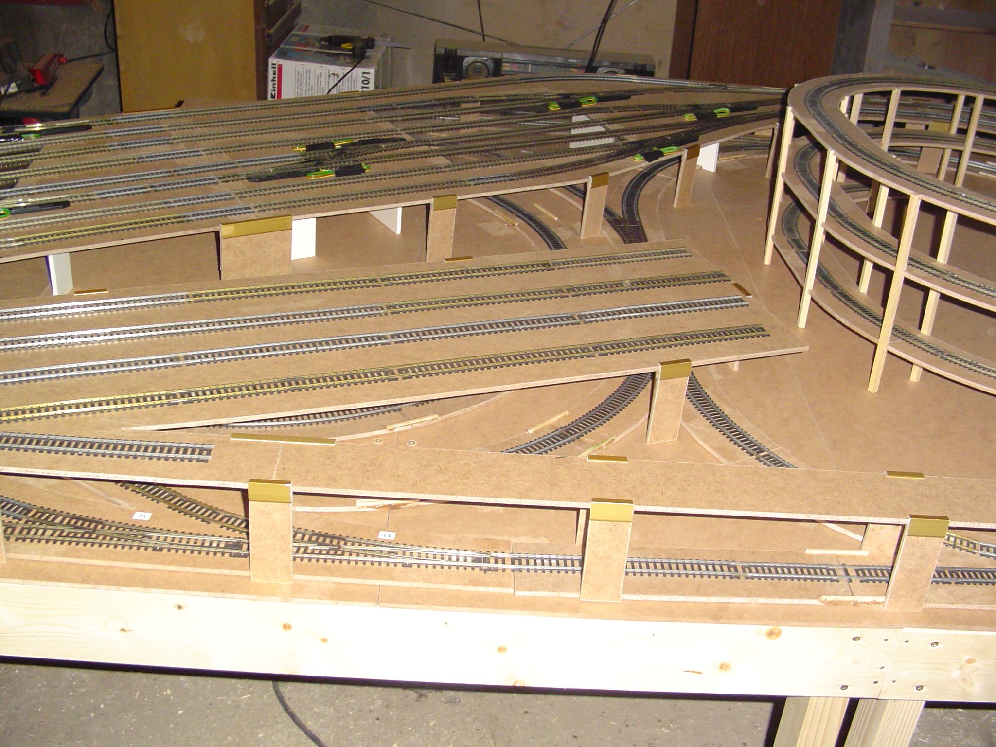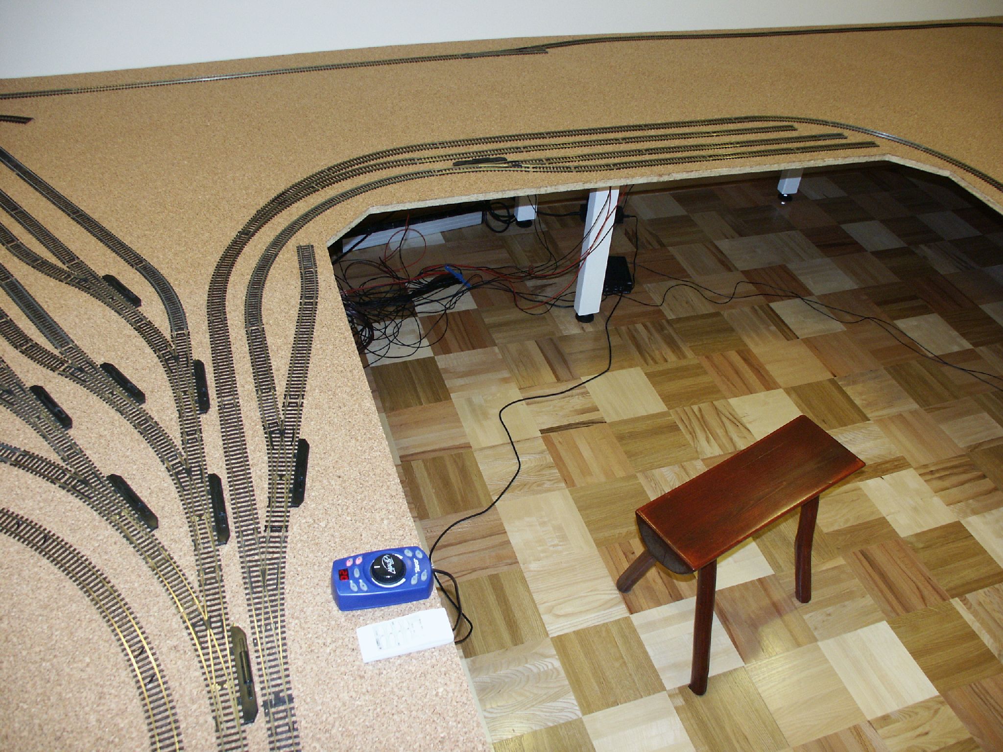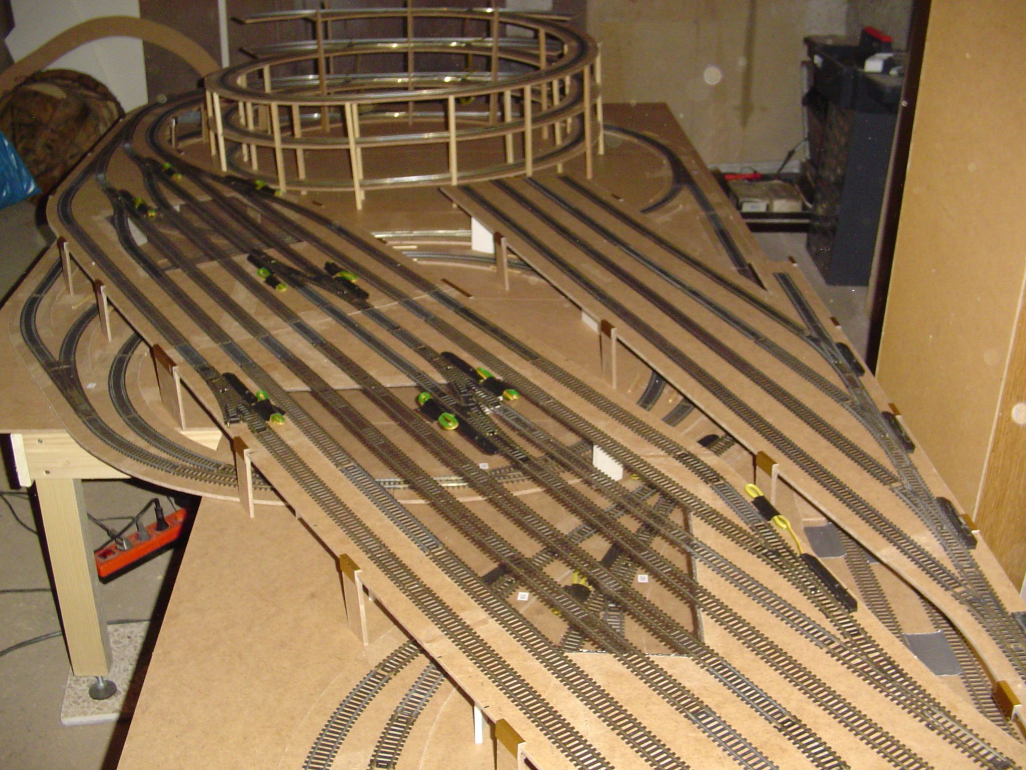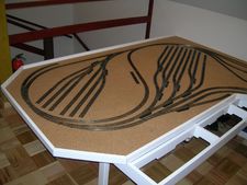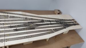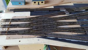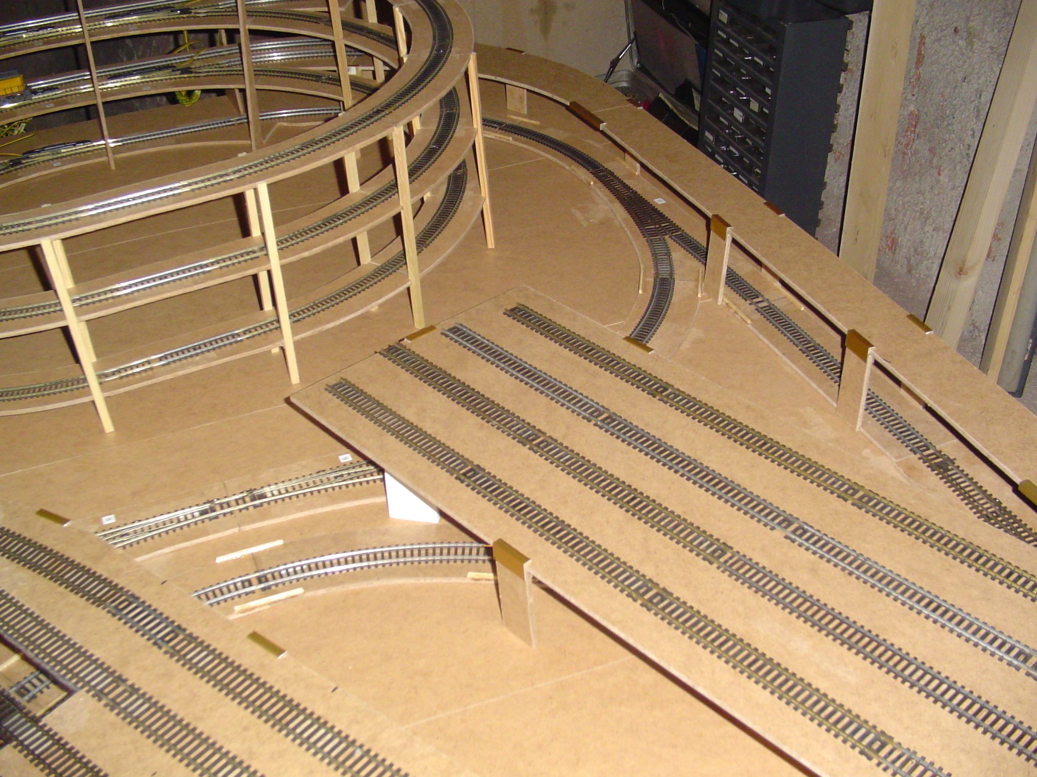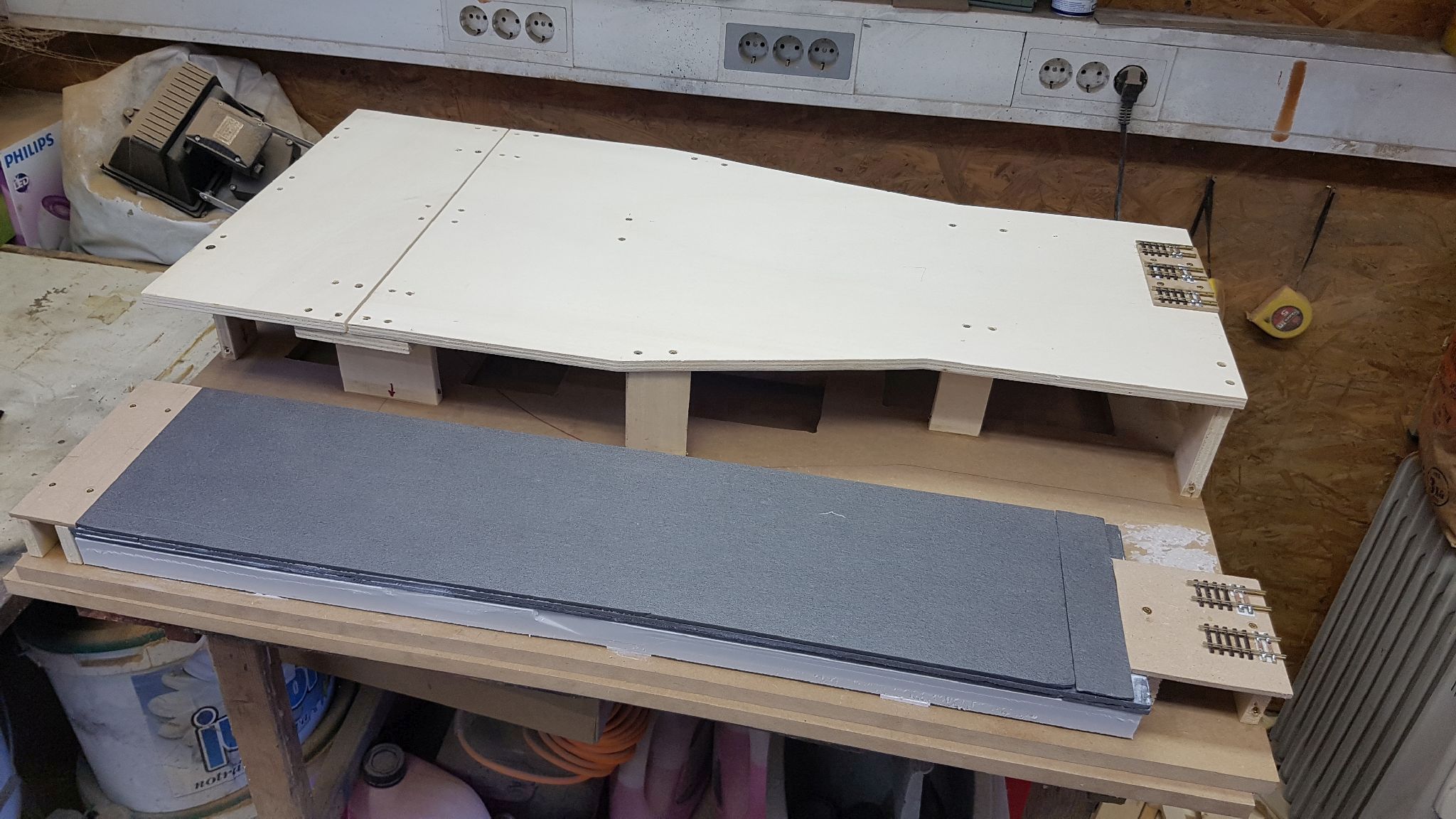 Tu sem za test izdelal lik z kretnicami katerega je namen da iz enega tira, iz obeh smeri pridete na drugega in obratno. To dvojno kretnico sem seveda uporabil kasneje. Izdelava se je nadaljevala z polaganjem tirov na skriti postaji kjer sem uporabil 4 kretnice krmiljene z motorji. Ko je bilo to narejeno sem naredil pokrove te skrite postaje, kateri so pa osnova za module na keterih bodo objekti in bodo seveda premakljivi, torej se bo dalo te module odstraniti zaradi dostopa do skrite postaje.