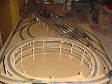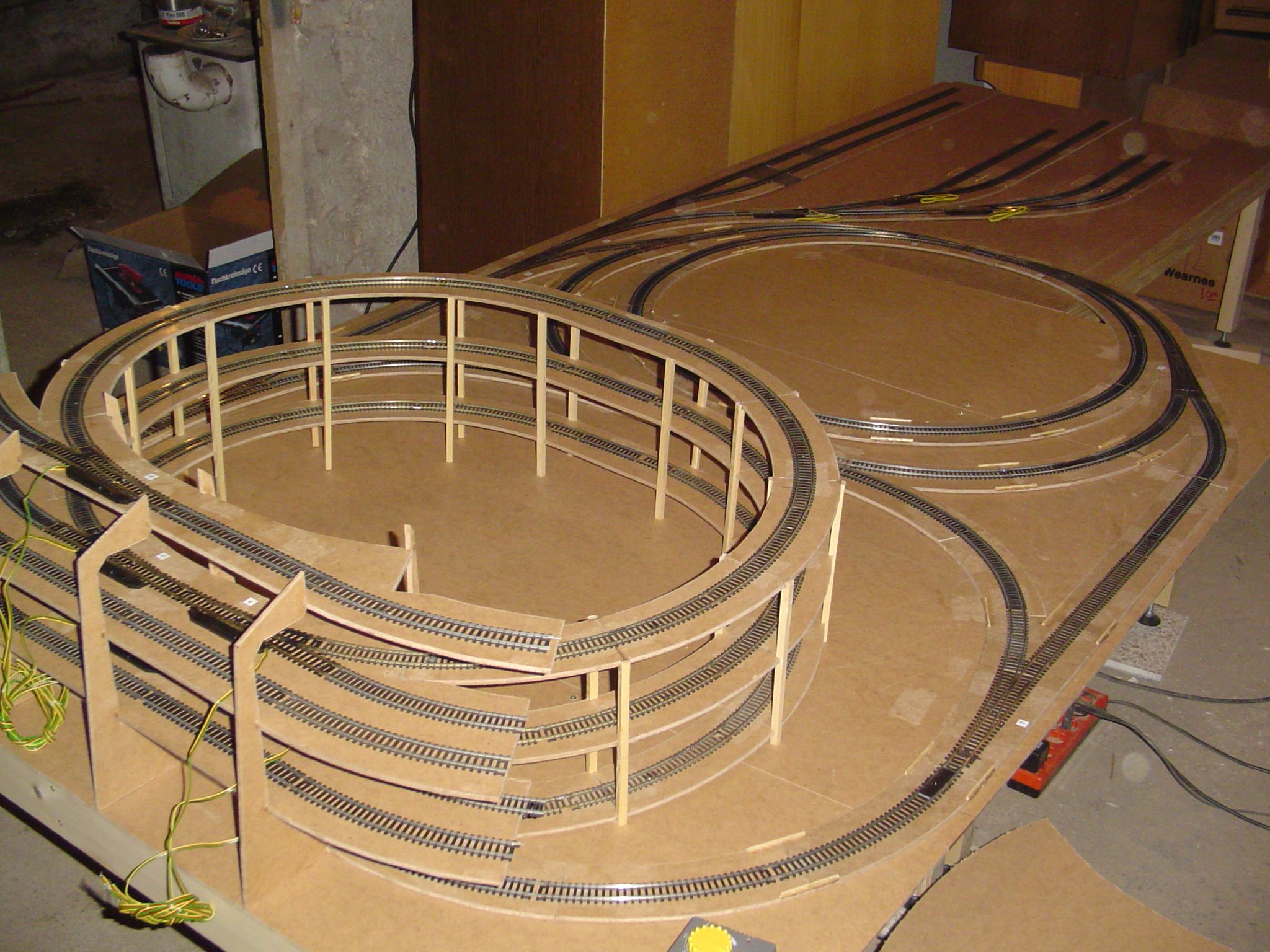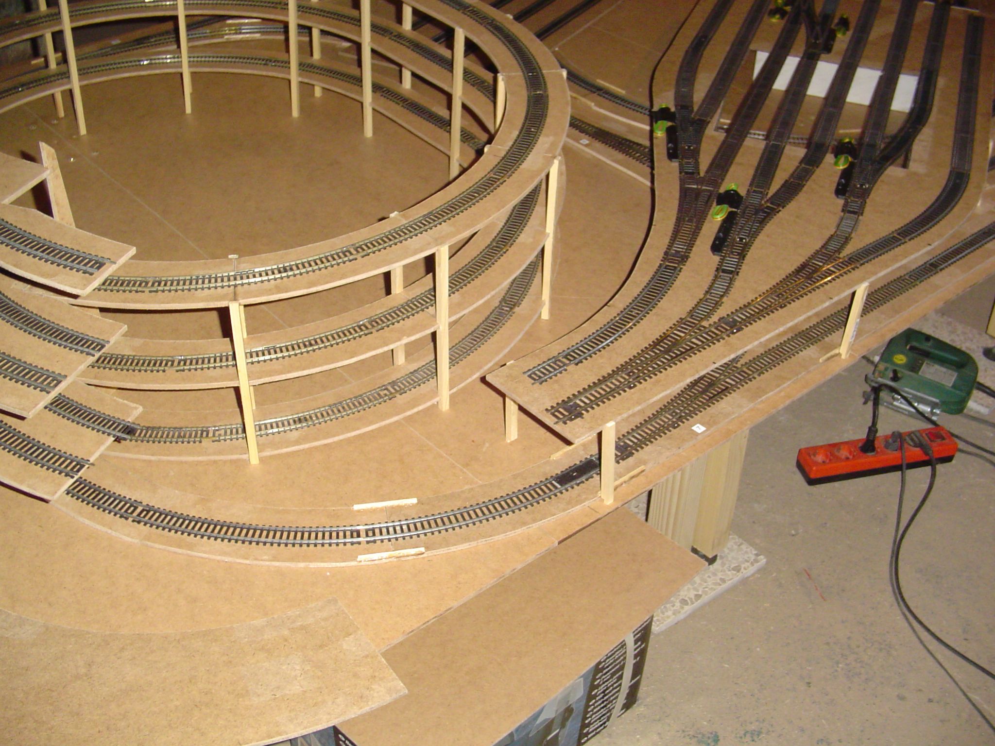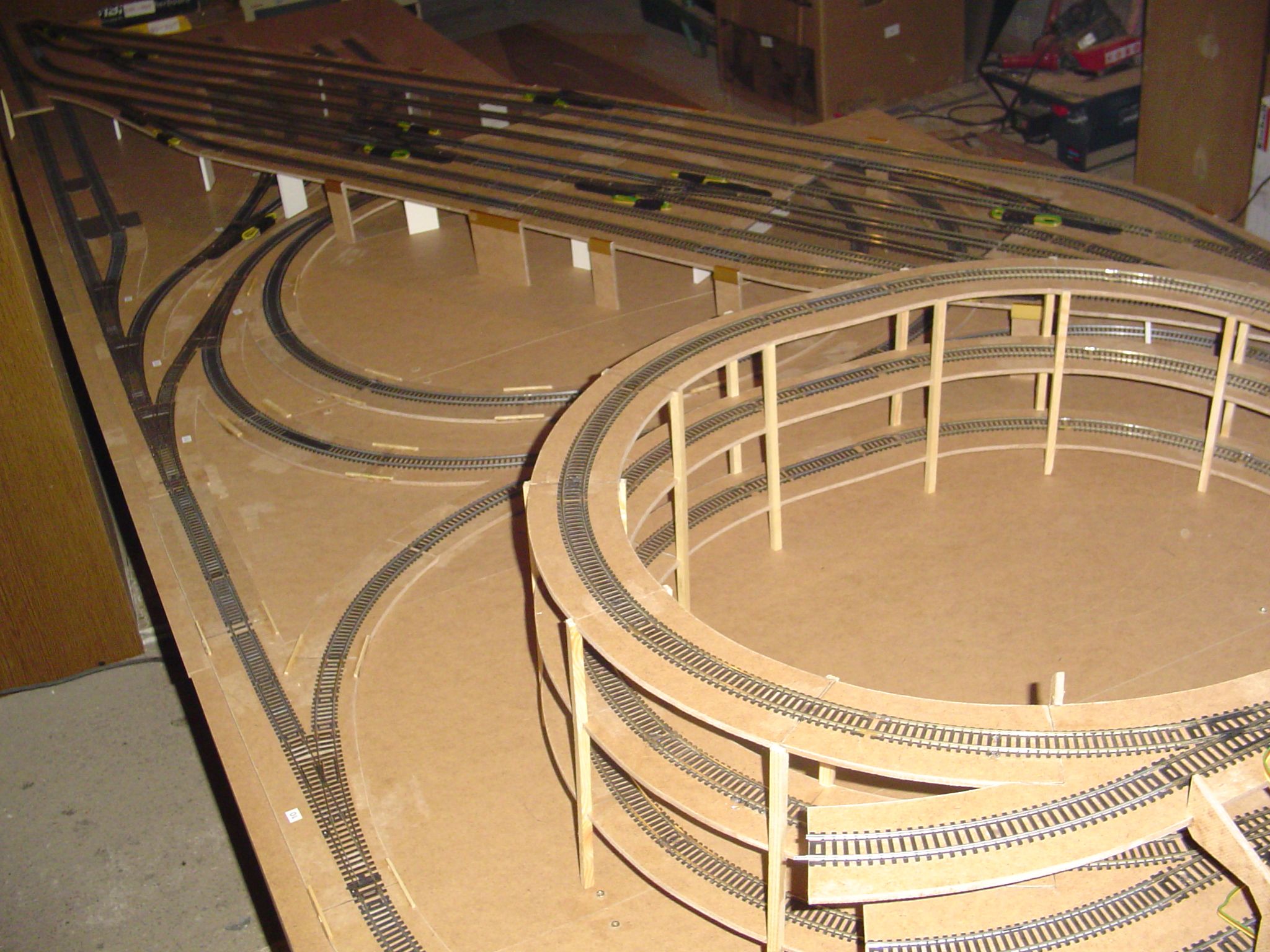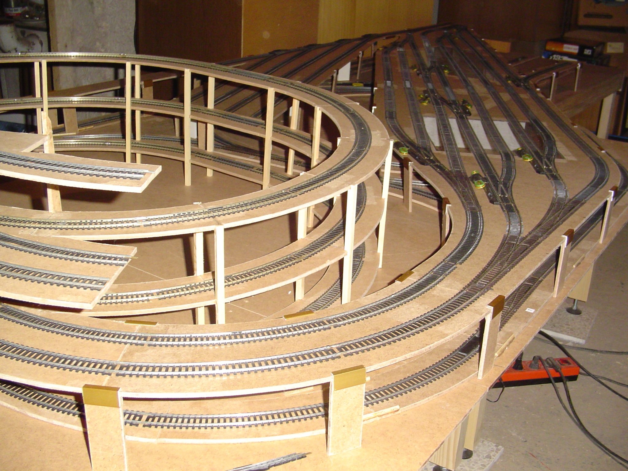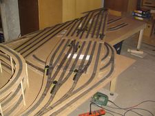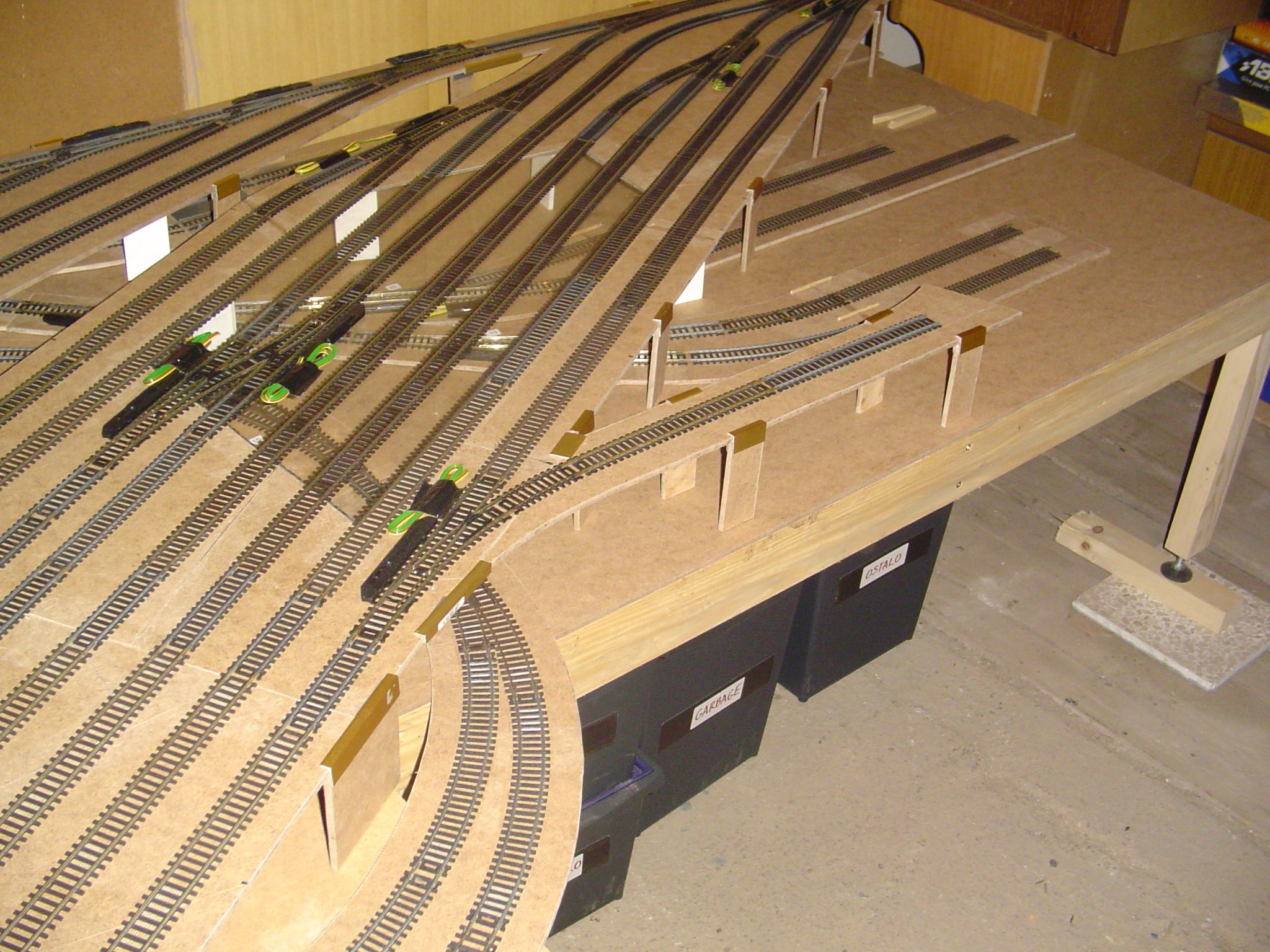Tu sem za test izdelal lik z kretnicami katerega je namen da iz enega tira, iz obeh smeri pridete na drugega in obratno. To dvojno kretnico sem seveda uporabil kasneje. Izdelava se je nadaljevala z polaganjem tirov na skriti postaji kjer sem uporabil 4 kretnice krmiljene z motorji. Ko je bilo to narejeno sem naredil pokrove te skrite postaje, kateri so pa osnova za module na keterih bodo objekti in bodo seveda premakljivi, torej se bo dalo te module odstraniti zaradi dostopa do skrite postaje.