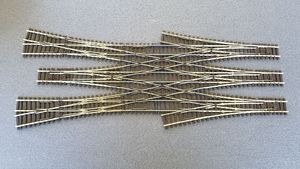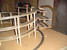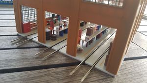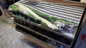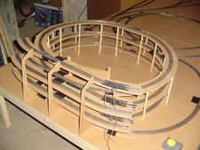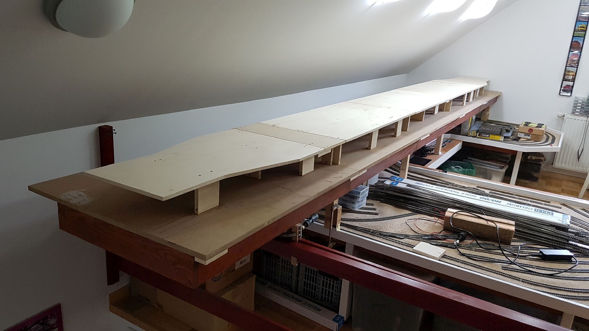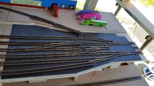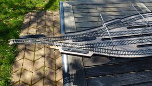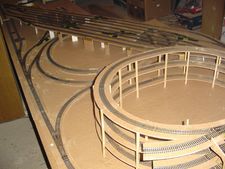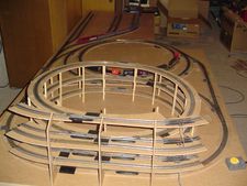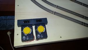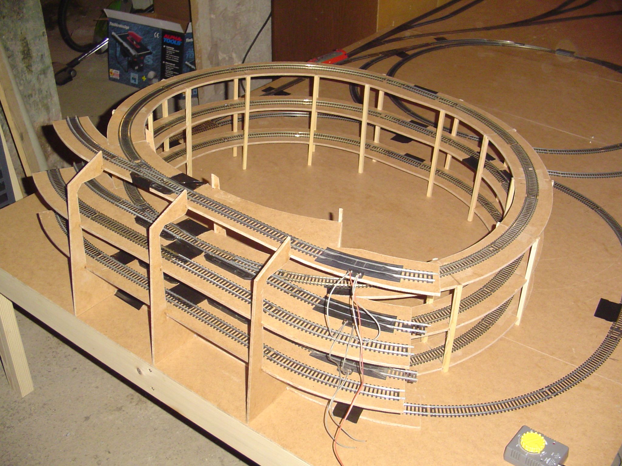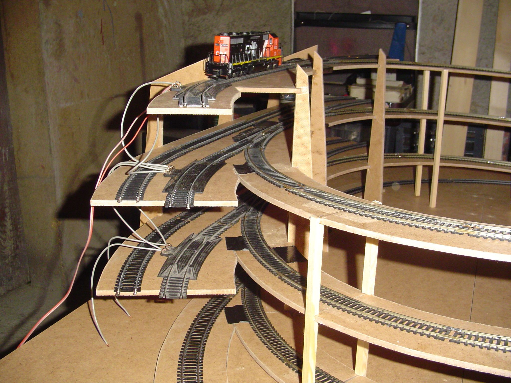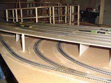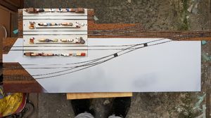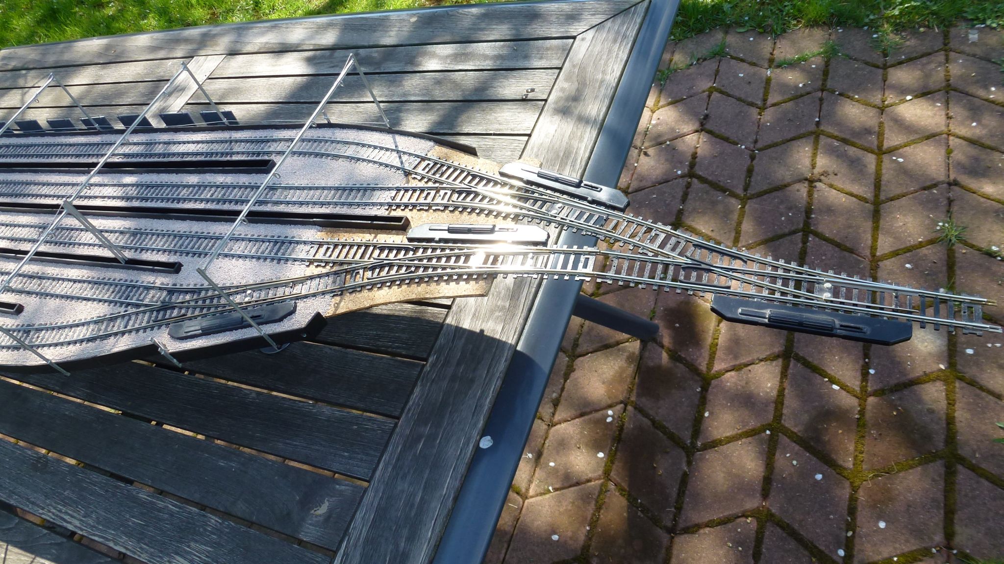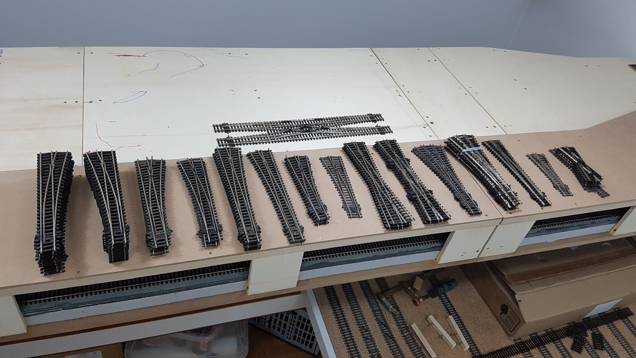 Tu sem za test izdelal lik z kretnicami katerega je namen da iz enega tira, iz obeh smeri pridete na drugega in obratno. To dvojno kretnico sem seveda uporabil kasneje. Izdelava se je nadaljevala z polaganjem tirov na skriti postaji kjer sem uporabil 4 kretnice krmiljene z motorji. Ko je bilo to narejeno sem naredil pokrove te skrite postaje, kateri so pa osnova za module na keterih bodo objekti in bodo seveda premakljivi, torej se bo dalo te module odstraniti zaradi dostopa do skrite postaje.