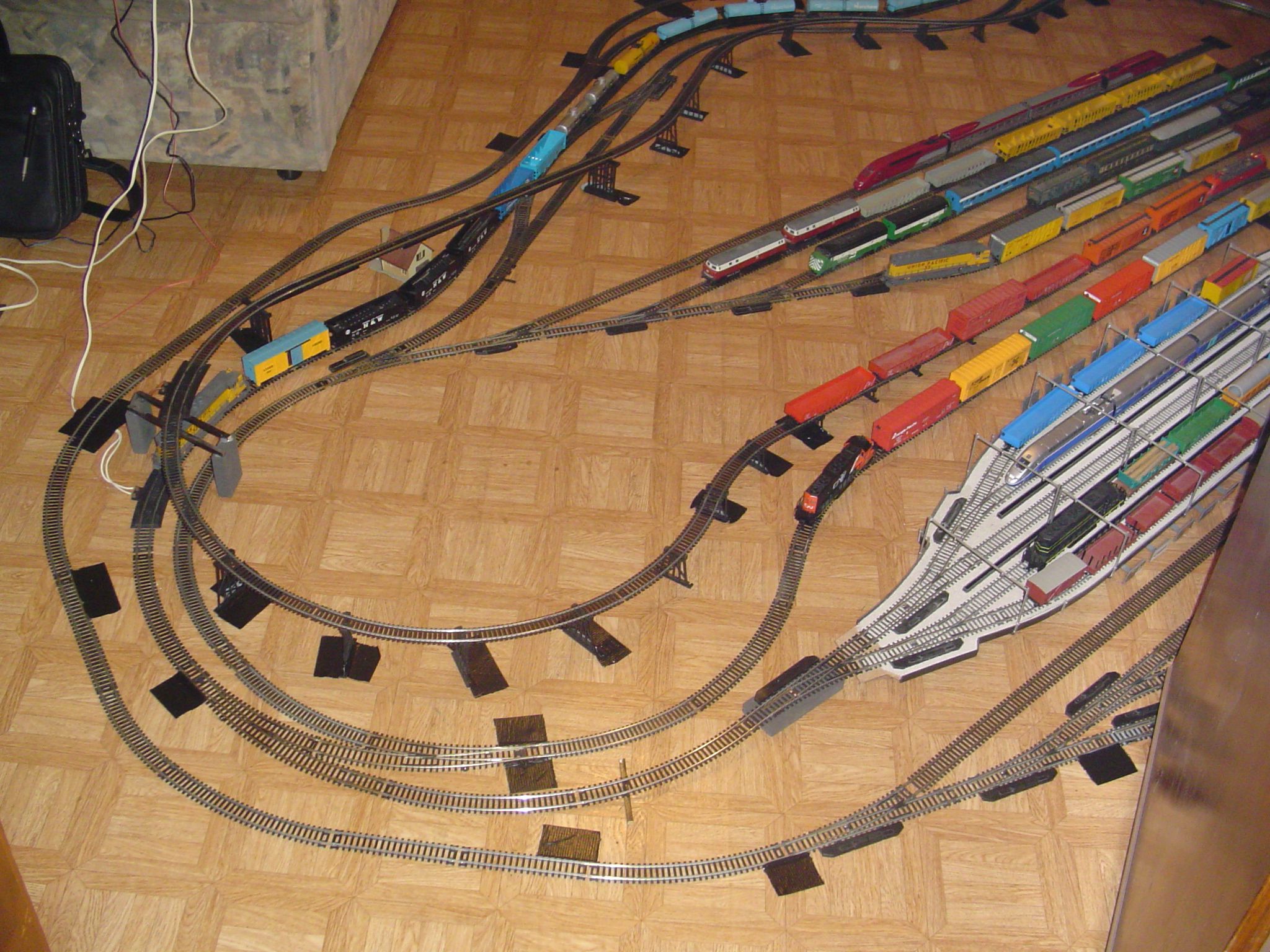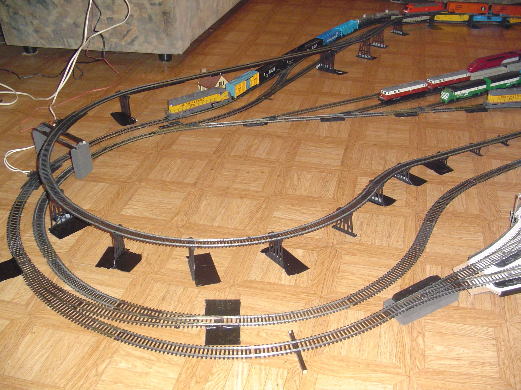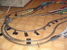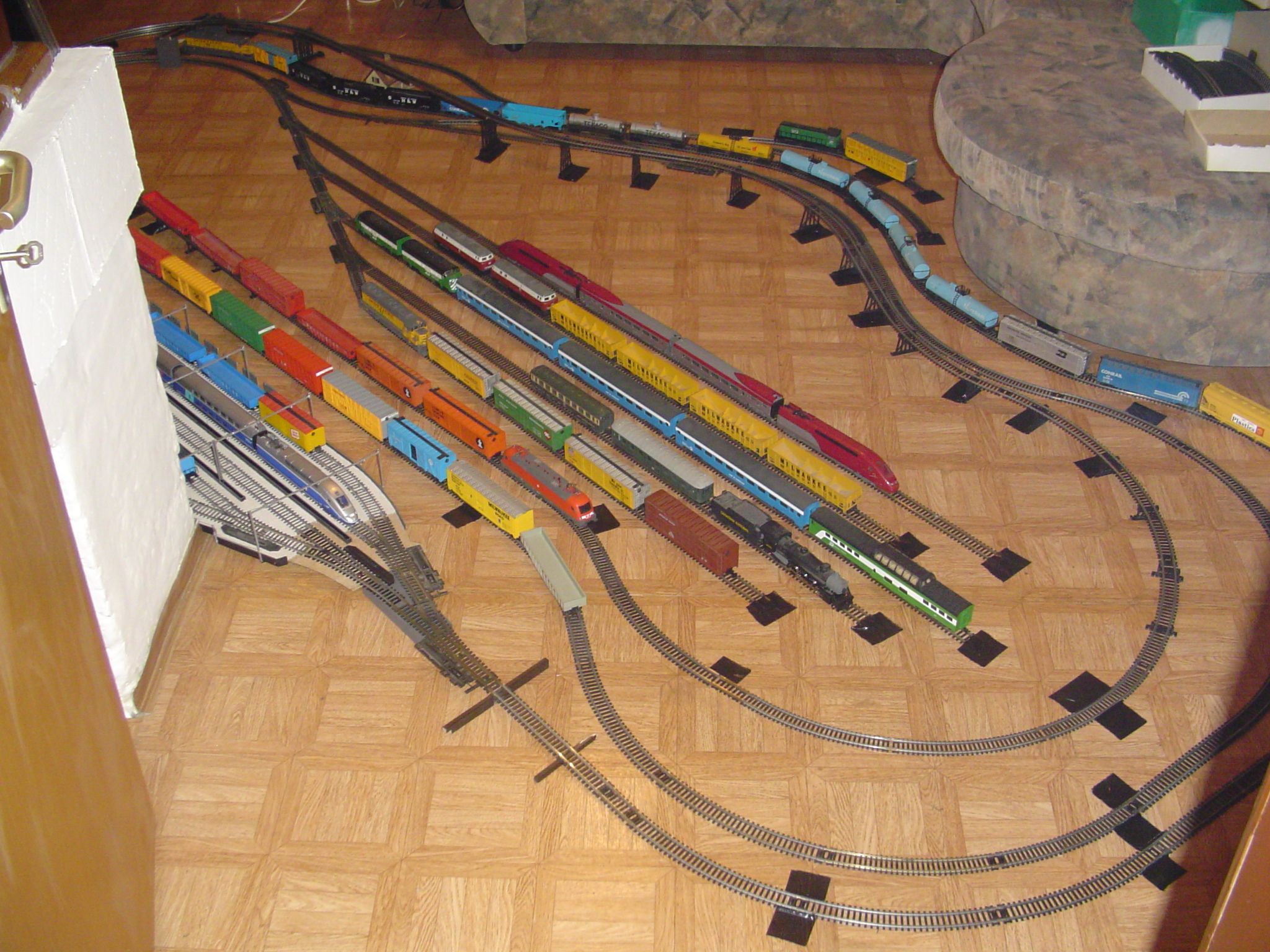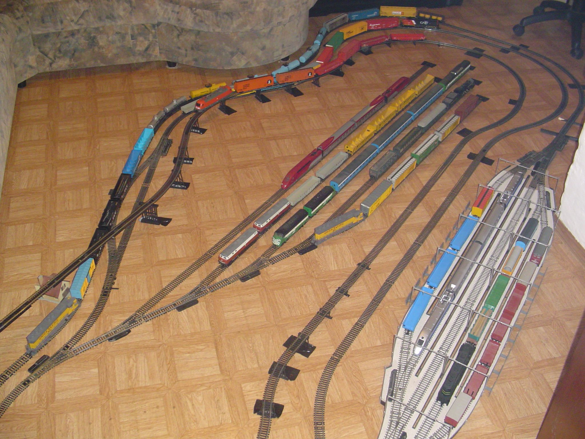 Preden sem začel izdlovati prvo maketo, sem takole sestavil par tirov na tleh dnevne sobe. Tu sem postavil 3 ločene kroge z tremi postajami. Ena je prehodna, druge dve sta slepi. 2 krožni progi gresta po tleh ena proga se pa dviga in seka druge dve, tako malo za popestritev. Tire sem z črnim lepilnim trakom malenkost zalimal na podlago da se niso premikali, in zadeva je perfektno delovala. Tu imam večinoma Mehano tire in vlake. Nekaj malega je še od firme Bachmann (par lokomotiv in vagonov).