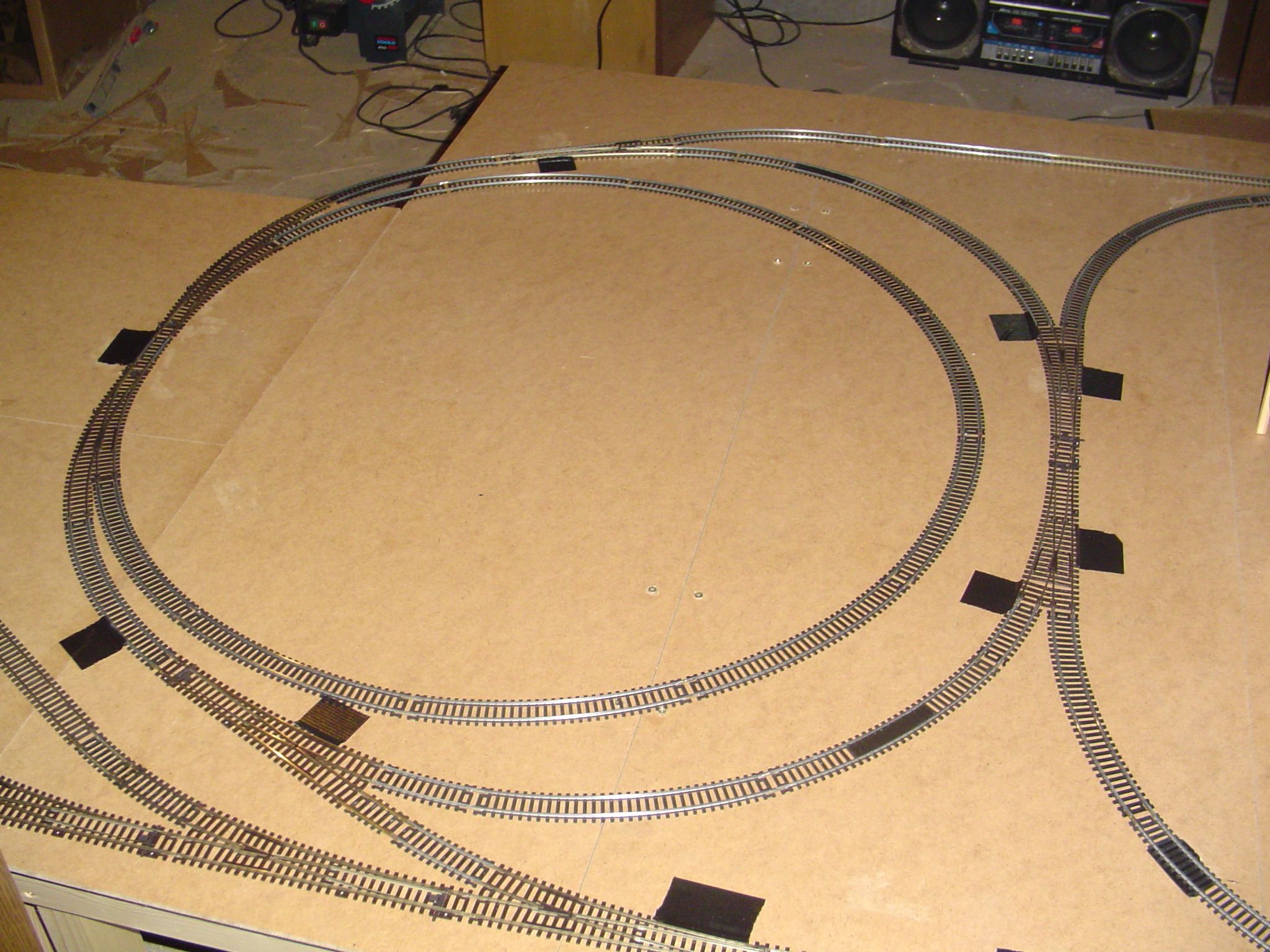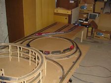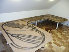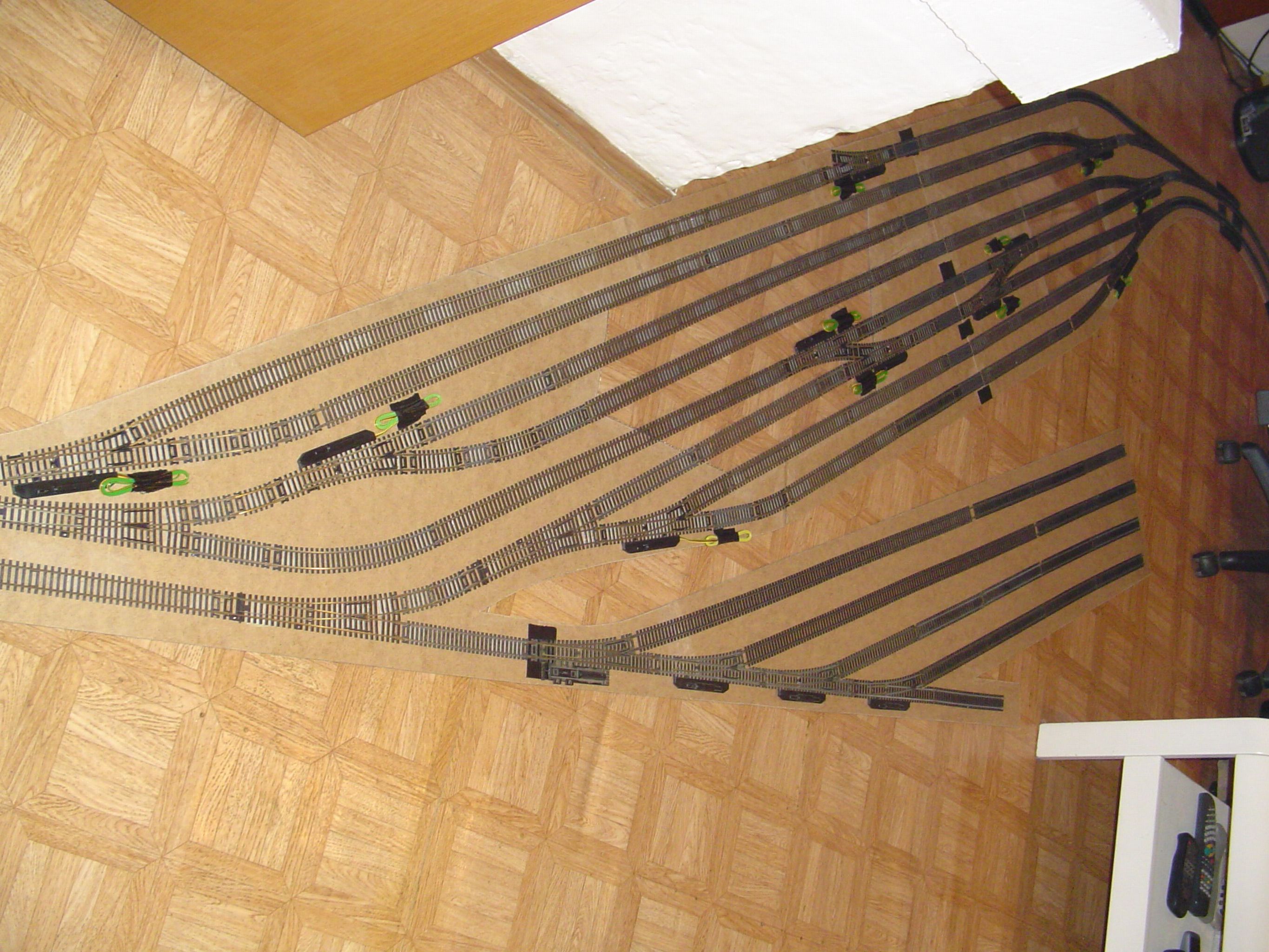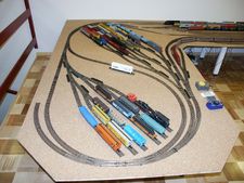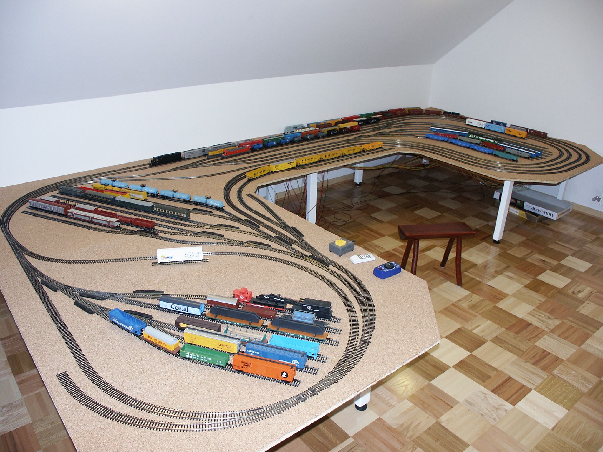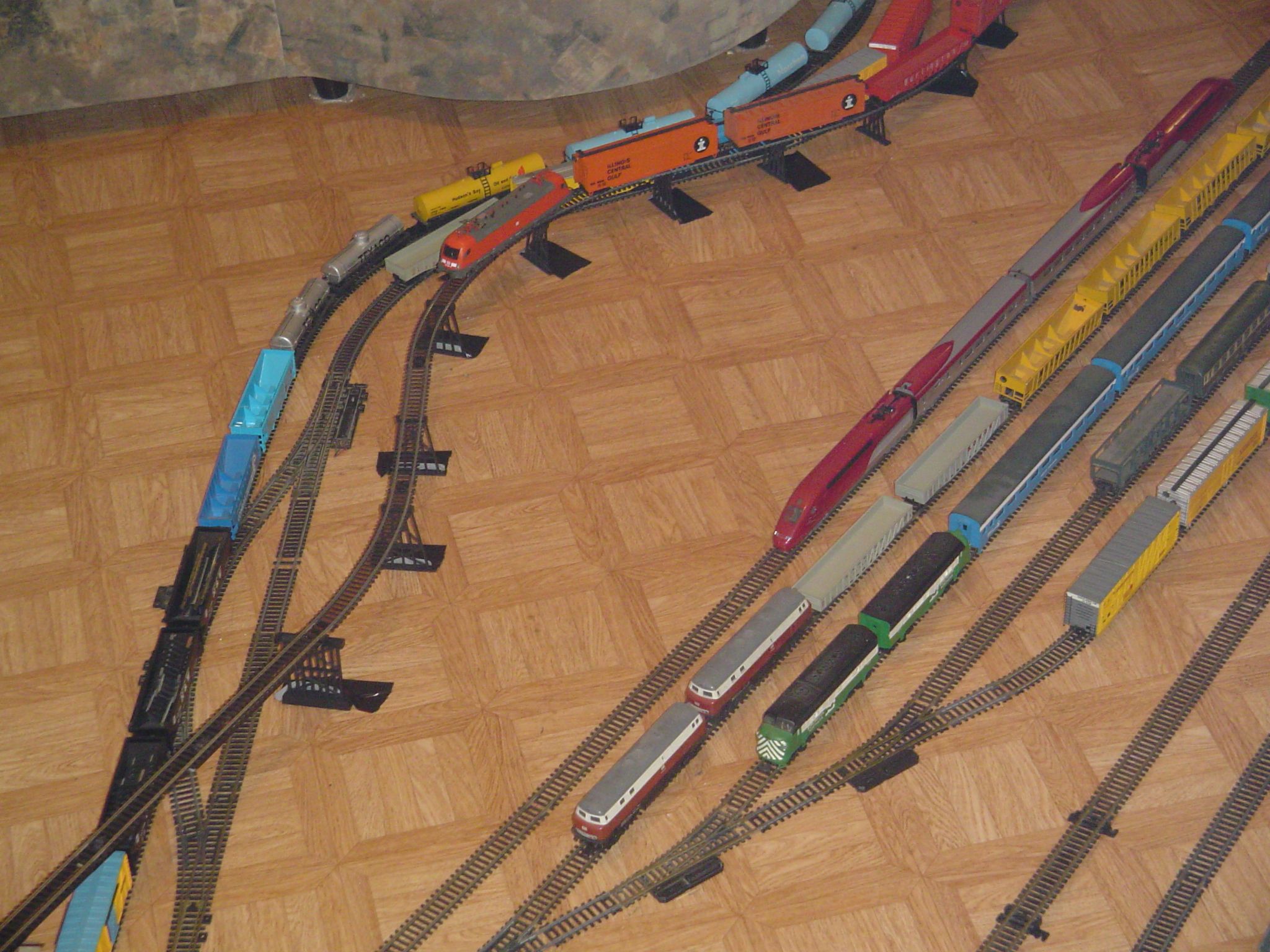Preden sem začel izdlovati prvo maketo, sem takole sestavil par tirov na tleh dnevne sobe. Tu sem postavil 3 ločene kroge z tremi postajami. Ena je prehodna, druge dve sta slepi. 2 krožni progi gresta po tleh ena proga se pa dviga in seka druge dve, tako malo za popestritev. Tire sem z črnim lepilnim trakom malenkost zalimal na podlago da se niso premikali, in zadeva je perfektno delovala. Tu imam večinoma Mehano tire in vlake. Nekaj malega je še od firme Bachmann (par lokomotiv in vagonov).