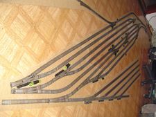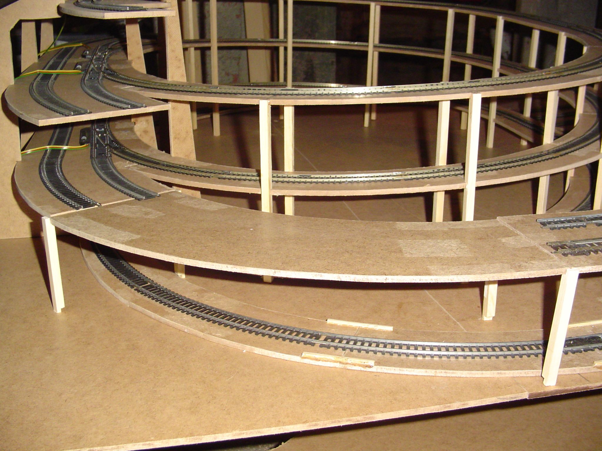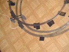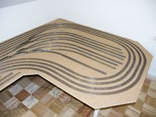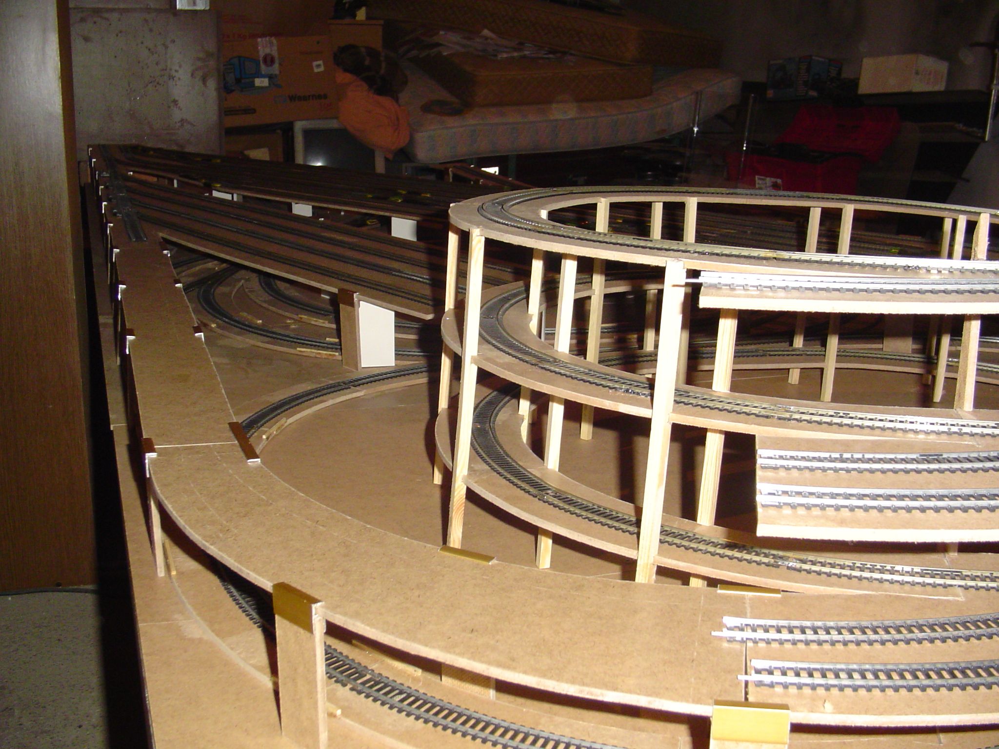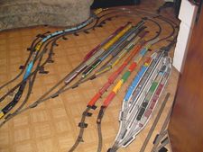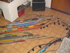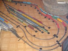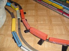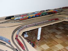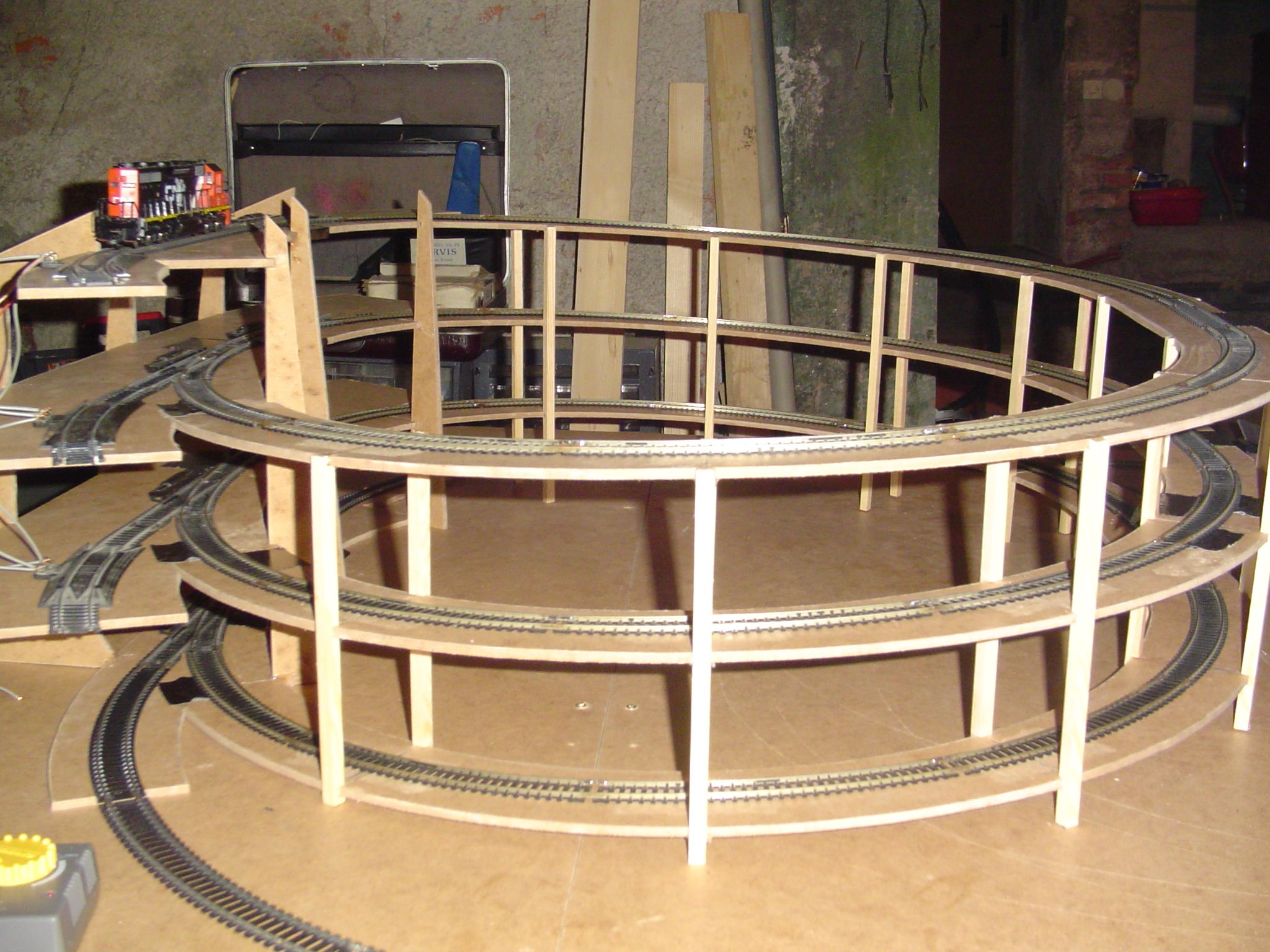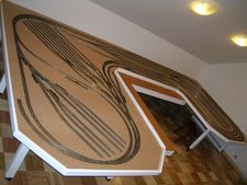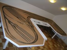 Preden sem začel izdlovati prvo maketo, sem takole sestavil par tirov na tleh dnevne sobe. Tu sem postavil 3 ločene kroge z tremi postajami. Ena je prehodna, druge dve sta slepi. 2 krožni progi gresta po tleh ena proga se pa dviga in seka druge dve, tako malo za popestritev. Tire sem z črnim lepilnim trakom malenkost zalimal na podlago da se niso premikali, in zadeva je perfektno delovala. Tu imam večinoma Mehano tire in vlake. Nekaj malega je še od firme Bachmann (par lokomotiv in vagonov).
