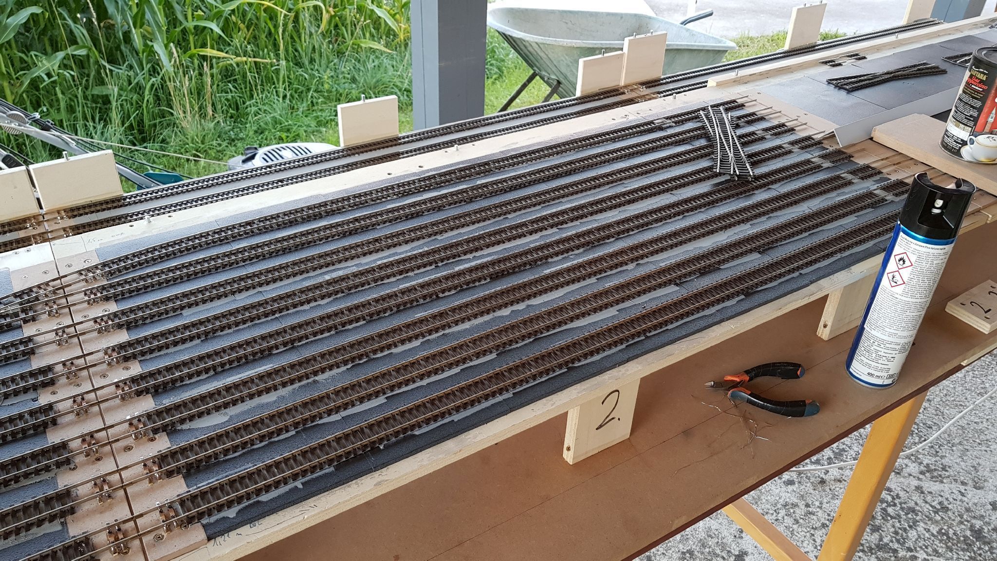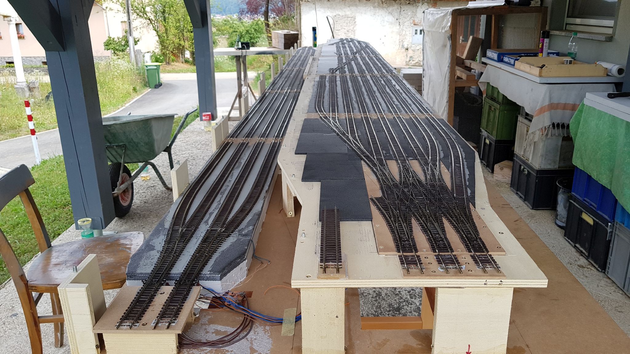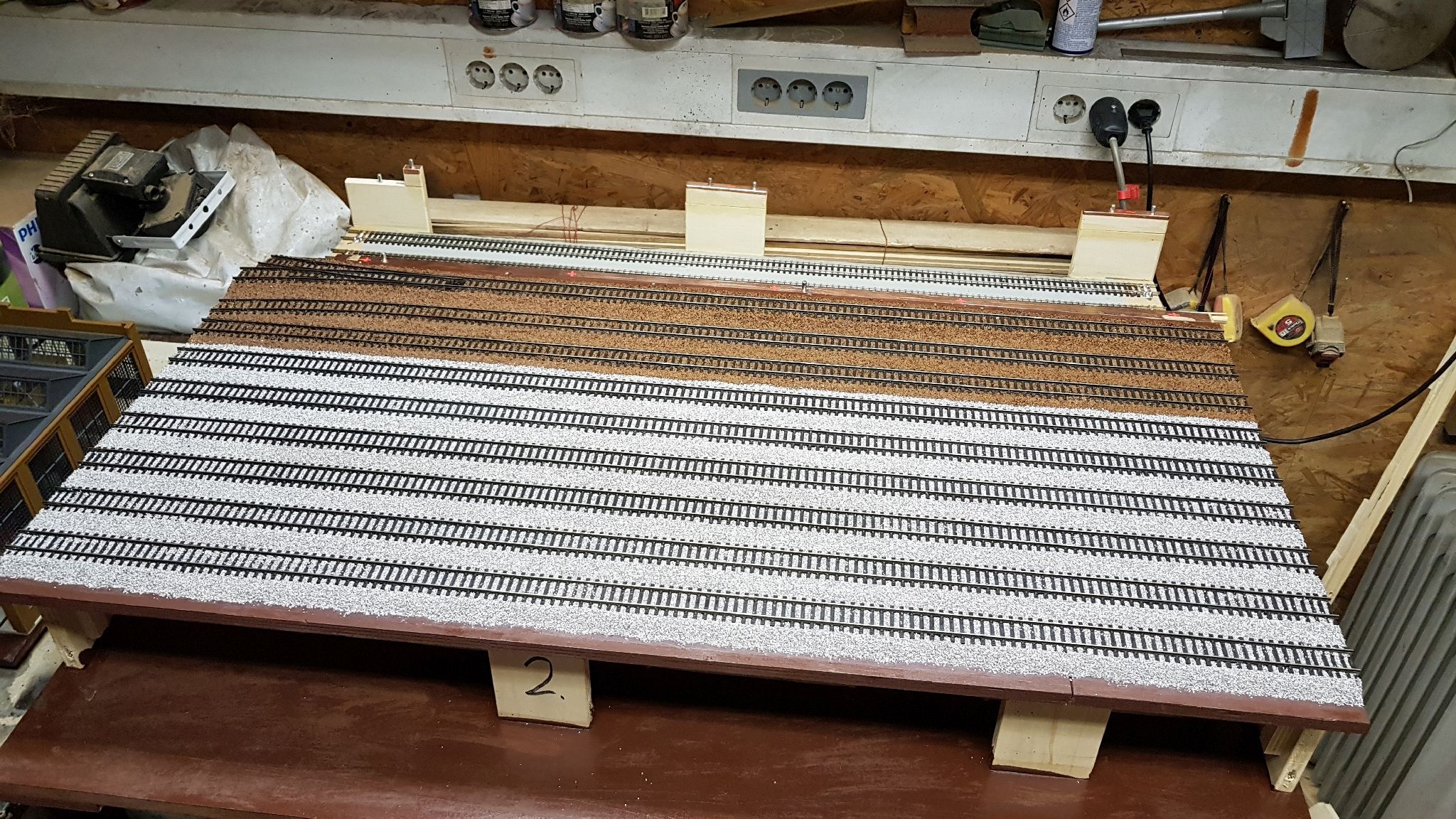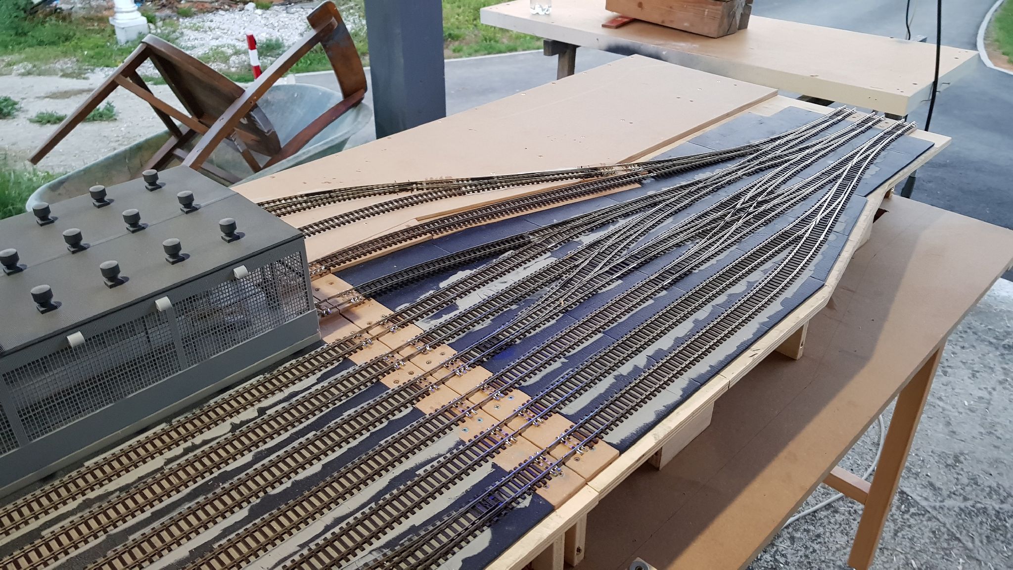 Začetek polaganja glavnih tirov na yardu. Pod njimi je črna pena proizvajalca Woodland, in to je specialna pena katera zadušuje zvok. kasneje sem malo bolje testiral in na tem mestu lahko rečem da ima pluta zelo podobne če ne enake lastnosti, je pa bistveno cenejša. Torej priporočam pluto namesto te drage Woodland pene.