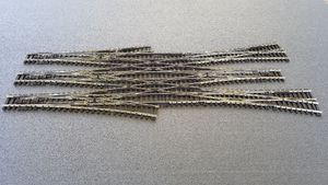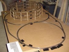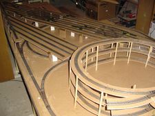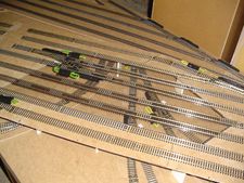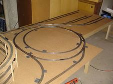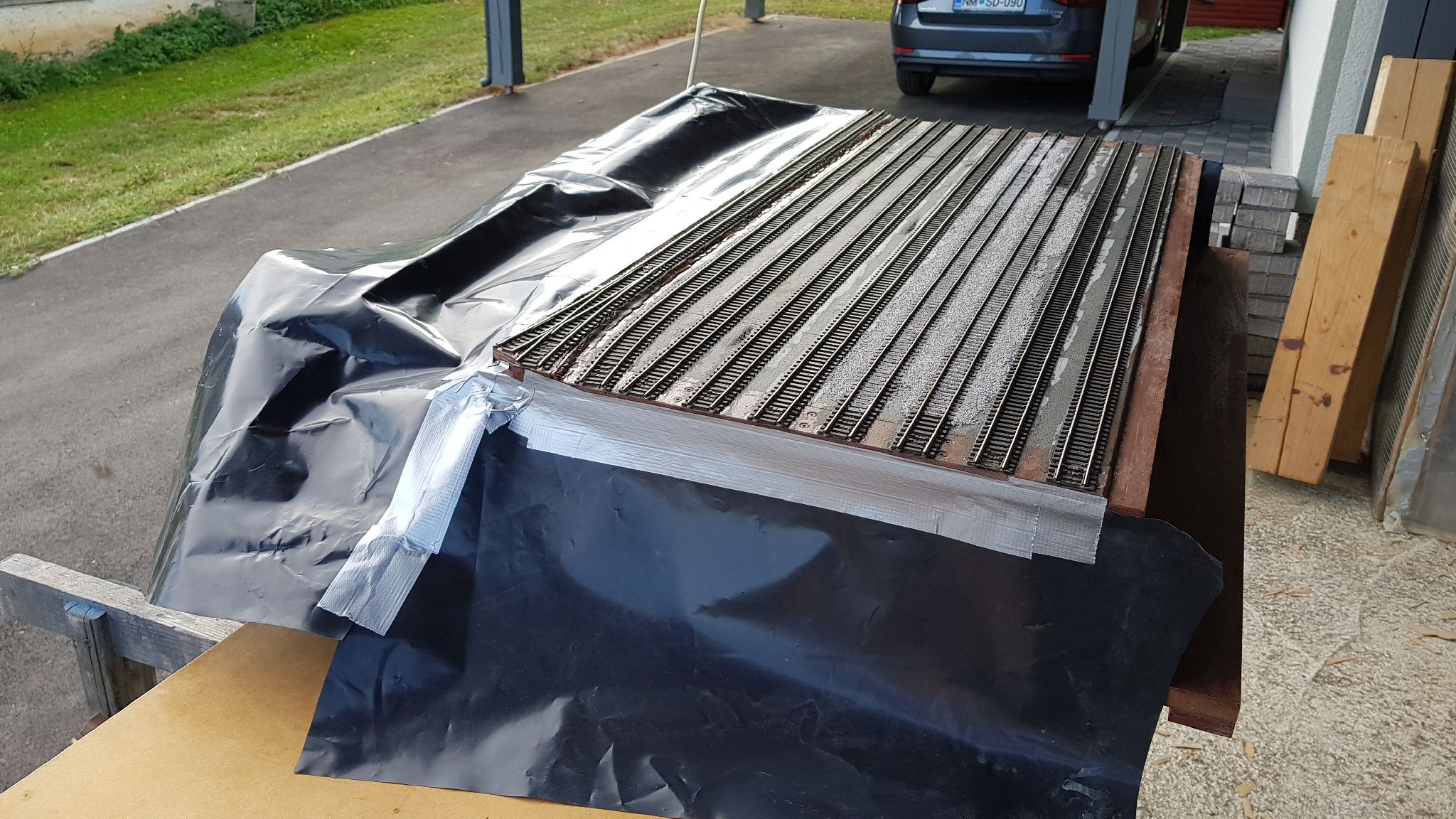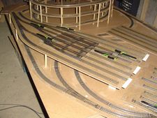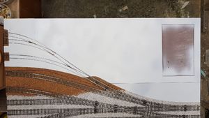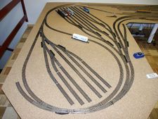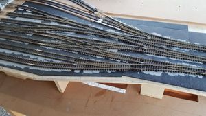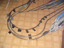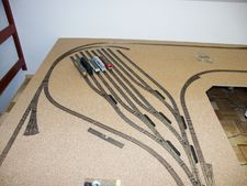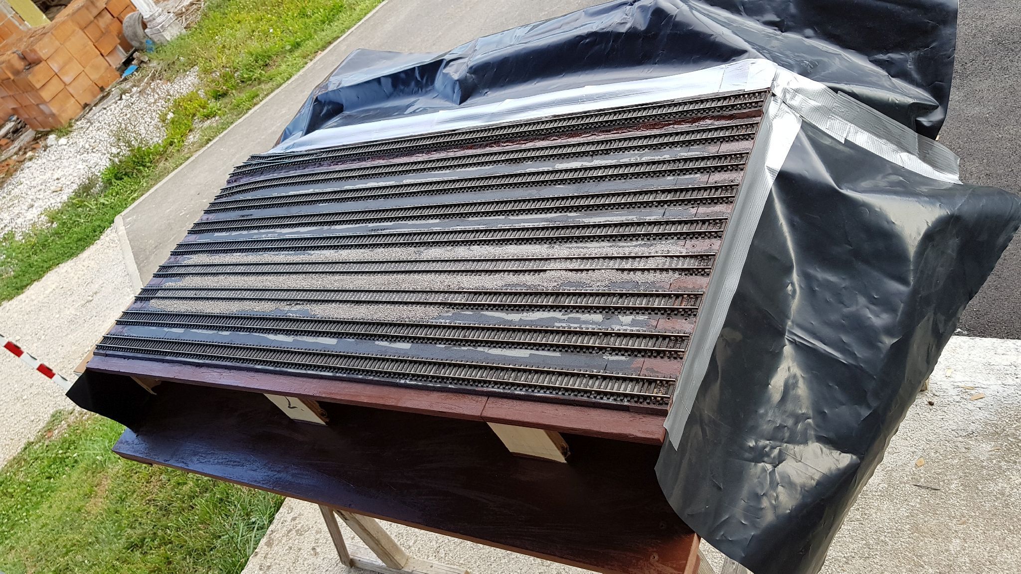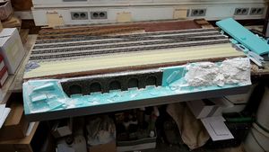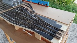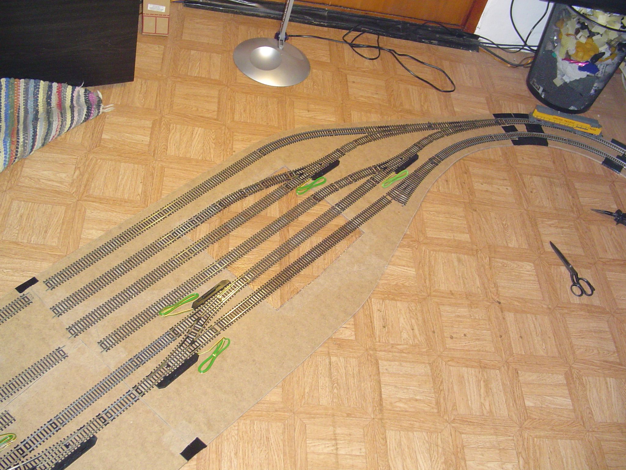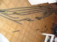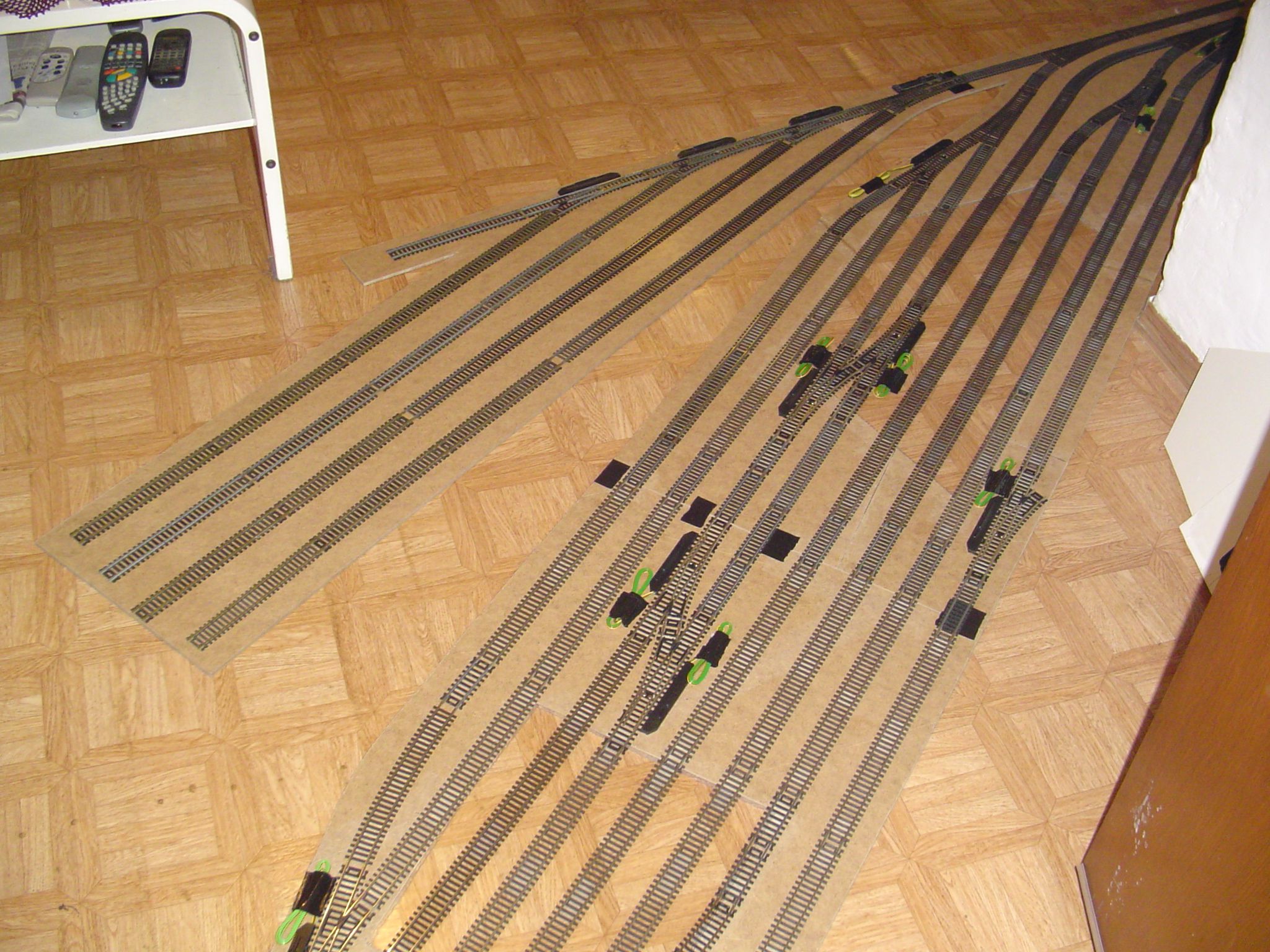 Začetek polaganja glavnih tirov na yardu. Pod njimi je črna pena proizvajalca Woodland, in to je specialna pena katera zadušuje zvok. kasneje sem malo bolje testiral in na tem mestu lahko rečem da ima pluta zelo podobne če ne enake lastnosti, je pa bistveno cenejša. Torej priporočam pluto namesto te drage Woodland pene.