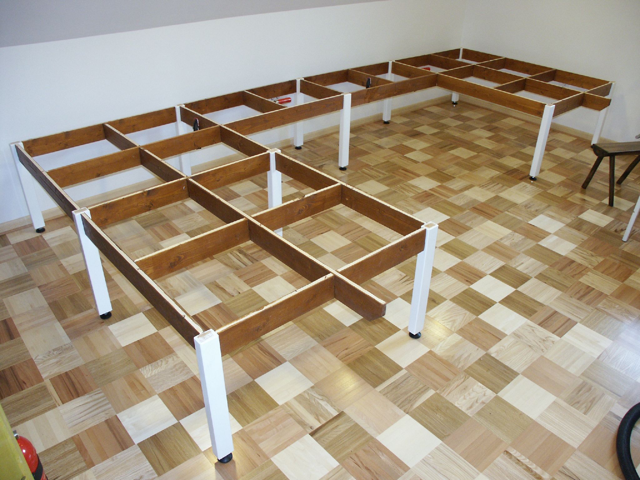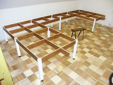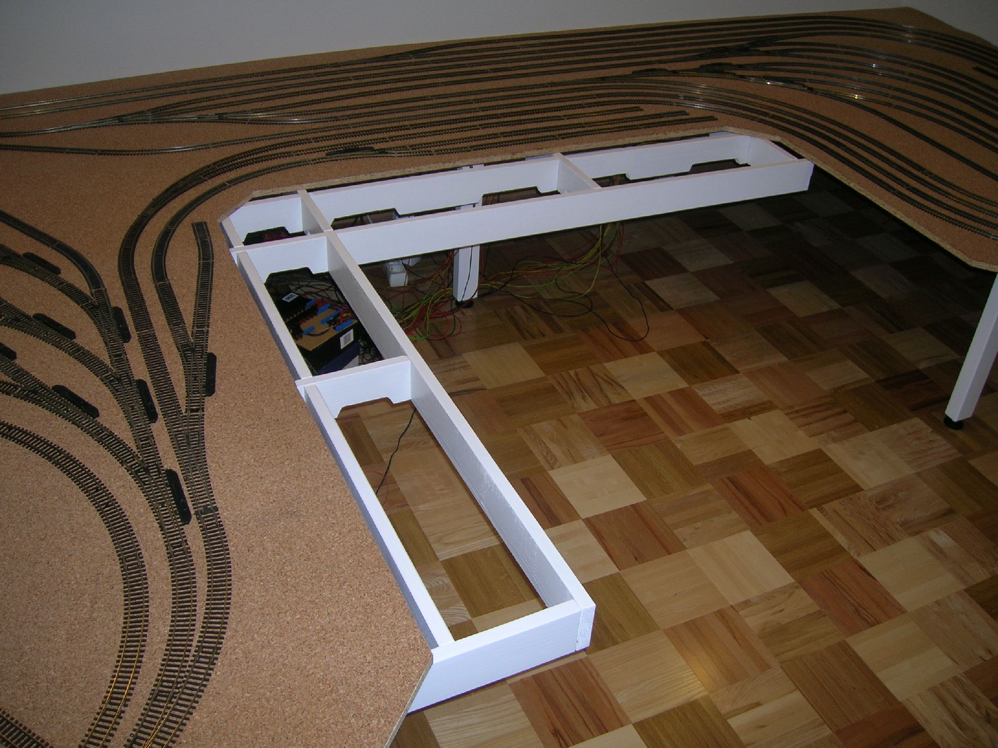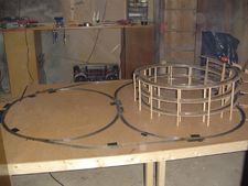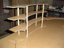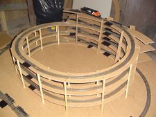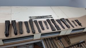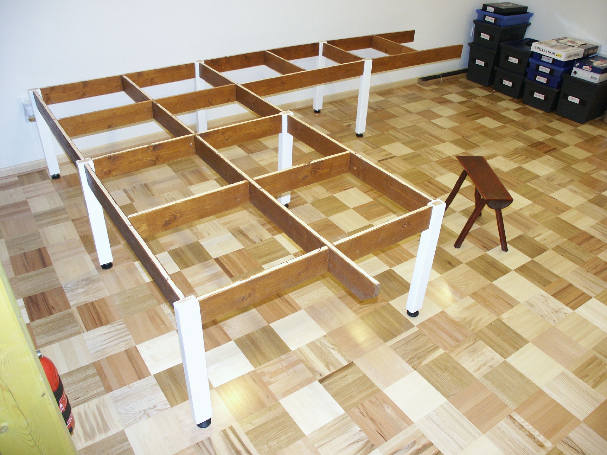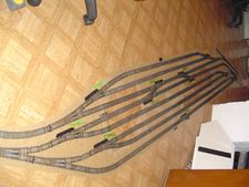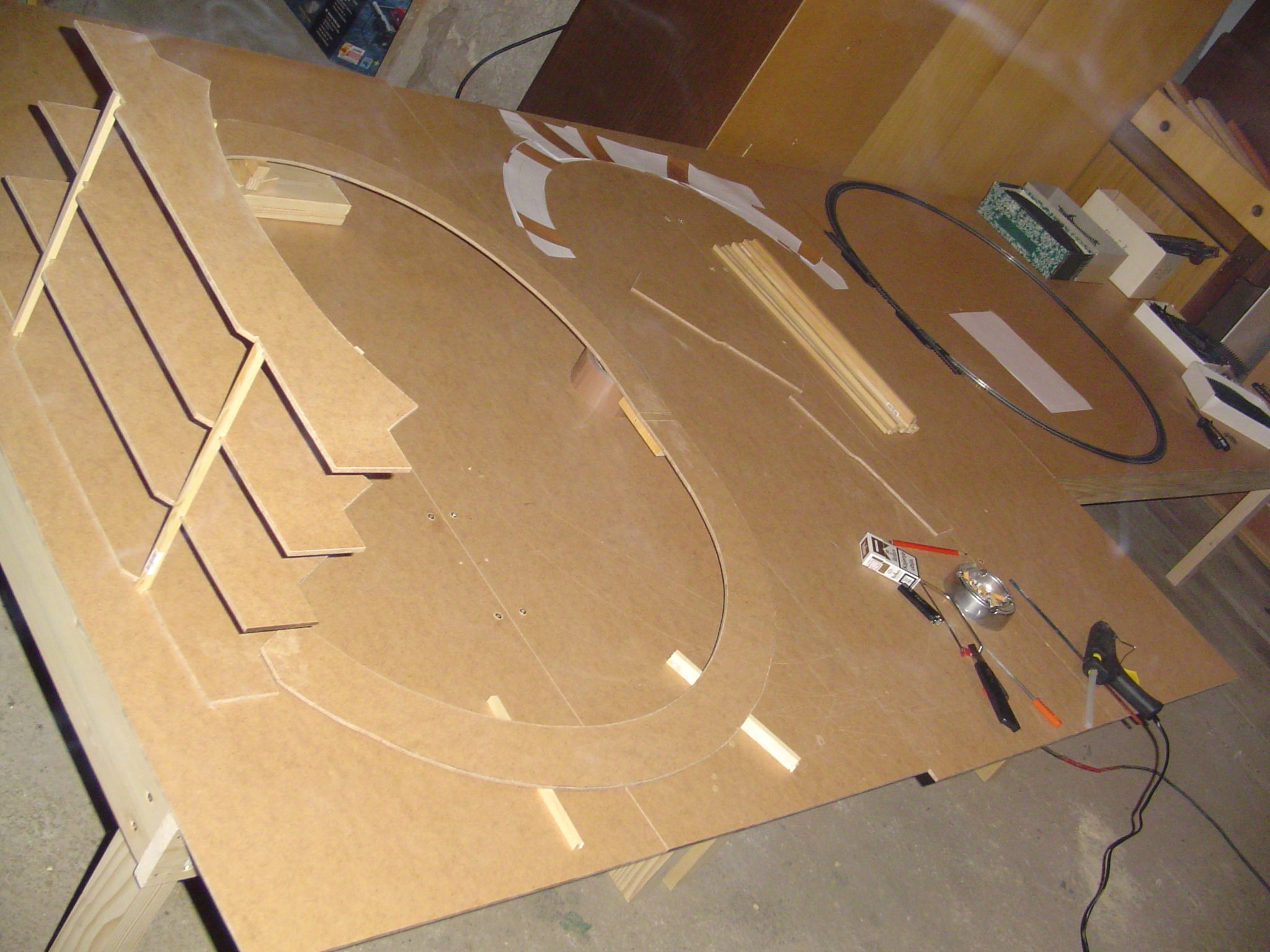 Tu je prikaz sestavljanja okvirjev, kateri se nahajajo na nogah in na teh okvirjih bodo plošče z maketo. Okvirje sem naredil, pobarval in sestavil prvo testno postavitev yarda (postaje)