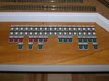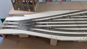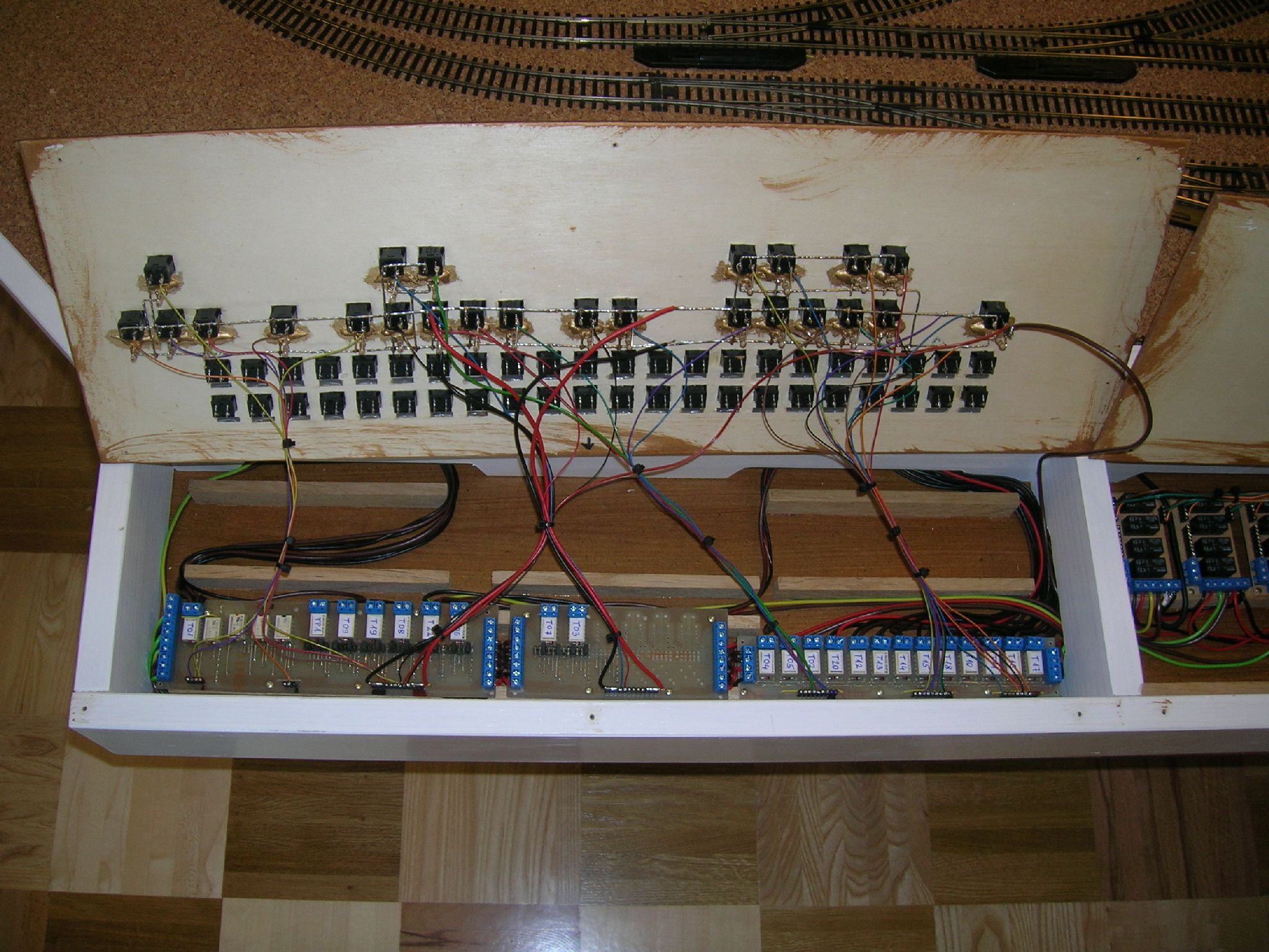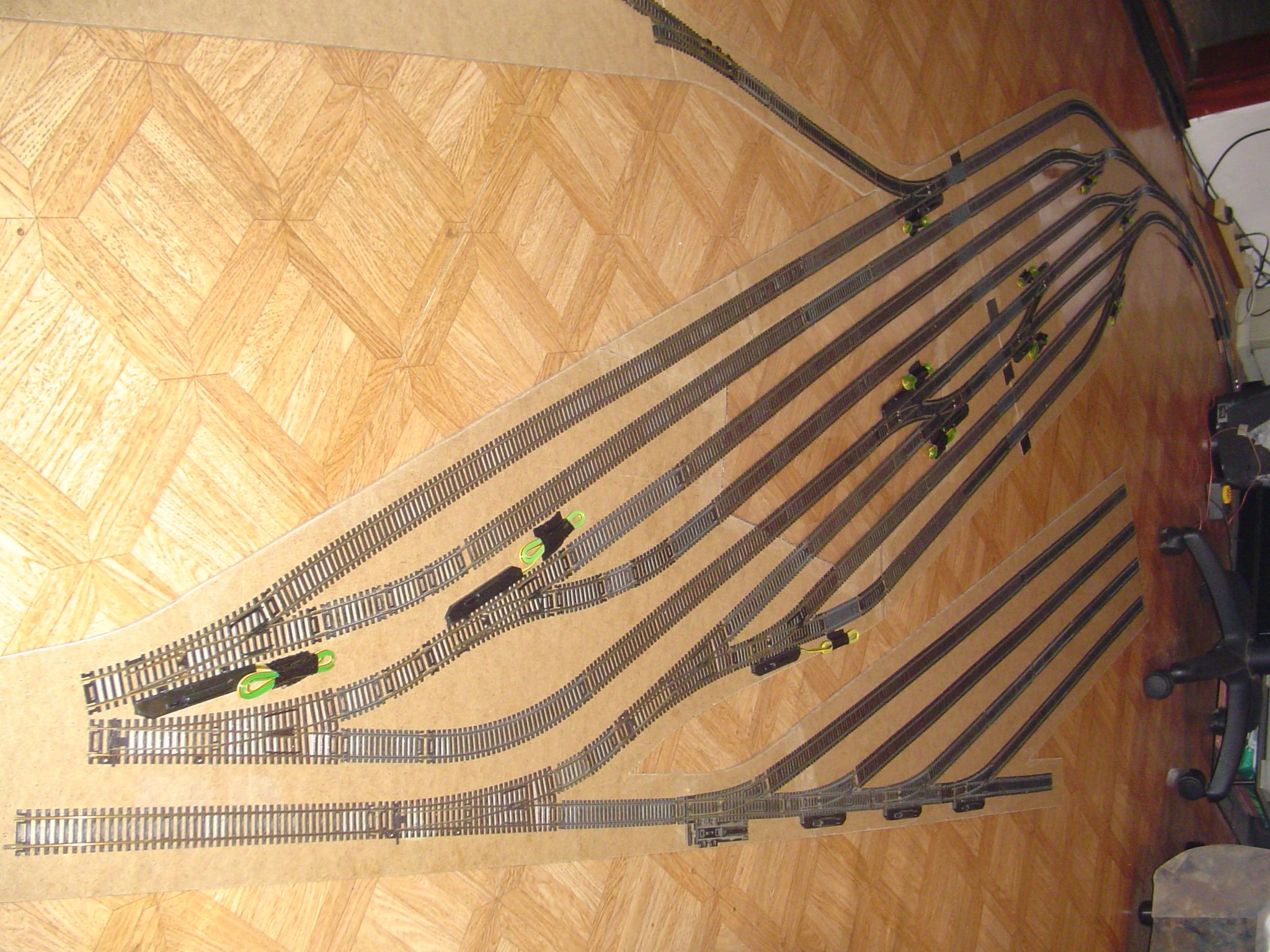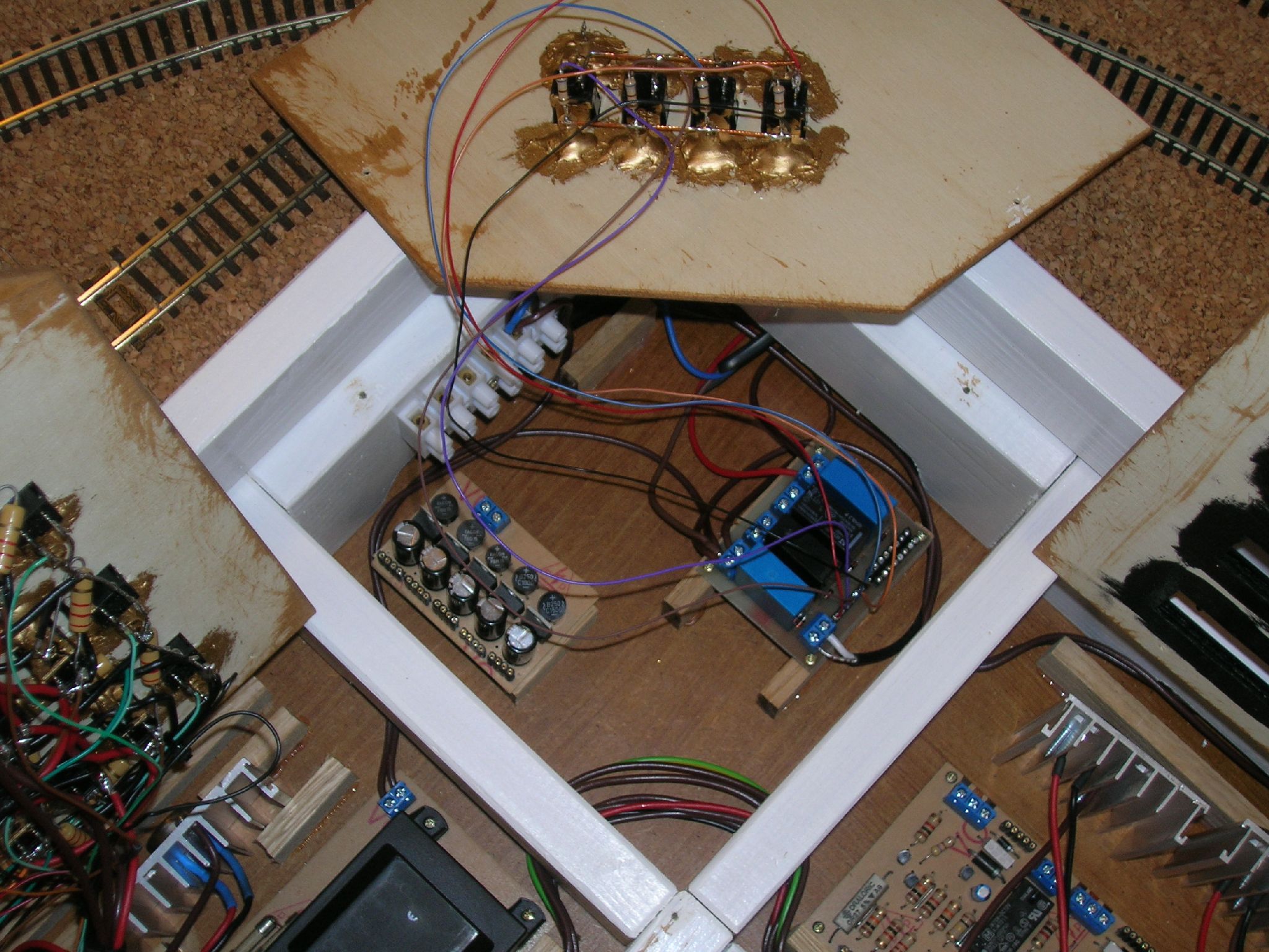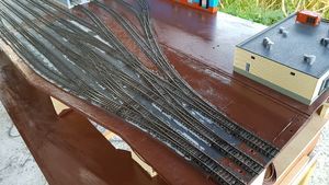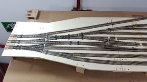 Tu sem izdelal en malo večji kretniški lik. Naredil sem ga iz 4ih trojnih, dveh križnih dvojno premičnih kretnic in dveh navadnih križev. Vse je ElectroFrog, torej srca niso plastična ampak kovinska. Uporaba takih kretnic se v vožnji izkaže za superiorno, toda izdelava je pa bolj kompleksna. Material je od proizvajalca Peco in tudi odmiki med tiri so po Peco specifikacijah torej od sredine do sredine sosednjega tira je natanko 51mm. Zakaj delati kaj takega? Če dobro pogledate so na vstopu v kretnico trije tiri na izstopu jih je pa sedem. Če bi enak rezultat želel doseči z postavitvijo normalnih kretnic bi v dolžino porabil natanko dvakrat toliko. Torej z izdelavo te monster kretnice sem prihranil na dolžini kretnic, torej je sama postaja, oziroma uporabna površina na postaji daljša. Kretnica ima 12 motorjev in 24 stikal za krmiljenje. Vsi motorji so spodaj pod kretnico, torej nič vidnega zgoraj.Vsak motor ima po dva dvopolna stikala. Eden se uporablja za samo delovanje kretnice (ElectroFrog) drugi je pa za signale. Ker bi ročno krmiljenje takega kompleksnega seta kretnic bila nočna mora sem to takoj opustil. Delovanje tega kretničarskega lika bo izvedeno tako, da ne bom krmilil vsake kretnice, oz vsakega motorja posebej, ampak bom s pritiskom na eno tipko krmilil več motorjev hkrati in s tem odpiral in sklepal določene rute - poti. Vsega skupaj je tu 17 rut, torej bo krmiljenje enostavneje in s pritiskom na eno tipko se sklene ena pot. Dodal bom tudi tipko default, to je kot nek reset, da se trije vstopni tiri povežejo direktno naravnost. Elektronika pod kretnico ni nič posebnega, enostavna diodna mreža skrbi da vsaka tipka požene samo določene motorje v določeno smer. Ikebane žic se pa na žalost nisem mogel ogniti :) Tale postavitev se je izkazala na koncu, v uporabi kot odlična rešitev in jo priporočam ima pa samo eno pomankljivost. peco motorji namreč so zelo potratni glede uporabe električne energije. Delujejo na 16V in ko je motor dejaven zna porabiti tudi do 2A elektrike, v popvprečju pa malo čez 1A. To niti ni toliko toda če pa na enkrat poženete 12 motorjev se pa skupna poraba zelo približa 20A kar je na koncu pomenilo da sem za ta kretničarski lik pod maketo priklopil poseben 16V 20A toroidni transformator ki krmili samo to in nič drugega. Na tem mestu moram poudariti da sem na vsak košček tira znotraj kretnice pripeljal tirno napajanje tako da nič ni odvisno od samih spojk (katere sem pa tudi na koncu vse zalotal skupaj z tiri). Zadeva se je izkazala kot odlična, stabilna in lahka za uporabo. Potrebno je edino vedeti katera tipka krmili katero ruto to sem pa rešil z mini displayem na prednji krmilni plošči pod maketo.