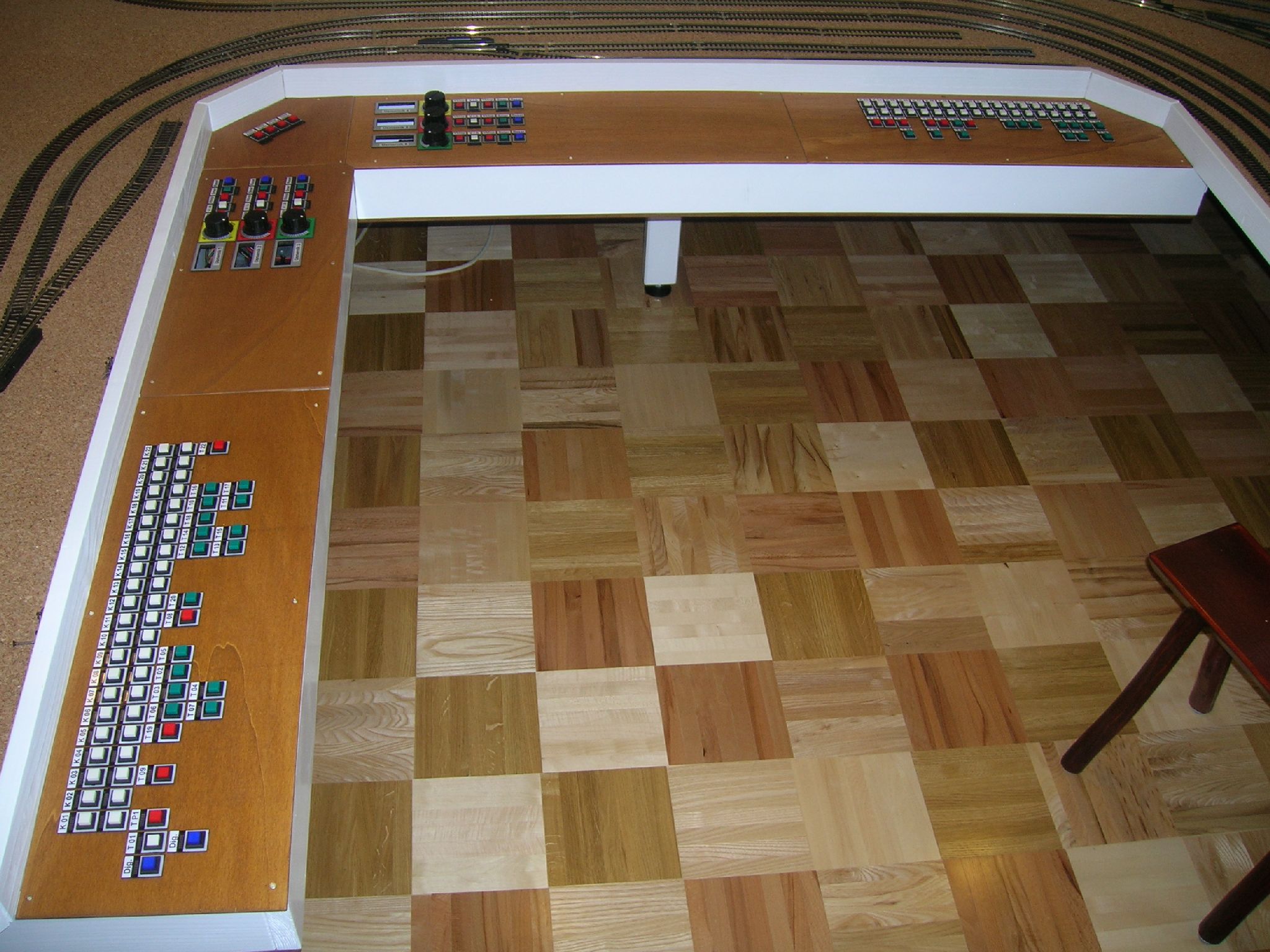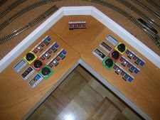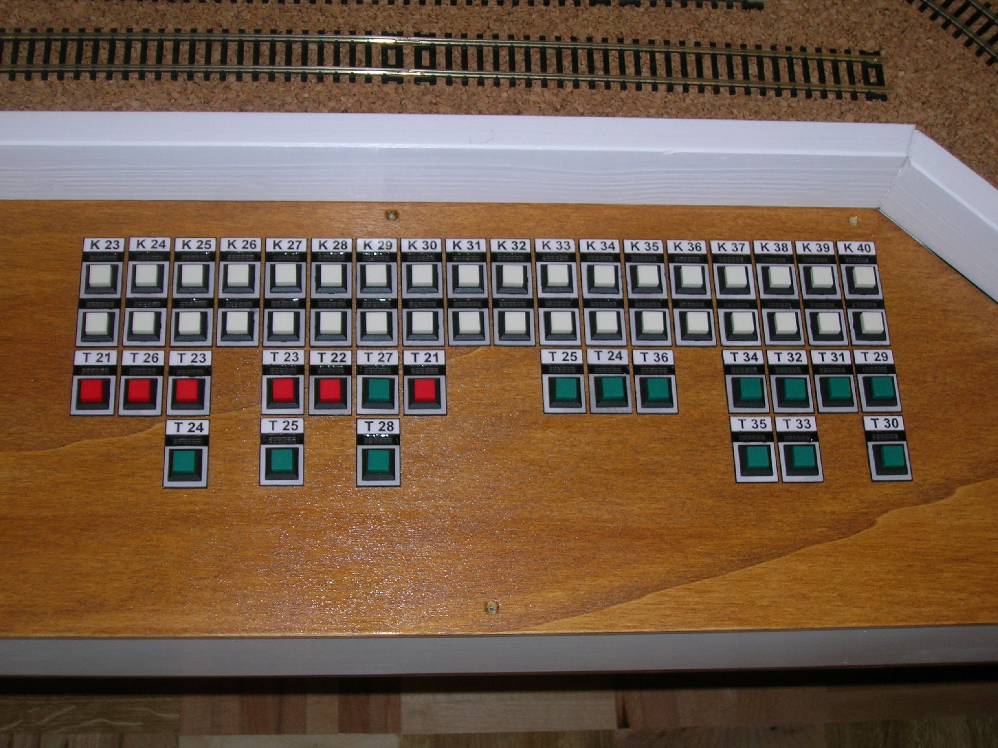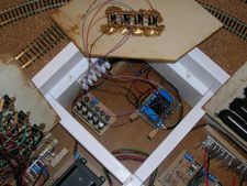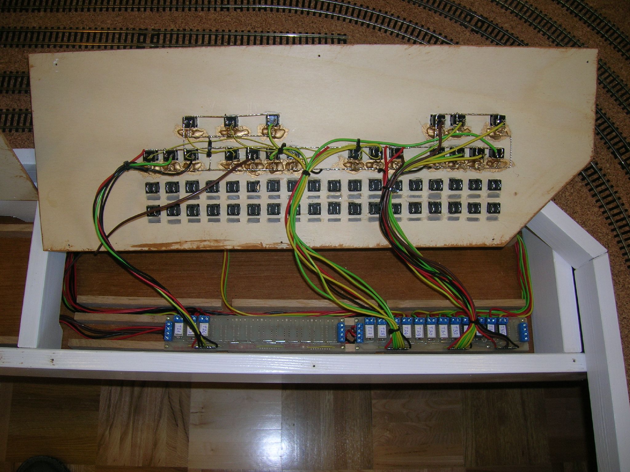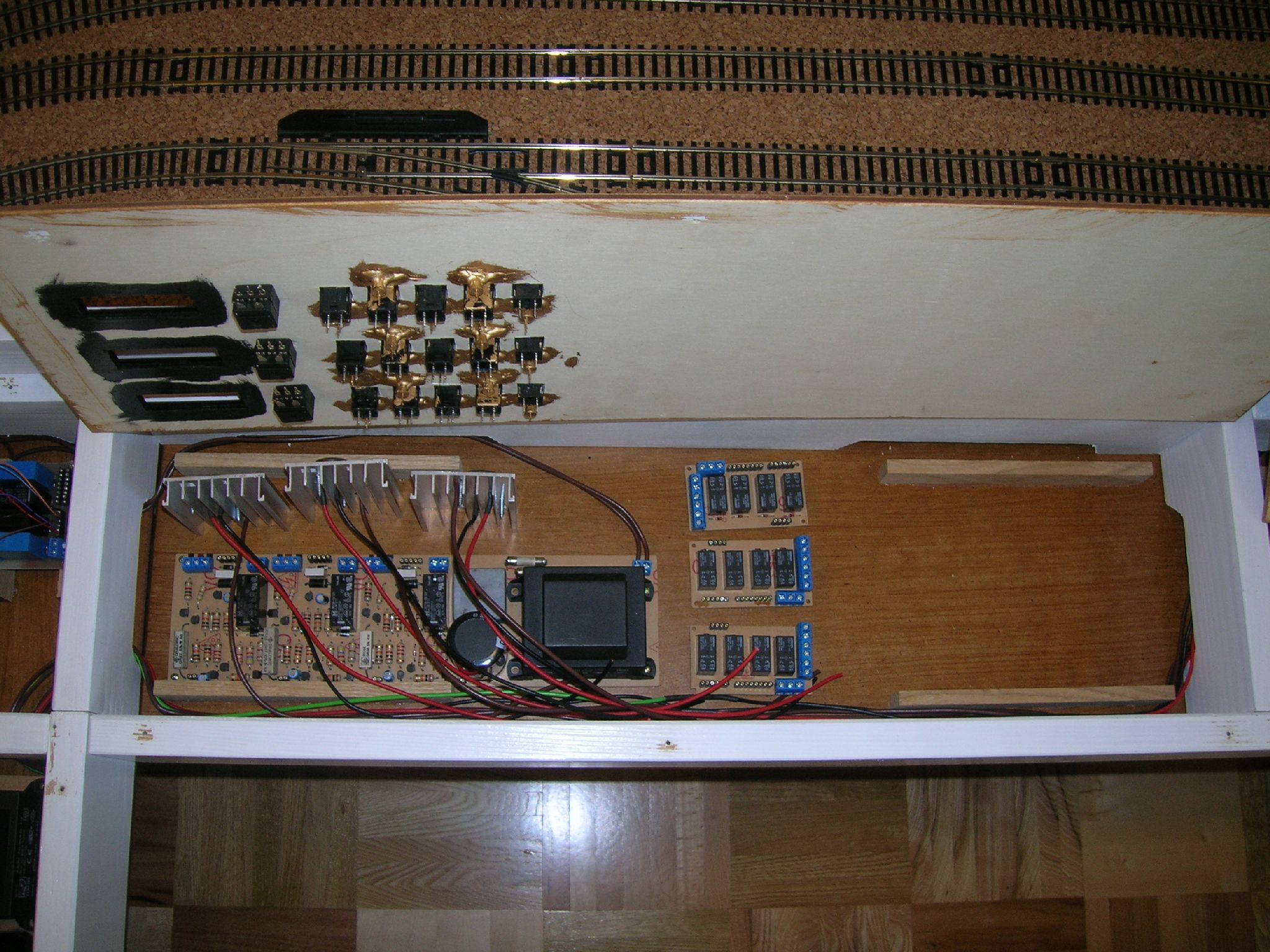 Tu sem izdelal en malo večji kretniški lik. Naredil sem ga iz 4ih trojnih, dveh križnih dvojno premičnih kretnic in dveh navadnih križev. Vse je ElectroFrog, torej srca niso plastična ampak kovinska. Uporaba takih kretnic se v vožnji izkaže za superiorno, toda izdelava je pa bolj kompleksna. Material je od proizvajalca Peco in tudi odmiki med tiri so po Peco specifikacijah torej od sredine do sredine sosednjega tira je natanko 51mm. Zakaj delati kaj takega? Če dobro pogledate so na vstopu v kretnico trije tiri na izstopu jih je pa sedem. Če bi enak rezultat želel doseči z postavitvijo normalnih kretnic bi v dolžino porabil natanko dvakrat toliko. Torej z izdelavo te monster kretnice sem prihranil na dolžini kretnic, torej je sama postaja, oziroma uporabna površina na postaji daljša. Kretnica ima 12 motorjev in 24 stikal za krmiljenje. Vsi motorji so spodaj pod kretnico, torej nič vidnega zgoraj.Vsak motor ima po dva dvopolna stikala. Eden se uporablja za samo delovanje kretnice (ElectroFrog) drugi je pa za signale. Ker bi ročno krmiljenje takega kompleksnega seta kretnic bila nočna mora sem to takoj opustil. Delovanje tega kretničarskega lika bo izvedeno tako, da ne bom krmilil vsake kretnice, oz vsakega motorja posebej, ampak bom s pritiskom na eno tipko krmilil več motorjev hkrati in s tem odpiral in sklepal določene rute - poti. Vsega skupaj je tu 17 rut, torej bo krmiljenje enostavneje in s pritiskom na eno tipko se sklene ena pot. Dodal bom tudi tipko default, to je kot nek reset, da se trije vstopni tiri povežejo direktno naravnost. Elektronika pod kretnico ni nič posebnega, enostavna diodna mreža skrbi da vsaka tipka požene samo določene motorje v določeno smer. Ikebane žic se pa na žalost nisem mogel ogniti :) Tale postavitev se je izkazala na koncu, v uporabi kot odlična rešitev in jo priporočam ima pa samo eno pomankljivost. peco motorji namreč so zelo potratni glede uporabe električne energije. Delujejo na 16V in ko je motor dejaven zna porabiti tudi do 2A elektrike, v popvprečju pa malo čez 1A. To niti ni toliko toda če pa na enkrat poženete 12 motorjev se pa skupna poraba zelo približa 20A kar je na koncu pomenilo da sem za ta kretničarski lik pod maketo priklopil poseben 16V 20A toroidni transformator ki krmili samo to in nič drugega. Na tem mestu moram poudariti da sem na vsak košček tira znotraj kretnice pripeljal tirno napajanje tako da nič ni odvisno od samih spojk (katere sem pa tudi na koncu vse zalotal skupaj z tiri). Zadeva se je izkazala kot odlična, stabilna in lahka za uporabo. Potrebno je edino vedeti katera tipka krmili katero ruto to sem pa rešil z mini displayem na prednji krmilni plošči pod maketo.