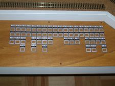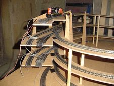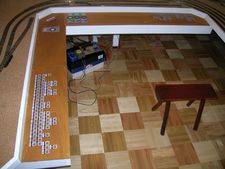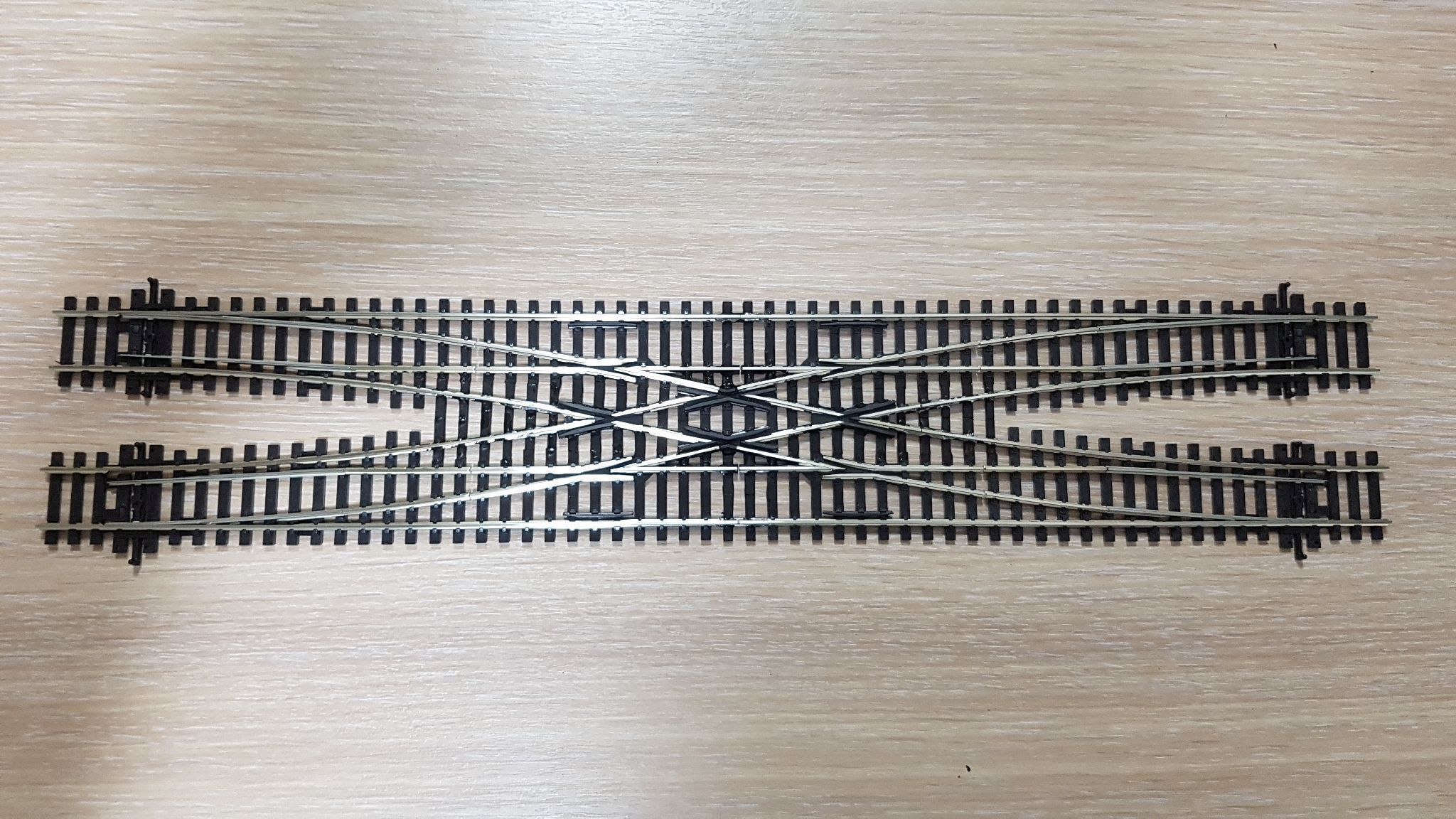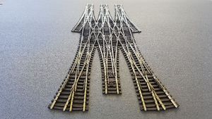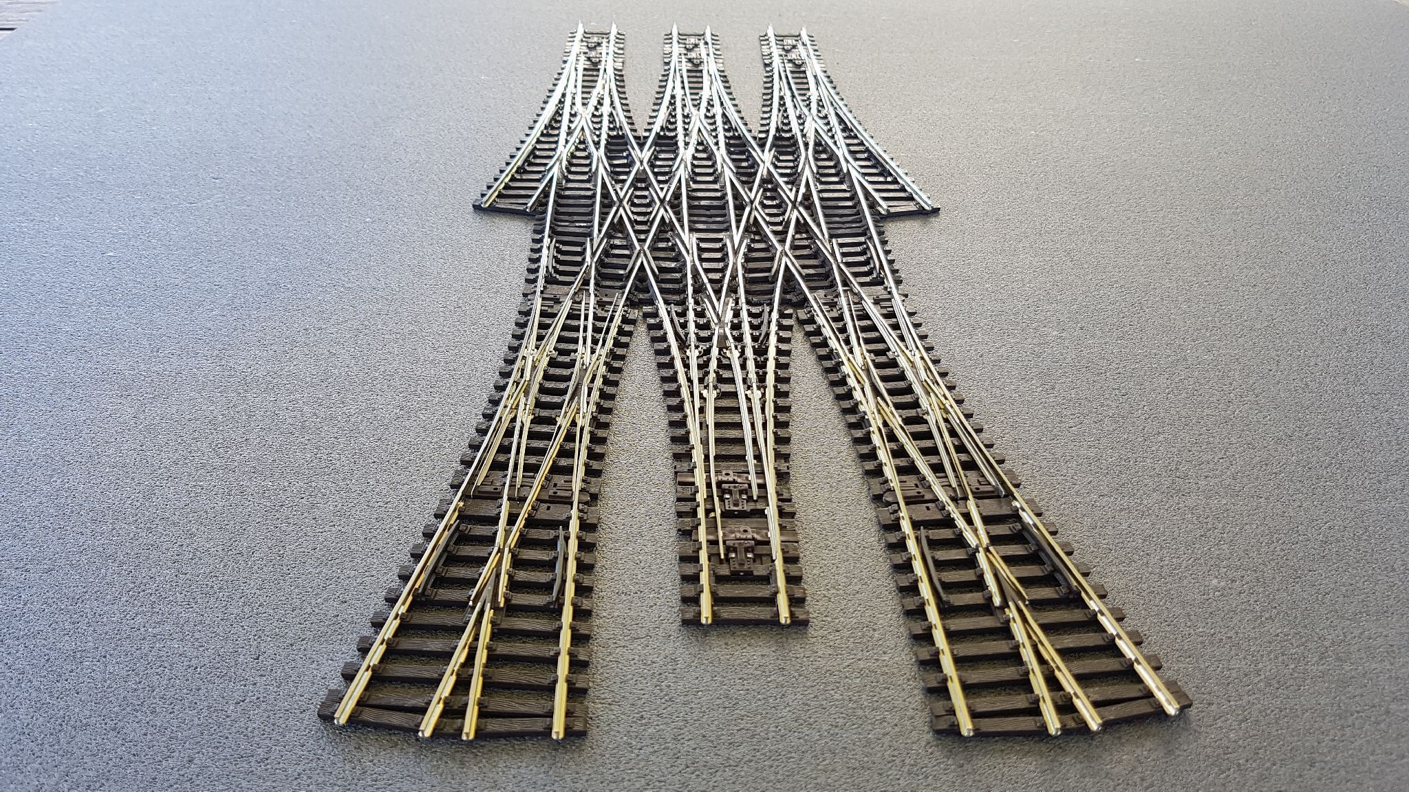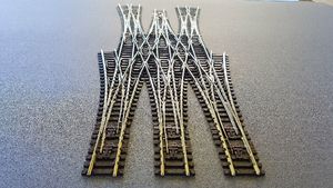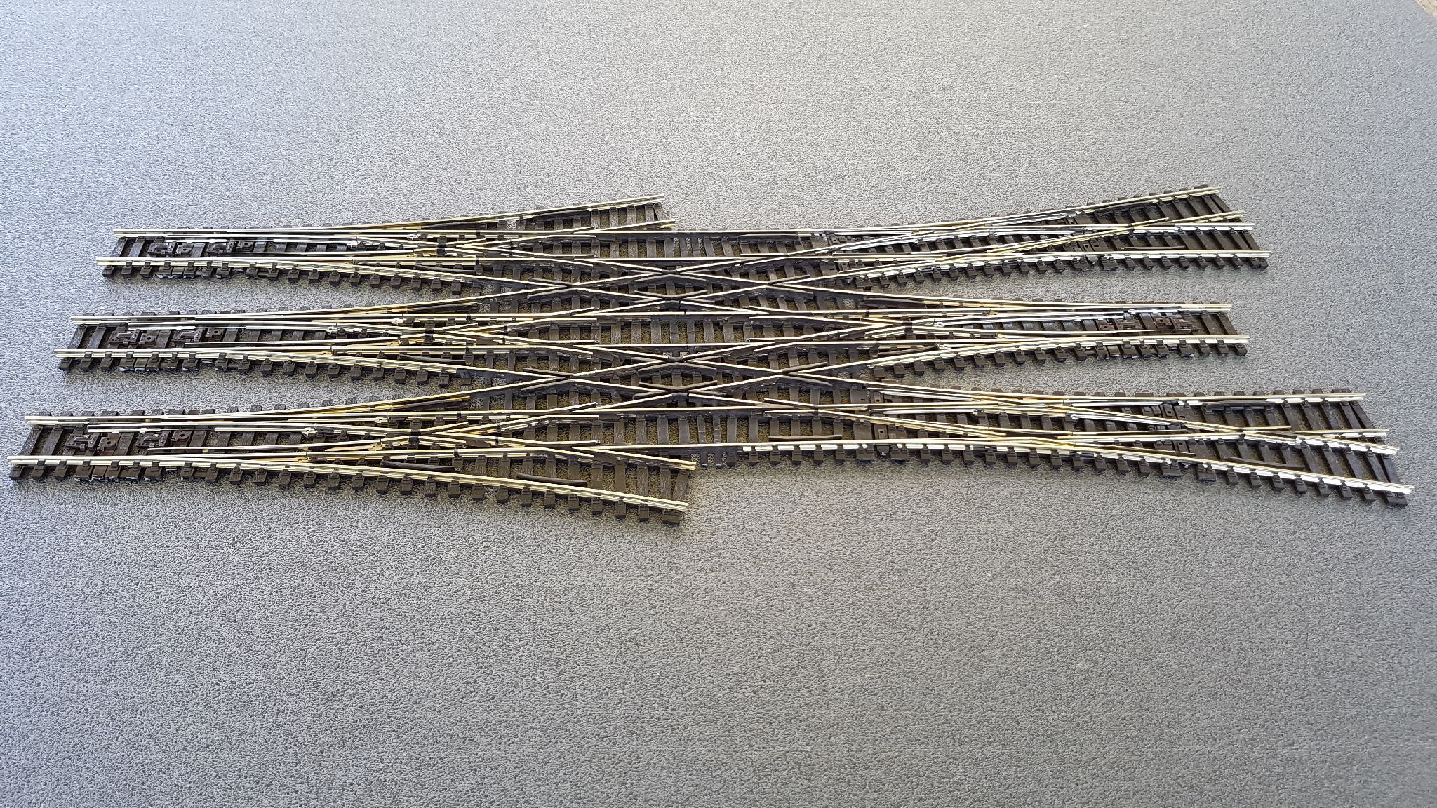 Tu sem izdelal en malo večji kretniški lik. Naredil sem ga iz 4ih trojnih, dveh križnih dvojno premičnih kretnic in dveh navadnih križev. Vse je ElectroFrog, torej srca niso plastična ampak kovinska. Uporaba takih kretnic se v vožnji izkaže za superiorno, toda izdelava je pa bolj kompleksna. Material je od proizvajalca Peco in tudi odmiki med tiri so po Peco specifikacijah torej od sredine do sredine sosednjega tira je natanko 51mm. Zakaj delati kaj takega? Če dobro pogledate so na vstopu v kretnico trije tiri na izstopu jih je pa sedem. Če bi enak rezultat želel doseči z postavitvijo normalnih kretnic bi v dolžino porabil natanko dvakrat toliko. Torej z izdelavo te monster kretnice sem prihranil na dolžini kretnic, torej je sama postaja, oziroma uporabna površina na postaji daljša. Kretnica ima 12 motorjev in 24 stikal za krmiljenje. Vsi motorji so spodaj pod kretnico, torej nič vidnega zgoraj.Vsak motor ima po dva dvopolna stikala. Eden se uporablja za samo delovanje kretnice (ElectroFrog) drugi je pa za signale. Ker bi ročno krmiljenje takega kompleksnega seta kretnic bila nočna mora sem to takoj opustil. Delovanje tega kretničarskega lika bo izvedeno tako, da ne bom krmilil vsake kretnice, oz vsakega motorja posebej, ampak bom s pritiskom na eno tipko krmilil več motorjev hkrati in s tem odpiral in sklepal določene rute - poti. Vsega skupaj je tu 17 rut, torej bo krmiljenje enostavneje in s pritiskom na eno tipko se sklene ena pot. Dodal bom tudi tipko default, to je kot nek reset, da se trije vstopni tiri povežejo direktno naravnost. Elektronika pod kretnico ni nič posebnega, enostavna diodna mreža skrbi da vsaka tipka požene samo določene motorje v določeno smer. Ikebane žic se pa na žalost nisem mogel ogniti :) Tale postavitev se je izkazala na koncu, v uporabi kot odlična rešitev in jo priporočam ima pa samo eno pomankljivost. peco motorji namreč so zelo potratni glede uporabe električne energije. Delujejo na 16V in ko je motor dejaven zna porabiti tudi do 2A elektrike, v popvprečju pa malo čez 1A. To niti ni toliko toda če pa na enkrat poženete 12 motorjev se pa skupna poraba zelo približa 20A kar je na koncu pomenilo da sem za ta kretničarski lik pod maketo priklopil poseben 16V 20A toroidni transformator ki krmili samo to in nič drugega. Na tem mestu moram poudariti da sem na vsak košček tira znotraj kretnice pripeljal tirno napajanje tako da nič ni odvisno od samih spojk (katere sem pa tudi na koncu vse zalotal skupaj z tiri). Zadeva se je izkazala kot odlična, stabilna in lahka za uporabo. Potrebno je edino vedeti katera tipka krmili katero ruto to sem pa rešil z mini displayem na prednji krmilni plošči pod maketo.