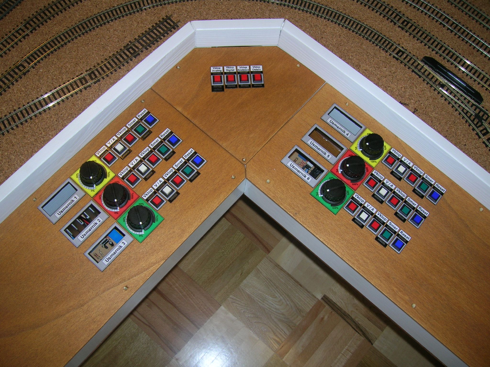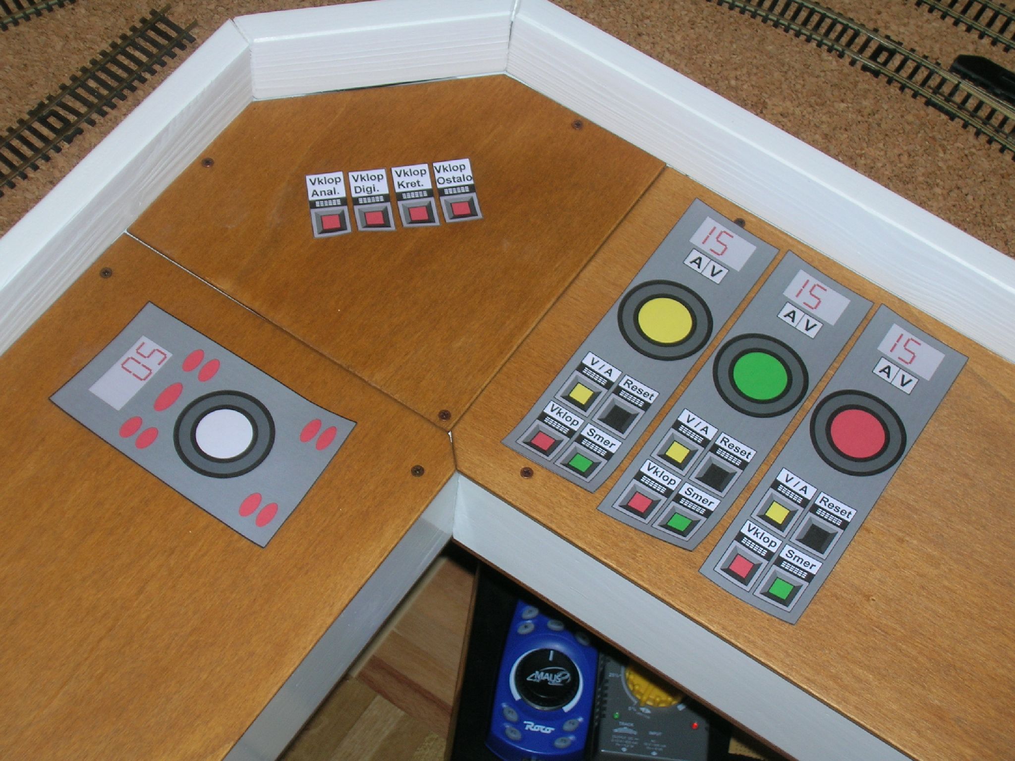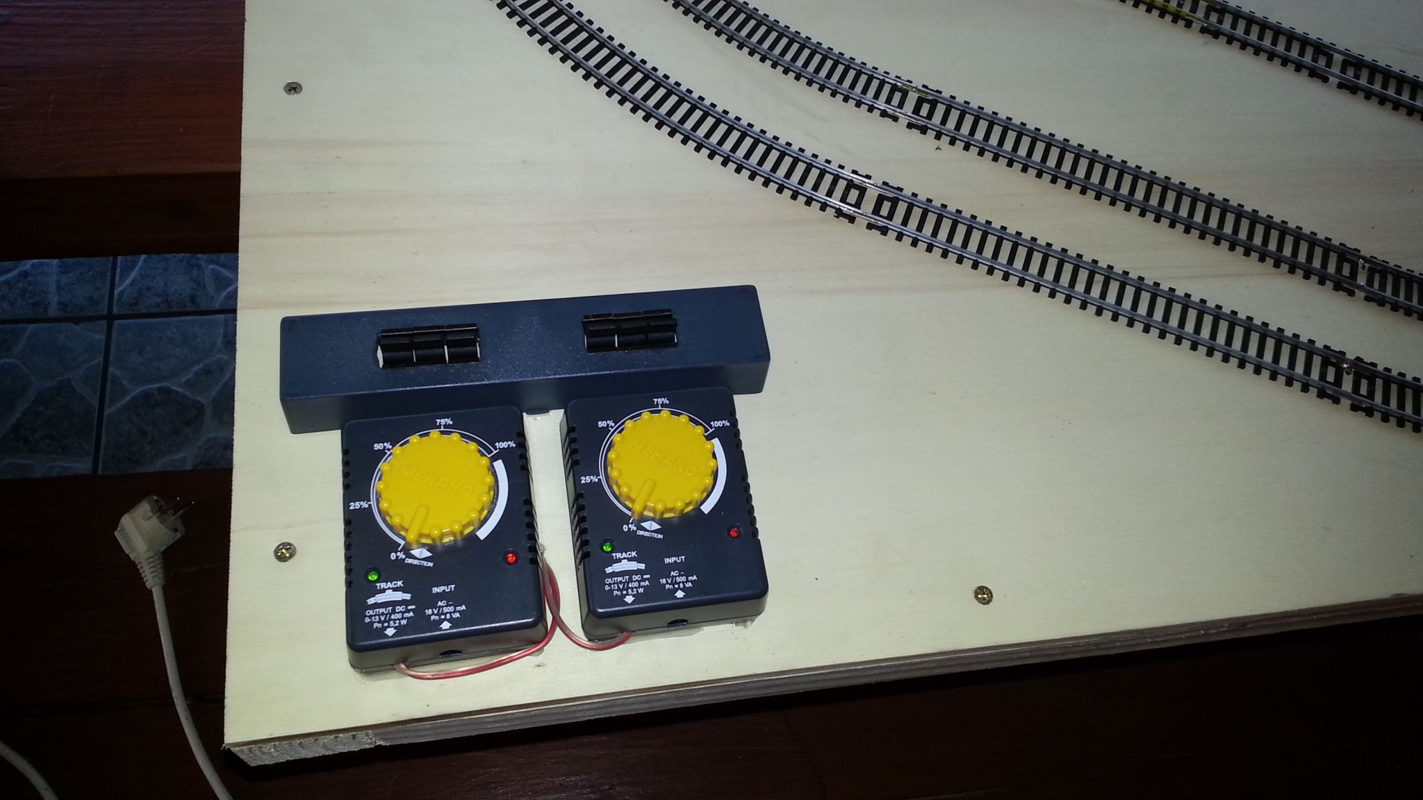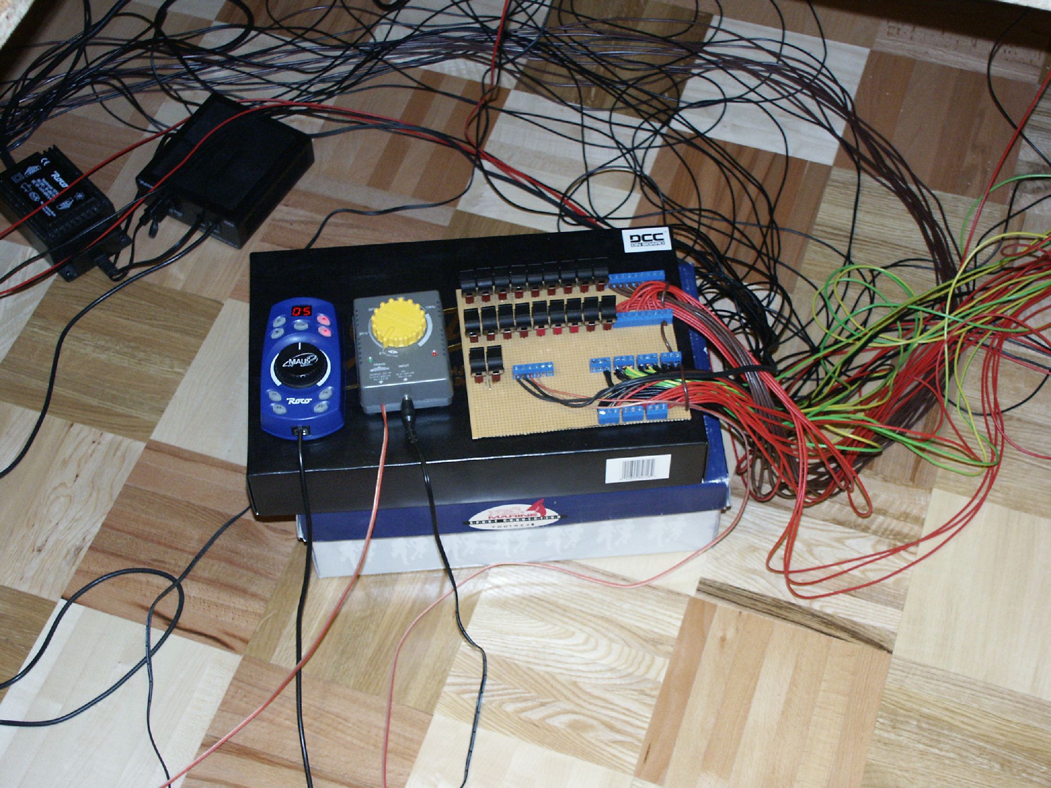 Na prvi sliki vidite začasno komandno ploščo, za vklaplanje in izklaplanje tokokrogov. Na sliki je tudi viden analogni kot tudi digitalni krmilnik za lokomotive. Tiri so vsi povezani, in postavil sem prve vlake.