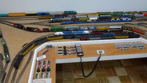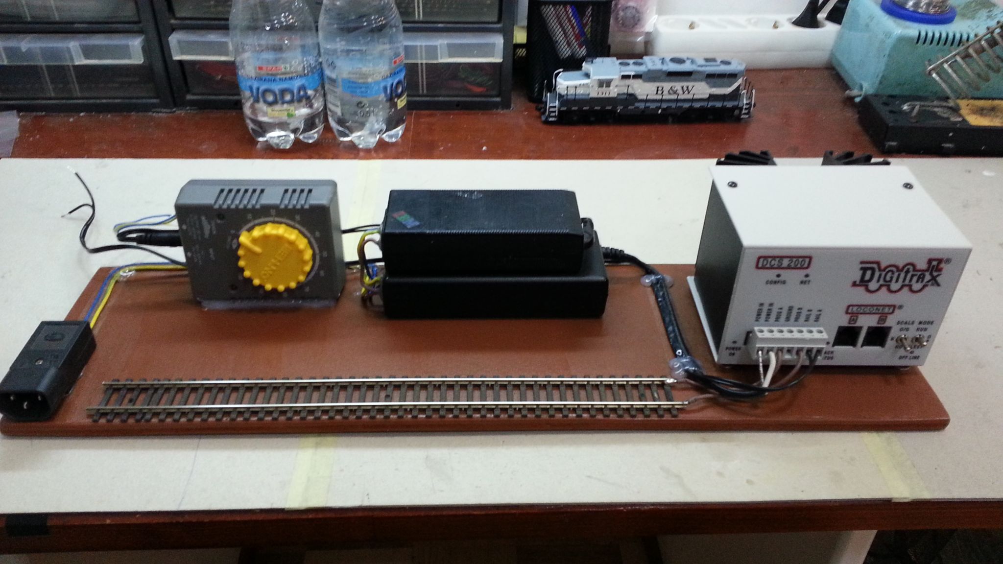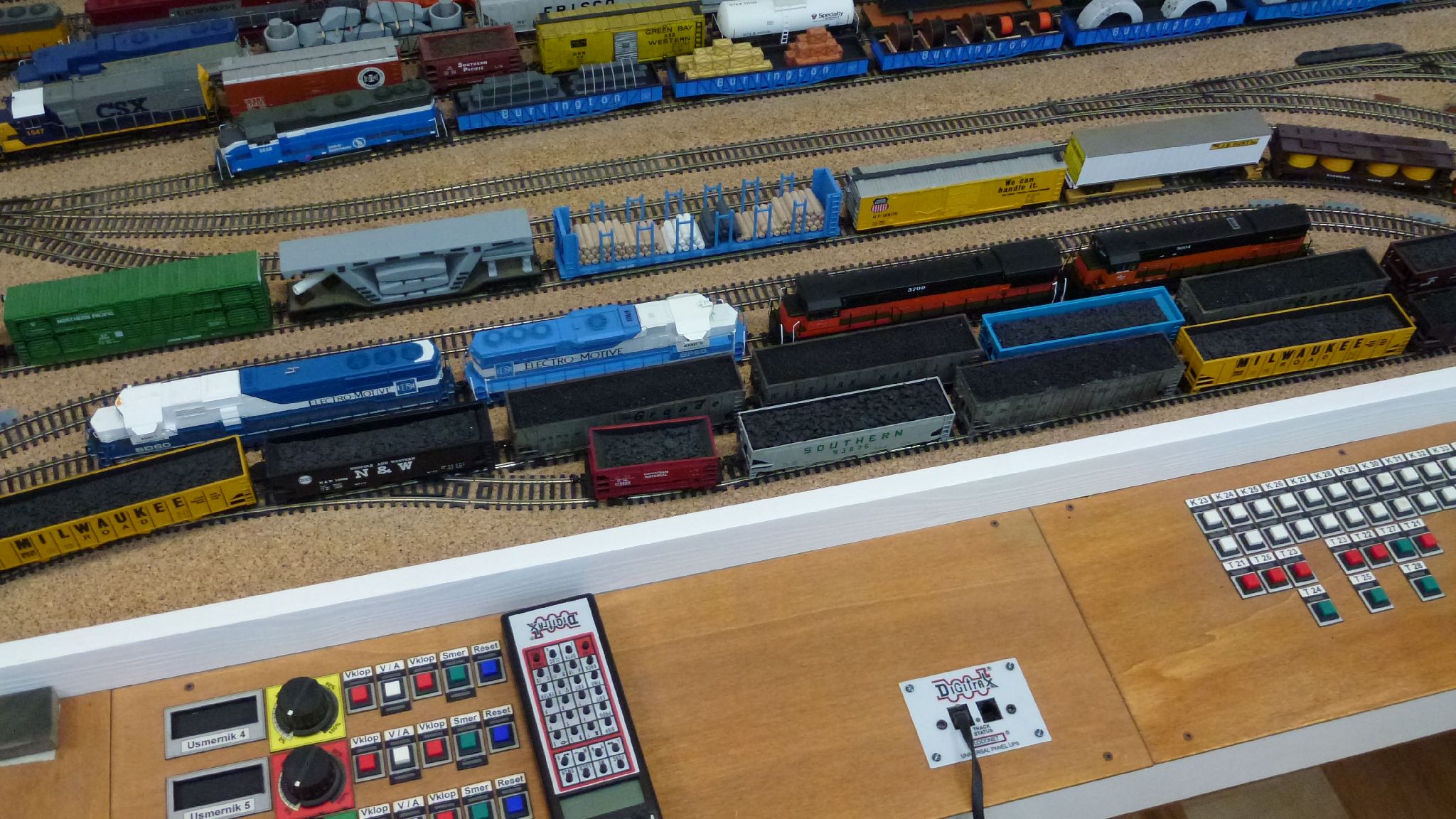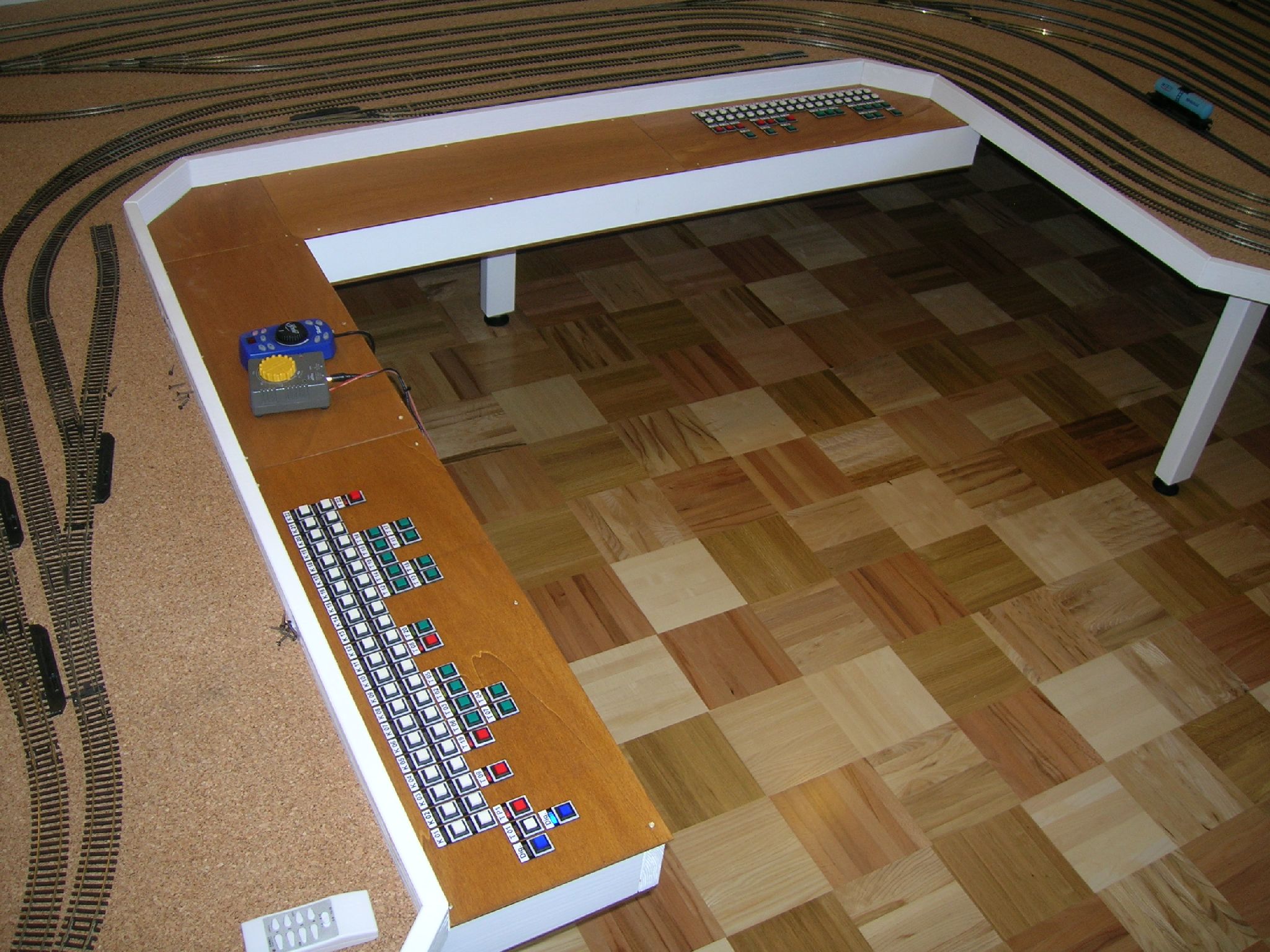 Na prvi sliki vidite začasno komandno ploščo, za vklaplanje in izklaplanje tokokrogov. Na sliki je tudi viden analogni kot tudi digitalni krmilnik za lokomotive. Tiri so vsi povezani, in postavil sem prve vlake.