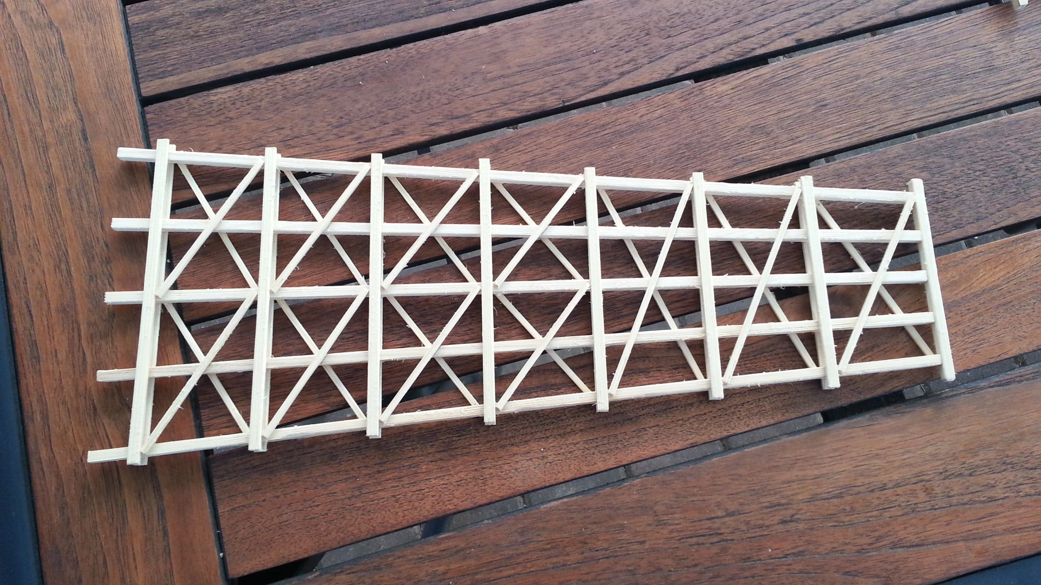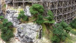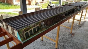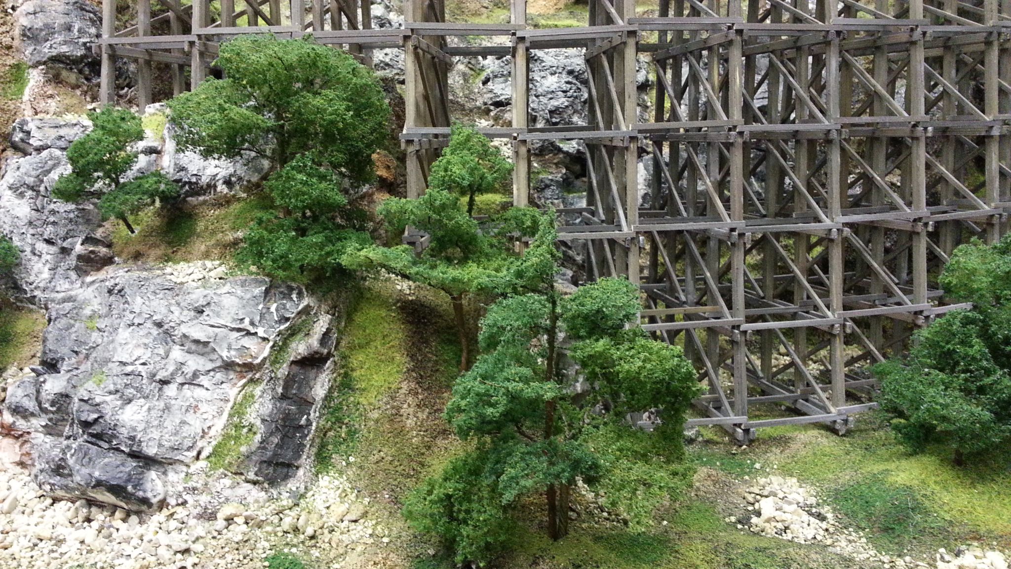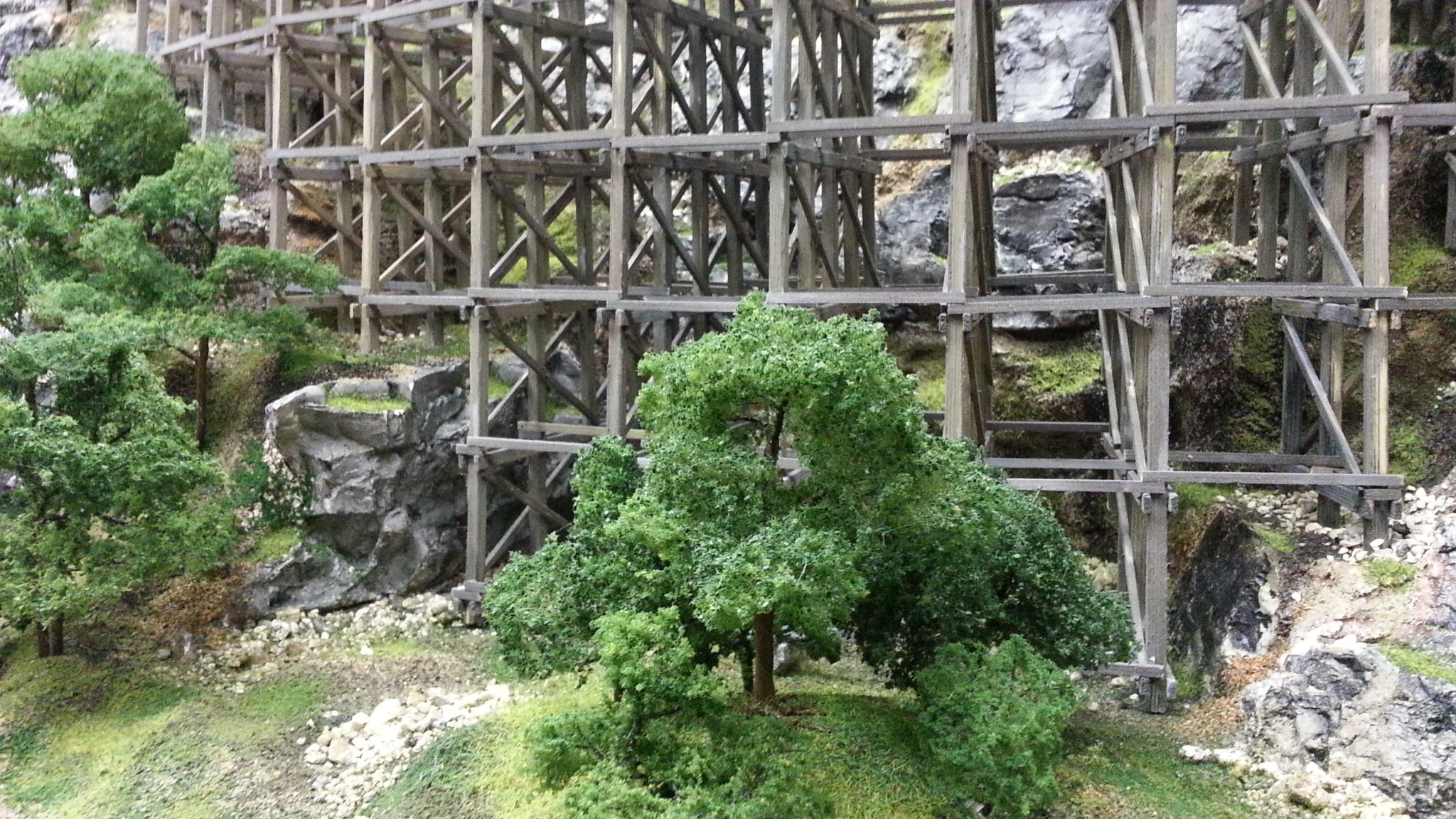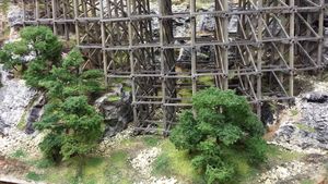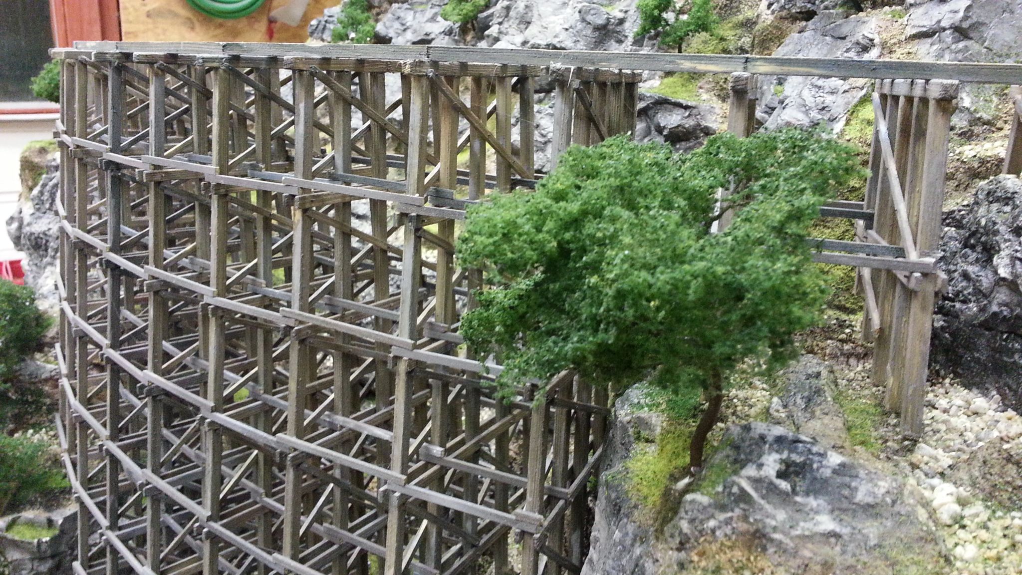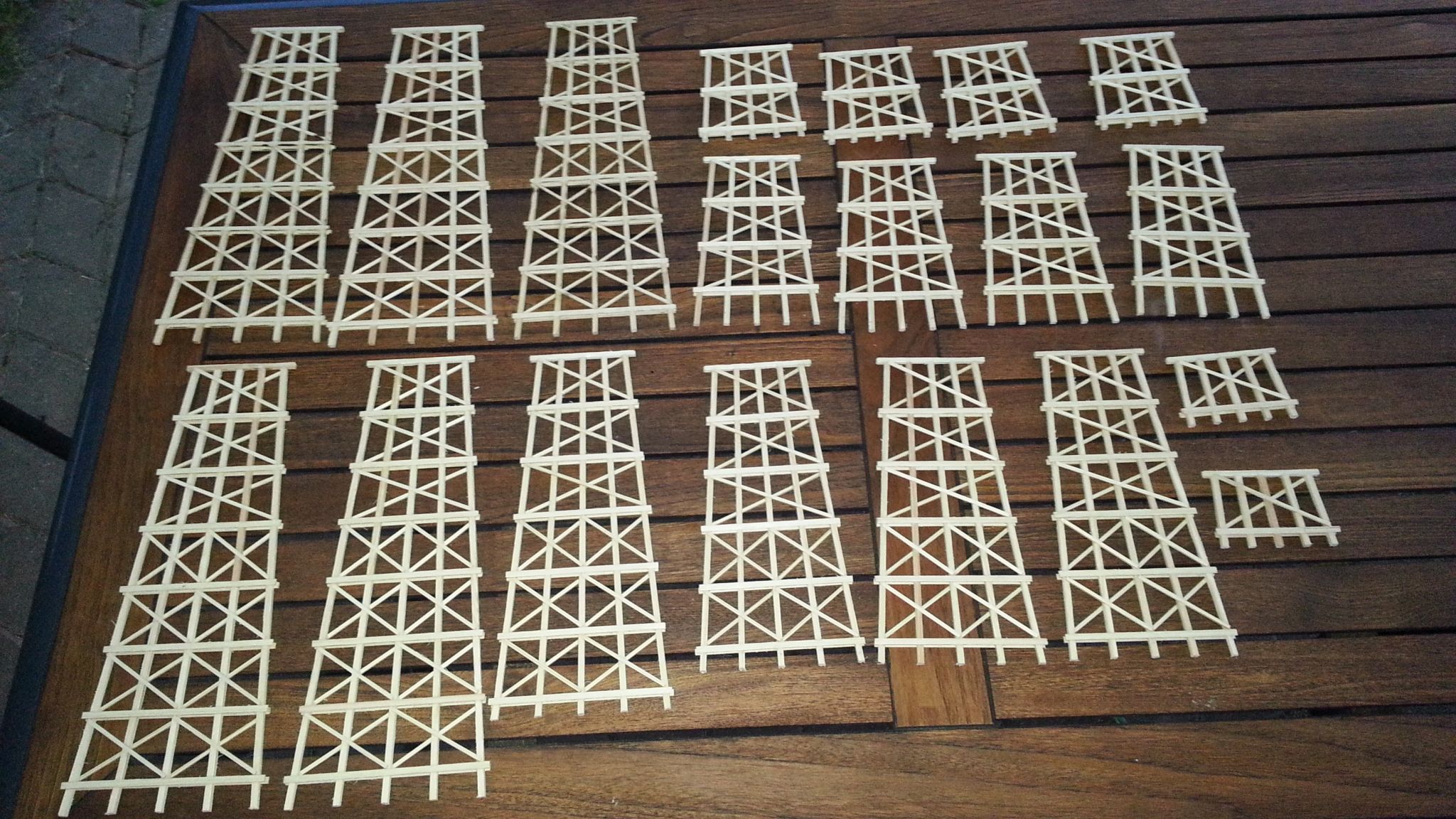 Nadaljevanje moje prve diorame sem si zamislil v ovinek z velikim lesenim mostom. V Ameriki tak most imenujejo Trestle bridge. Začel sem z nakupom letvic različnih dimenzij. 5x5, 5x3, 5x2, 3x2, 2x2 in 4x4mm so mere letvic katere sem uporabil. Ker so to lepe, gladke, nepoškodovane letvice sem jih prvo vse dodobra opraskal, nekaterim dodobra obrezal robove da niso preveč lepe. Zatem sem naredil enostavno šablono v katero sem samo vtikal letvice, jih zalimal, ko se je lim posušil sem dobil posamezne elemente. Koliko nosilnih elementov rabite za 70cm dolg most vidite na sliki.