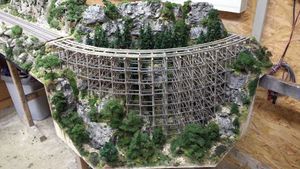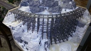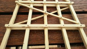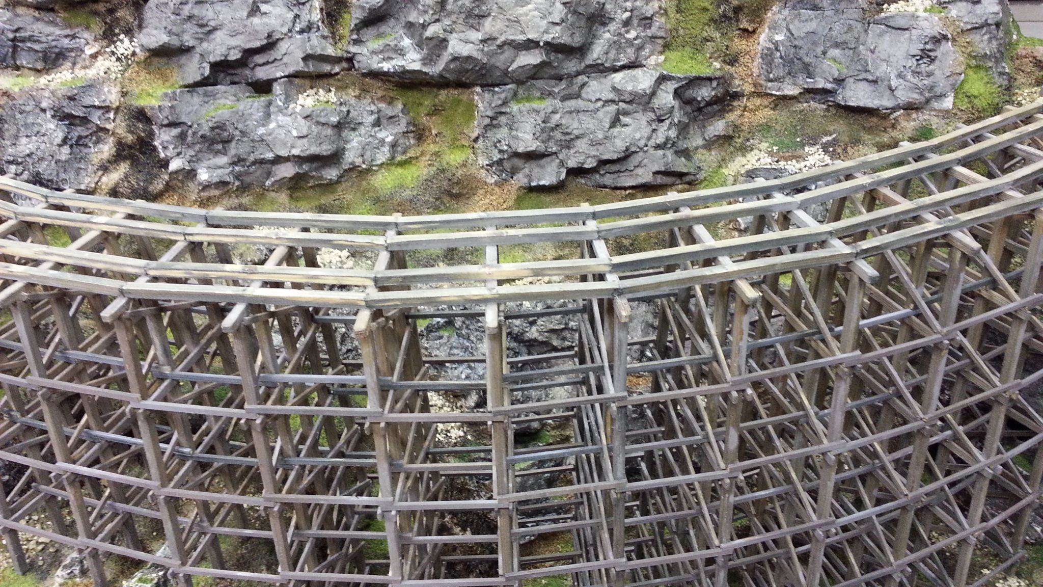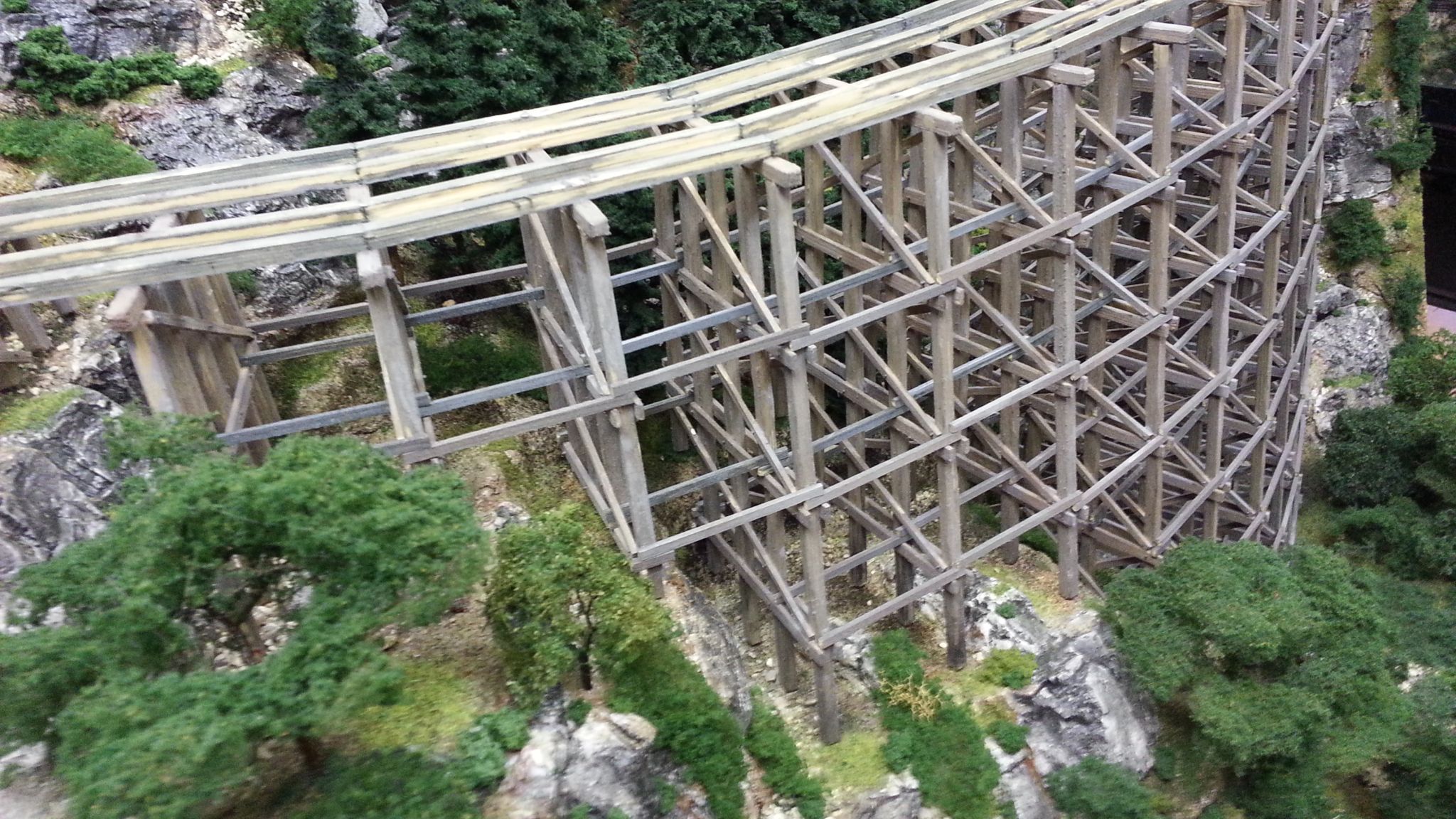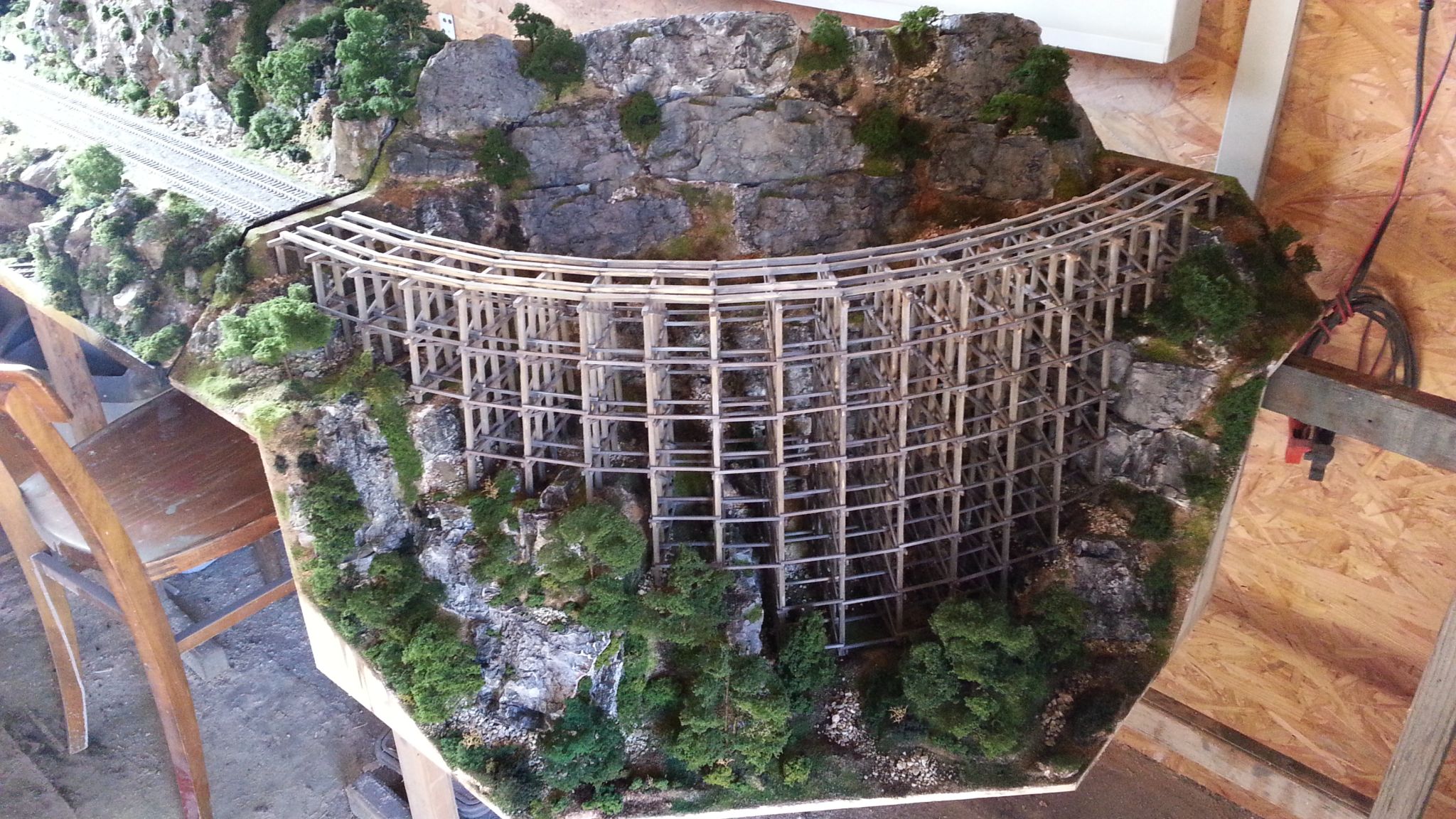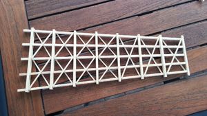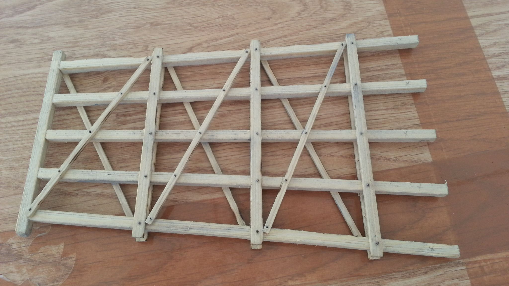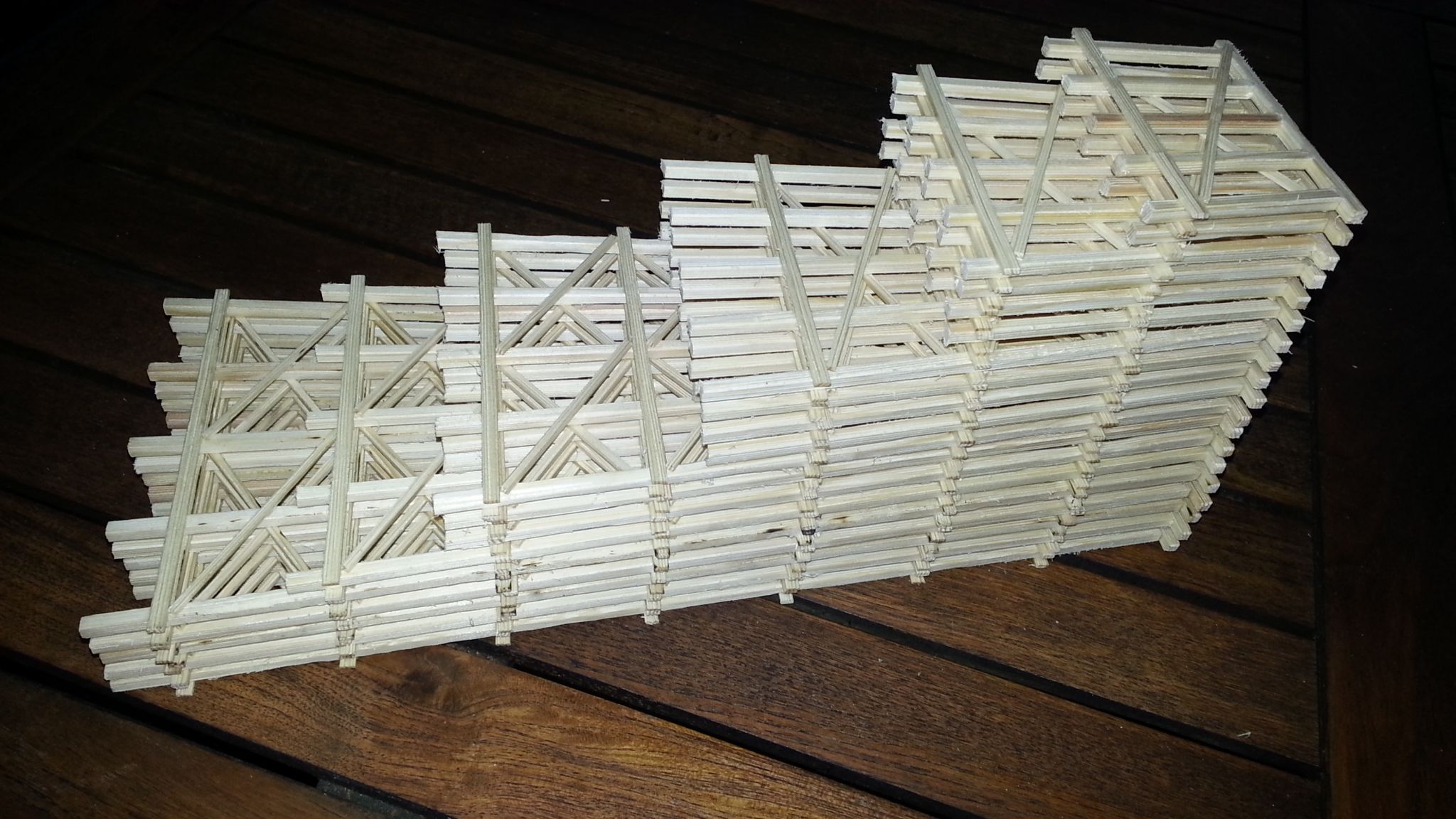 Nadaljevanje moje prve diorame sem si zamislil v ovinek z velikim lesenim mostom. V Ameriki tak most imenujejo Trestle bridge. Začel sem z nakupom letvic različnih dimenzij. 5x5, 5x3, 5x2, 3x2, 2x2 in 4x4mm so mere letvic katere sem uporabil. Ker so to lepe, gladke, nepoškodovane letvice sem jih prvo vse dodobra opraskal, nekaterim dodobra obrezal robove da niso preveč lepe. Zatem sem naredil enostavno šablono v katero sem samo vtikal letvice, jih zalimal, ko se je lim posušil sem dobil posamezne elemente. Koliko nosilnih elementov rabite za 70cm dolg most vidite na sliki.