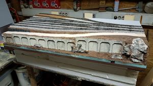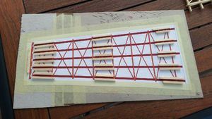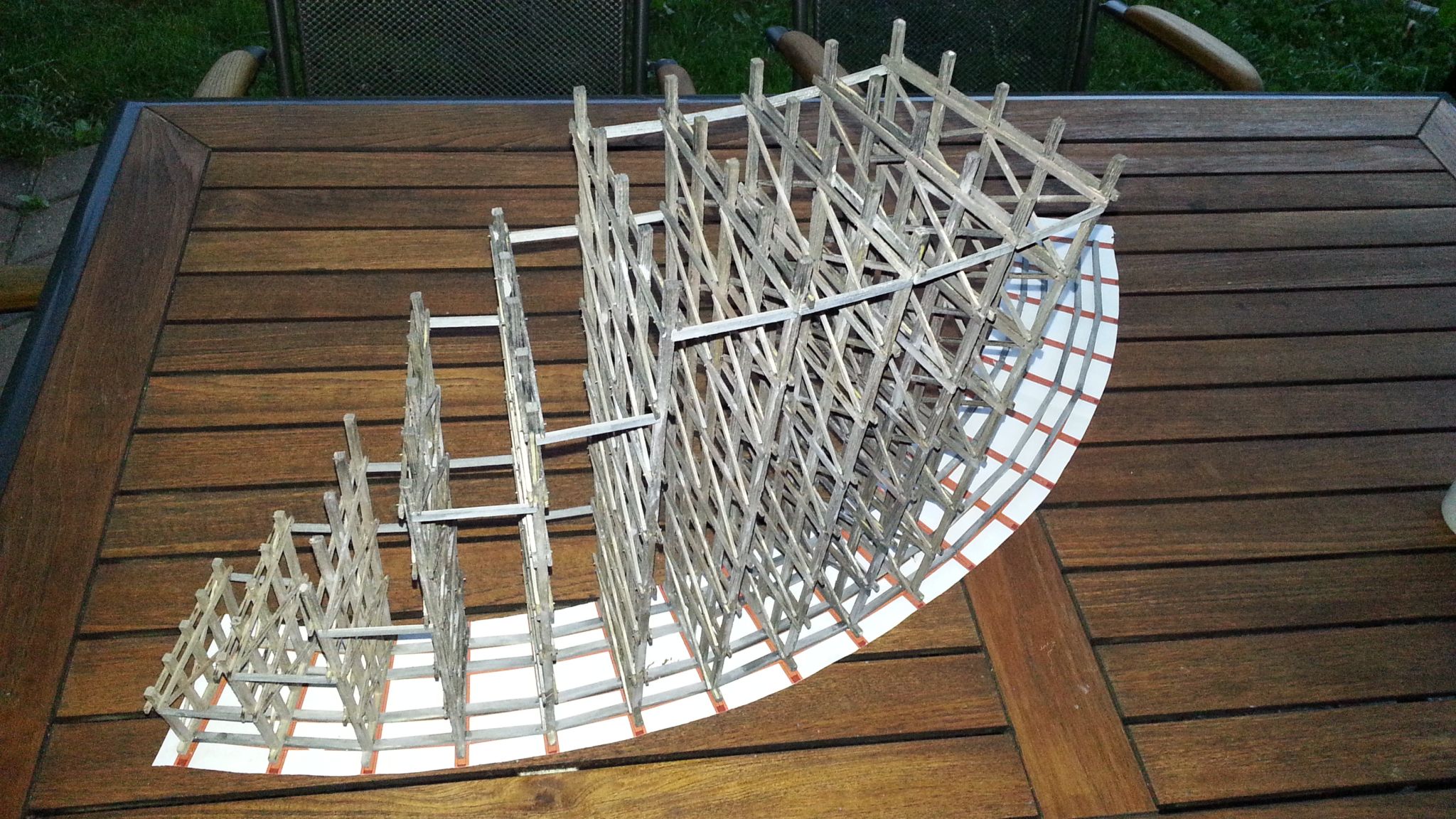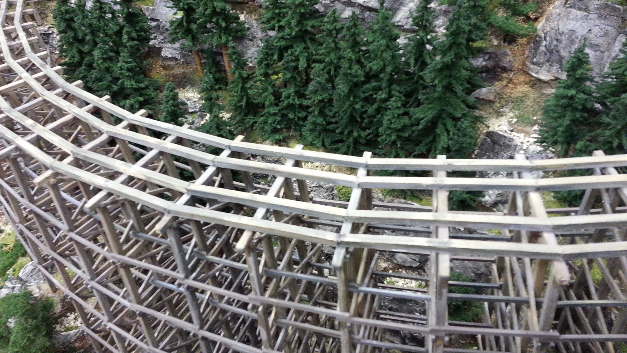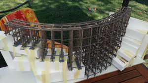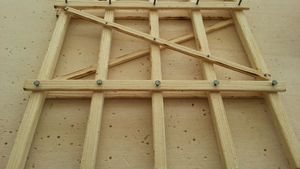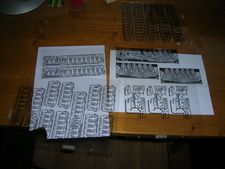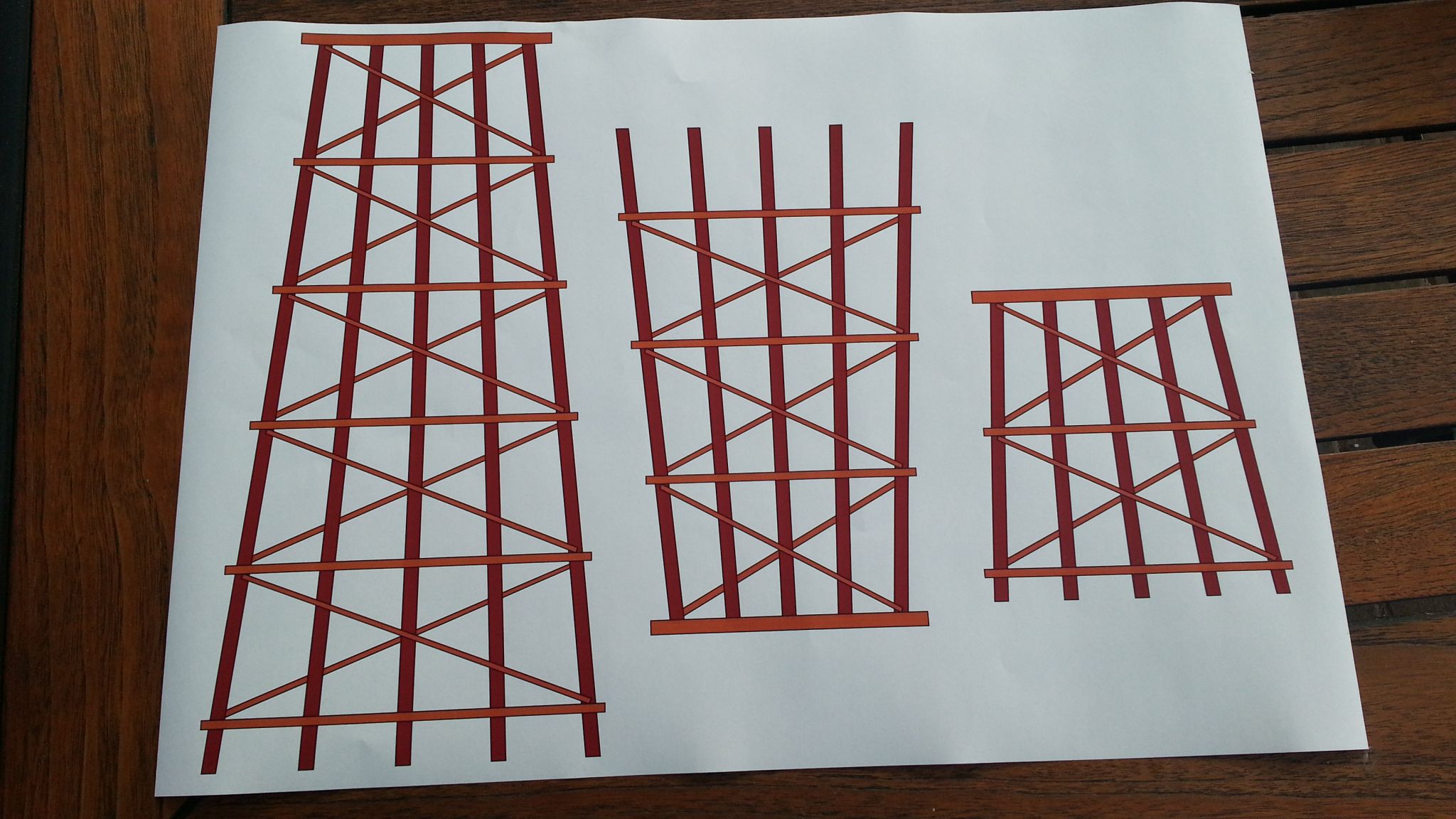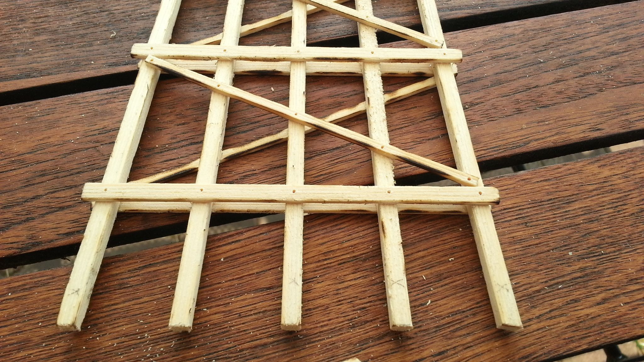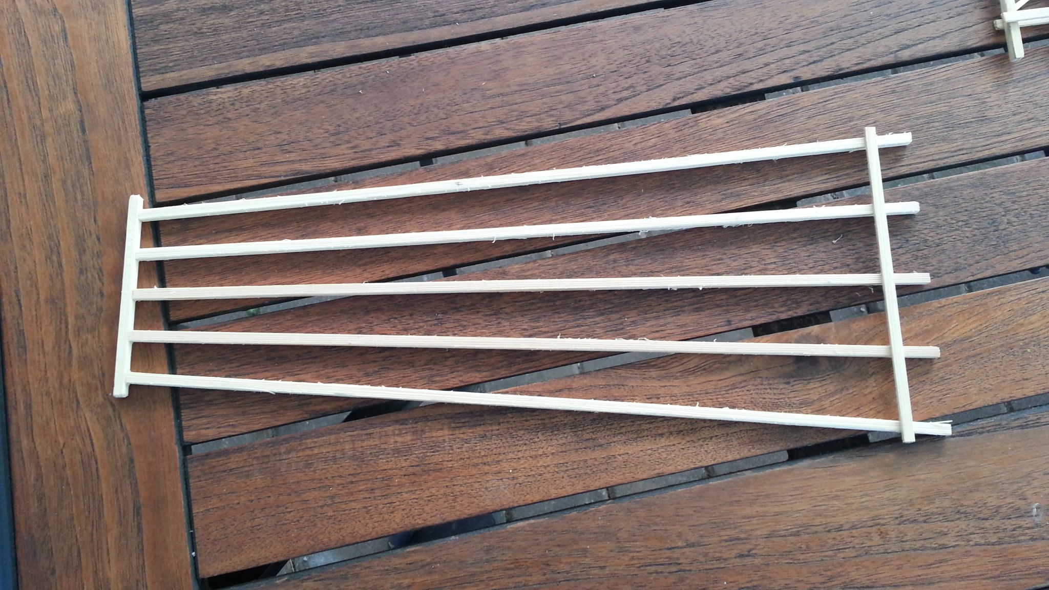 Nadaljevanje moje prve diorame sem si zamislil v ovinek z velikim lesenim mostom. V Ameriki tak most imenujejo Trestle bridge. Začel sem z nakupom letvic različnih dimenzij. 5x5, 5x3, 5x2, 3x2, 2x2 in 4x4mm so mere letvic katere sem uporabil. Ker so to lepe, gladke, nepoškodovane letvice sem jih prvo vse dodobra opraskal, nekaterim dodobra obrezal robove da niso preveč lepe. Zatem sem naredil enostavno šablono v katero sem samo vtikal letvice, jih zalimal, ko se je lim posušil sem dobil posamezne elemente. Koliko nosilnih elementov rabite za 70cm dolg most vidite na sliki.