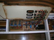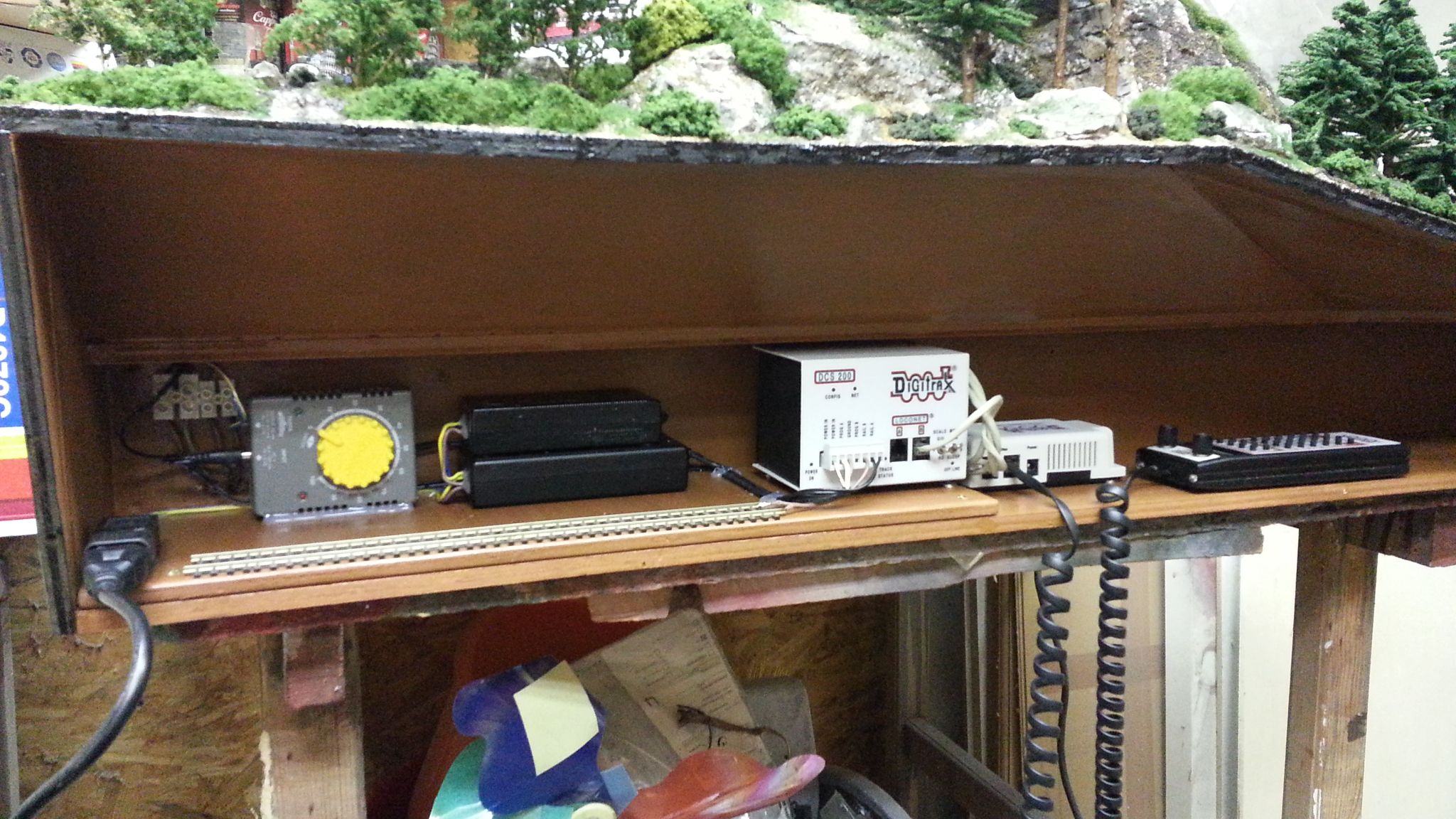 Na koncu bi rad še pokazal zadnjo stran diorame. V njo sem skril vso elektroniko potrebno da tiri na diorami delujejo. Naredil sem tako da je en tir analogen drug pa digitalen. Uporabil sem klasični Mehano napajalnik, in svojo Digitrax postajo katero imam na domači maketi in jo po potrebi prestavim v dioramo (sejmi, predstavitve,...) Torej, hkrati lahko vozim dve lokomotivi eno digitalno in eno analogno.