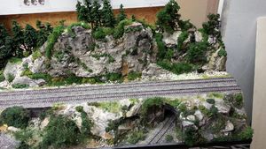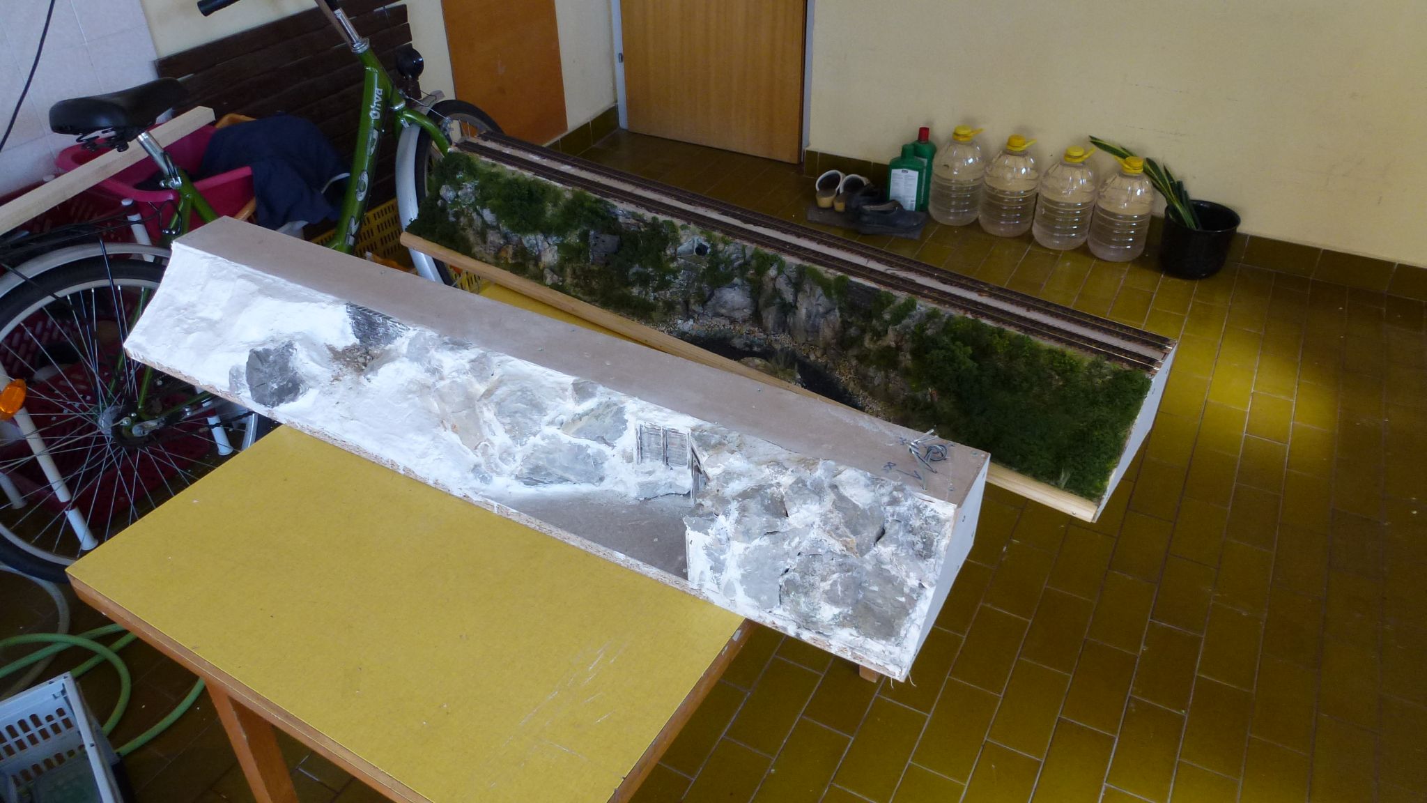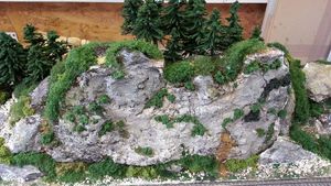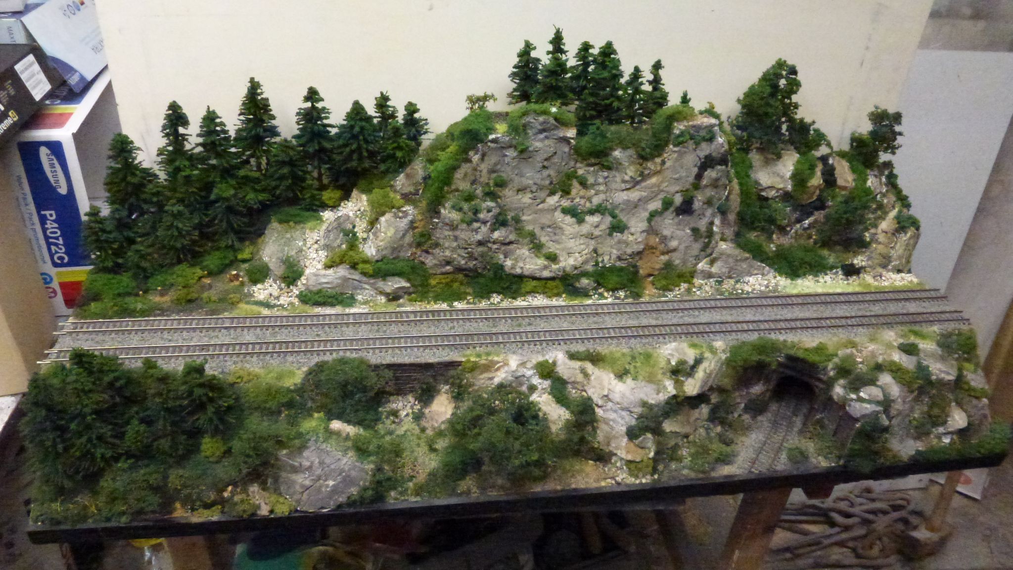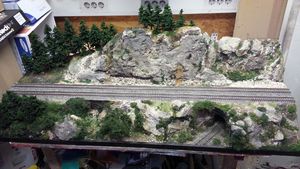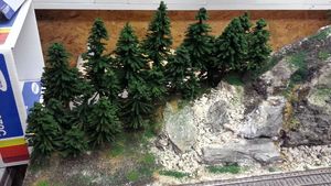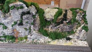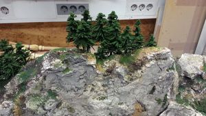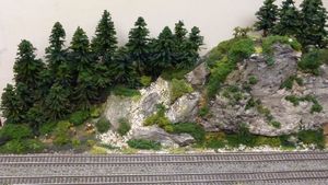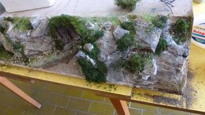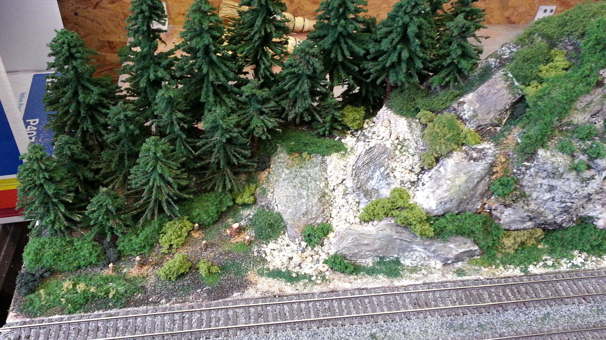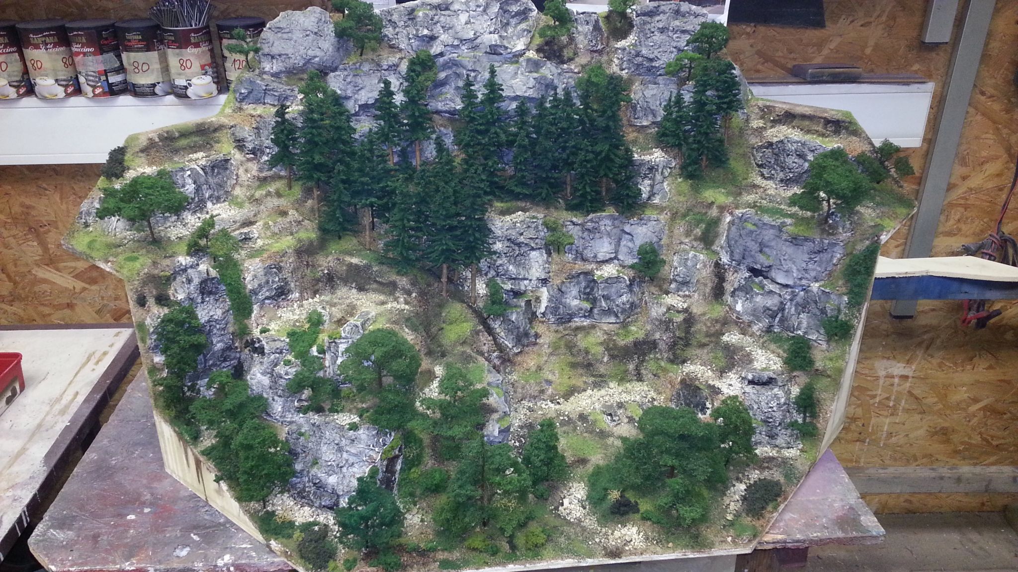 Zaradi fotografiranja lokomotiv in vagonov sem se odločil da izdelam še dodatek k diorami naprej od tirov. Odločil sem se za hrib kateri iz leve proti desni strani raste. Zamišljeno je bilo tako da je na levi strani gozd kateri se potem proti desno dviguje z hribom in gre za njim, tako da na vrhu hriba je gozd za njim. Začetek je vedno z stiroporjem in mavčnimi povoji. Skale, nekaj pravih, nehaj umetnih sem nalimal na stiroporno podlago, okoli njih in čez ves stiropor pa dal mavčne povoje.