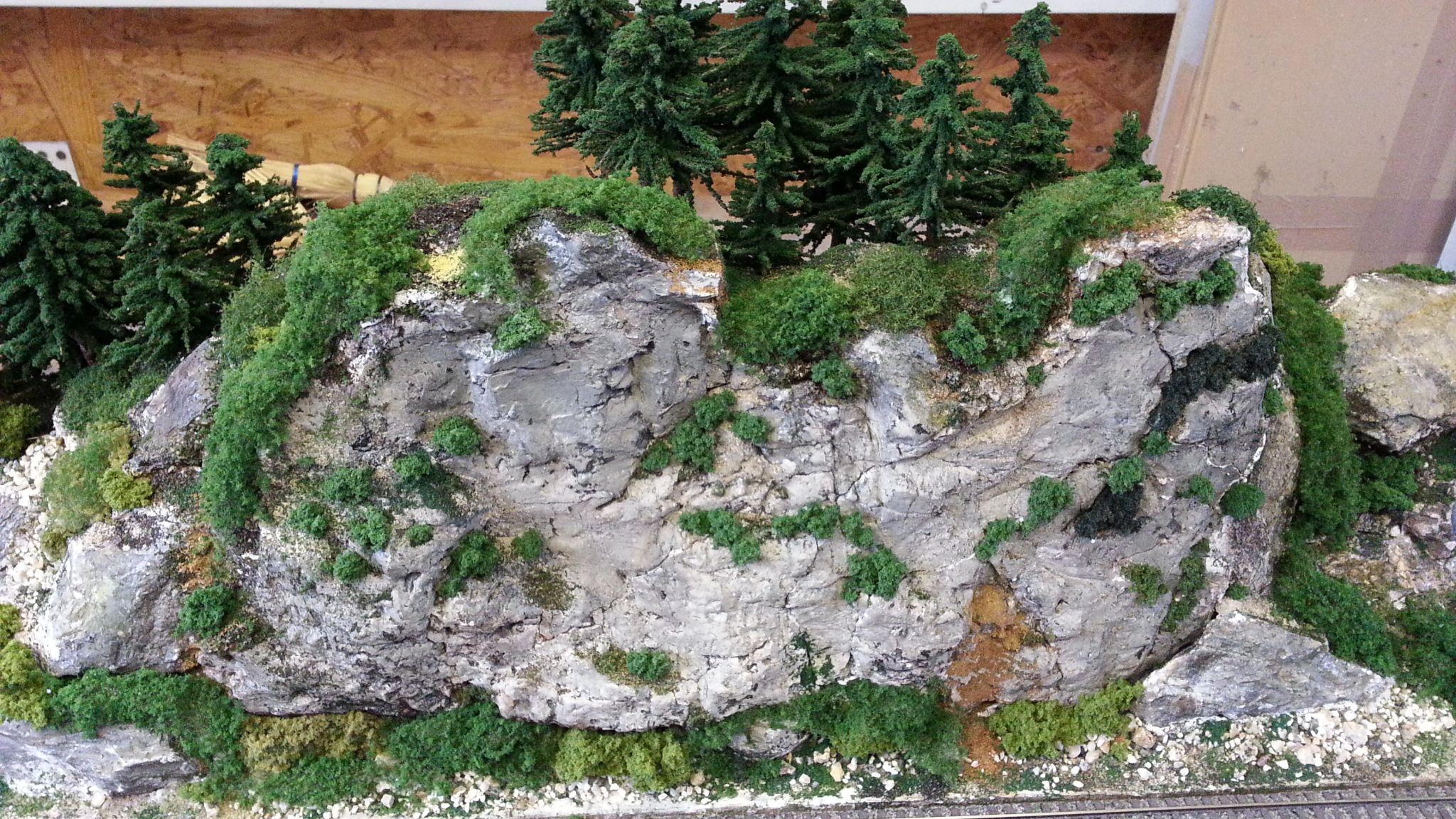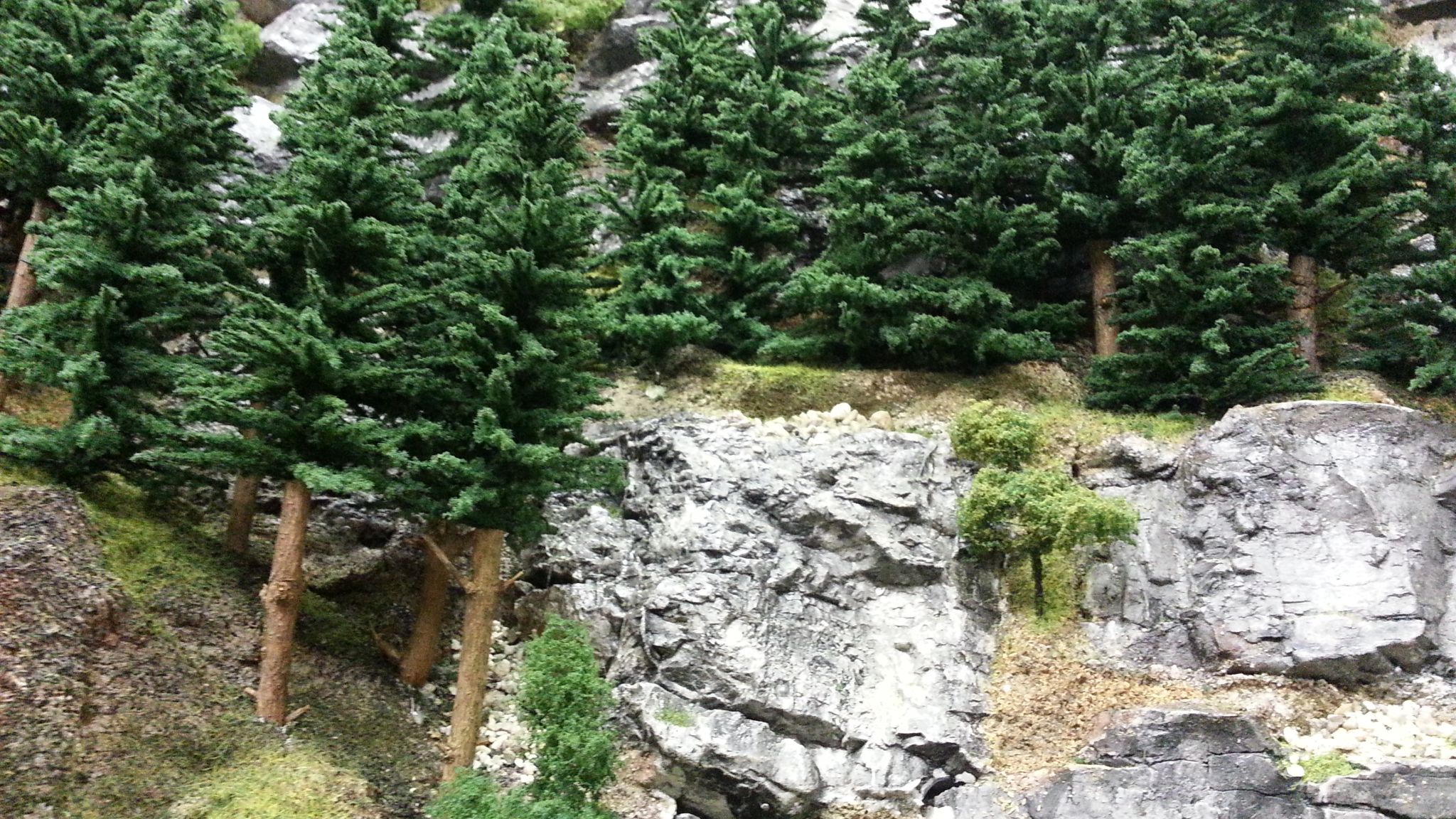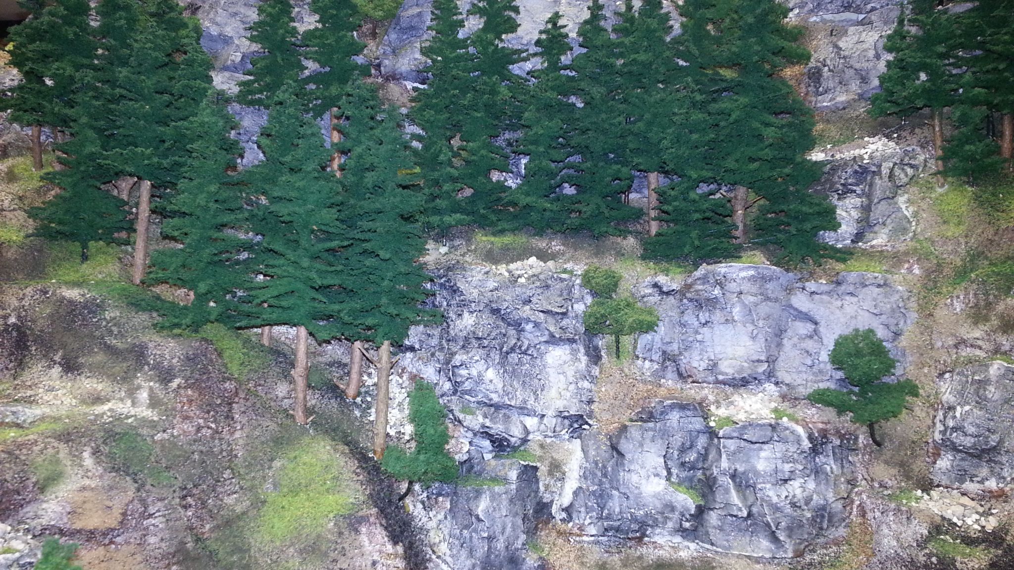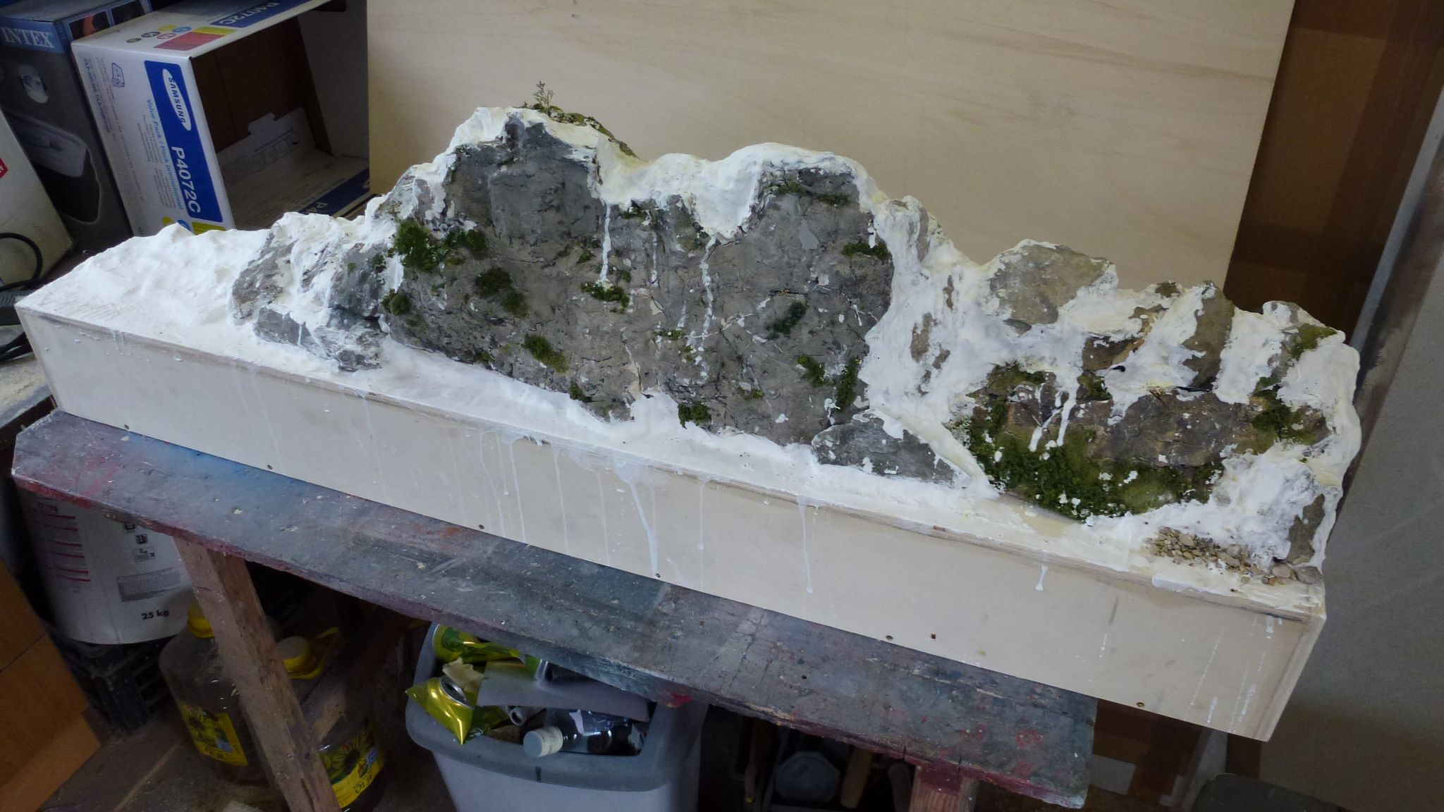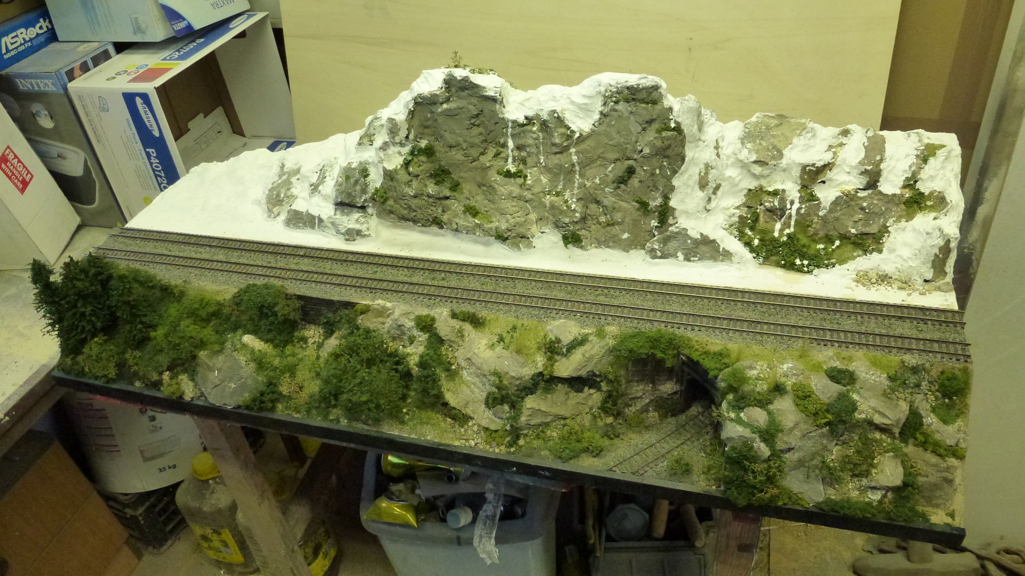 Zaradi fotografiranja lokomotiv in vagonov sem se odločil da izdelam še dodatek k diorami naprej od tirov. Odločil sem se za hrib kateri iz leve proti desni strani raste. Zamišljeno je bilo tako da je na levi strani gozd kateri se potem proti desno dviguje z hribom in gre za njim, tako da na vrhu hriba je gozd za njim. Začetek je vedno z stiroporjem in mavčnimi povoji. Skale, nekaj pravih, nehaj umetnih sem nalimal na stiroporno podlago, okoli njih in čez ves stiropor pa dal mavčne povoje.