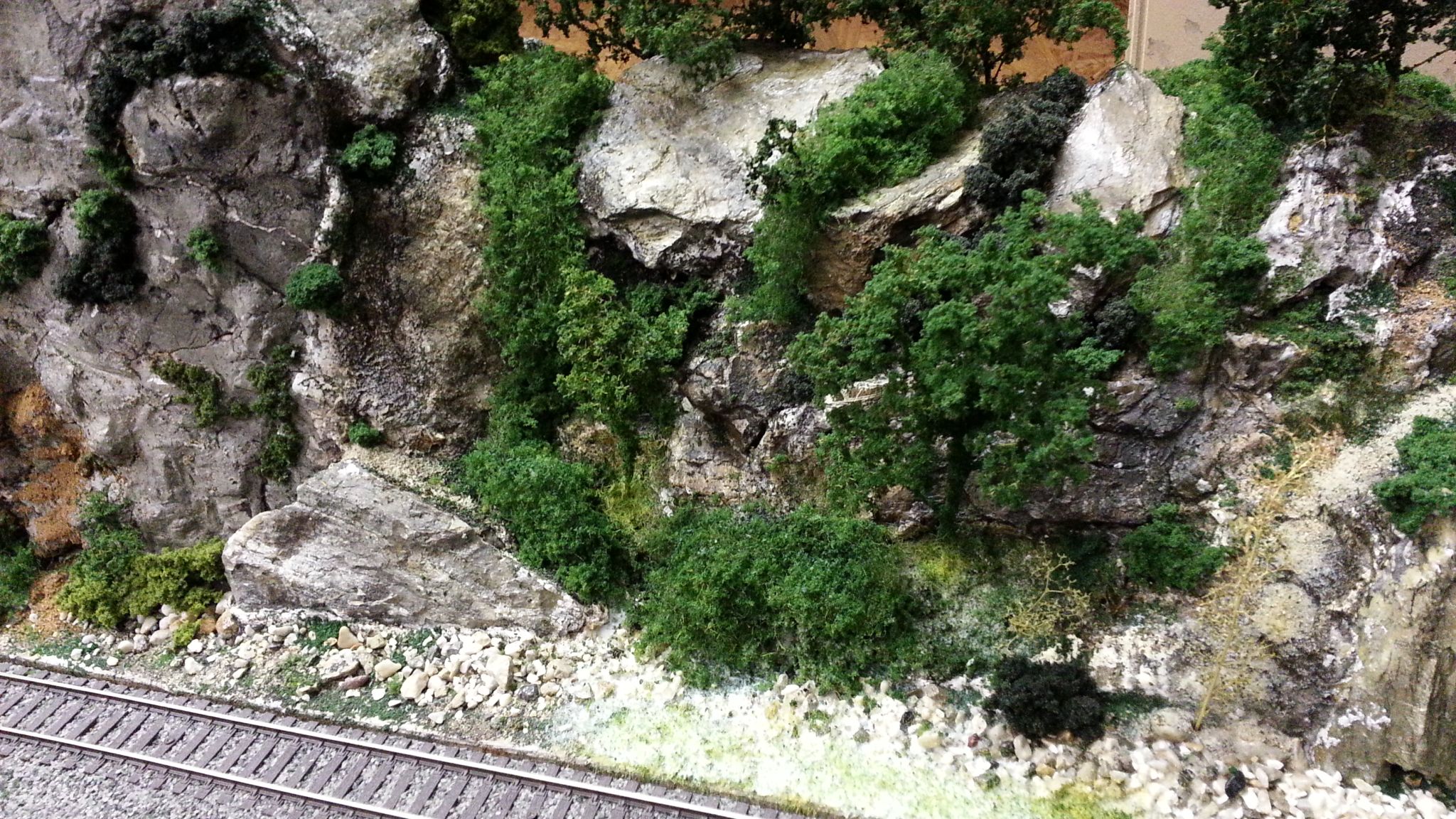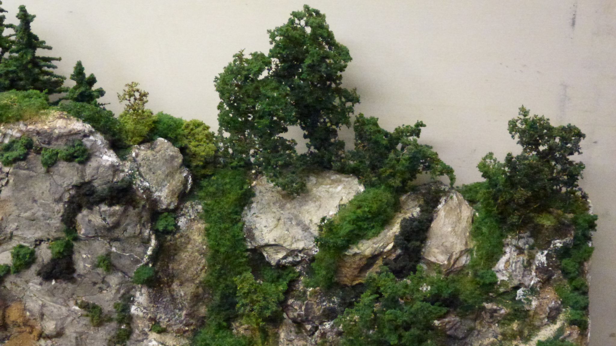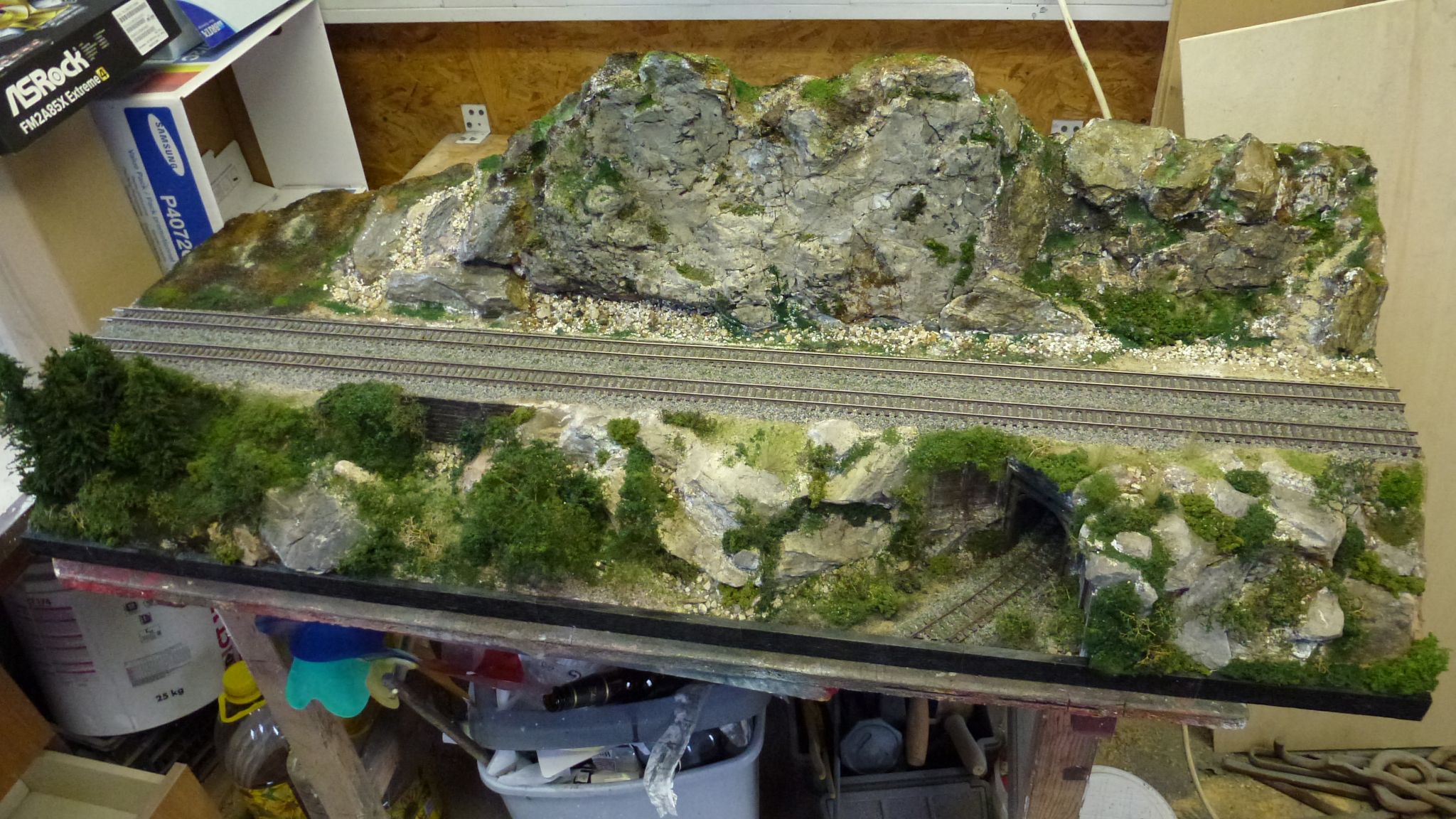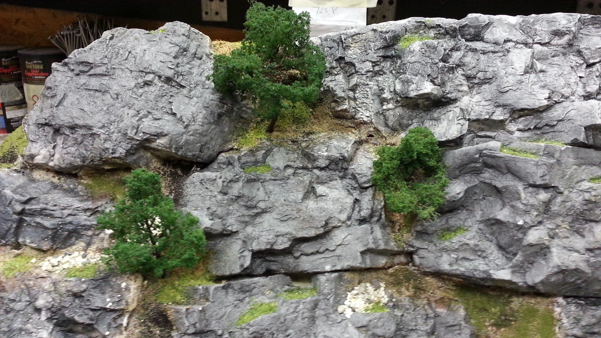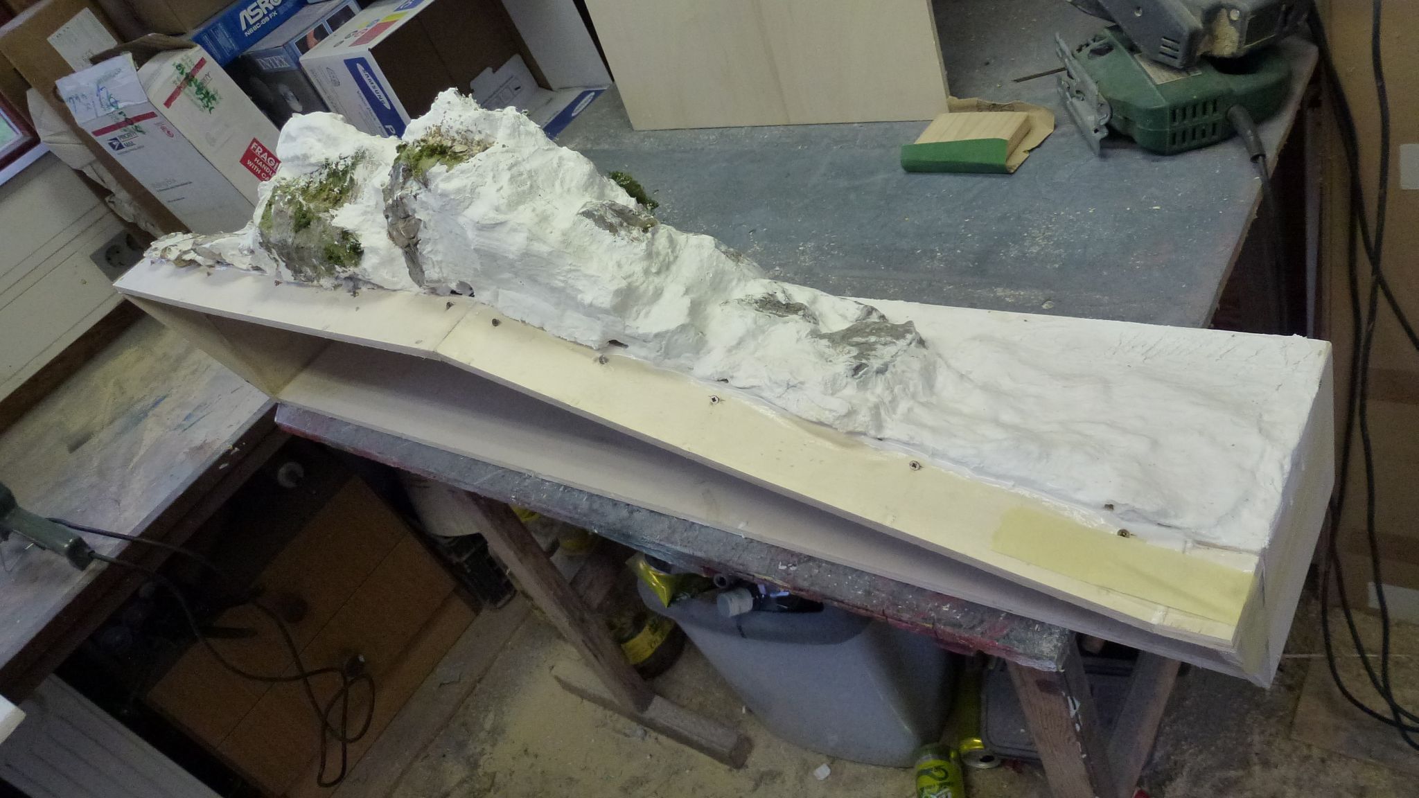 Zaradi fotografiranja lokomotiv in vagonov sem se odločil da izdelam še dodatek k diorami naprej od tirov. Odločil sem se za hrib kateri iz leve proti desni strani raste. Zamišljeno je bilo tako da je na levi strani gozd kateri se potem proti desno dviguje z hribom in gre za njim, tako da na vrhu hriba je gozd za njim. Začetek je vedno z stiroporjem in mavčnimi povoji. Skale, nekaj pravih, nehaj umetnih sem nalimal na stiroporno podlago, okoli njih in čez ves stiropor pa dal mavčne povoje.