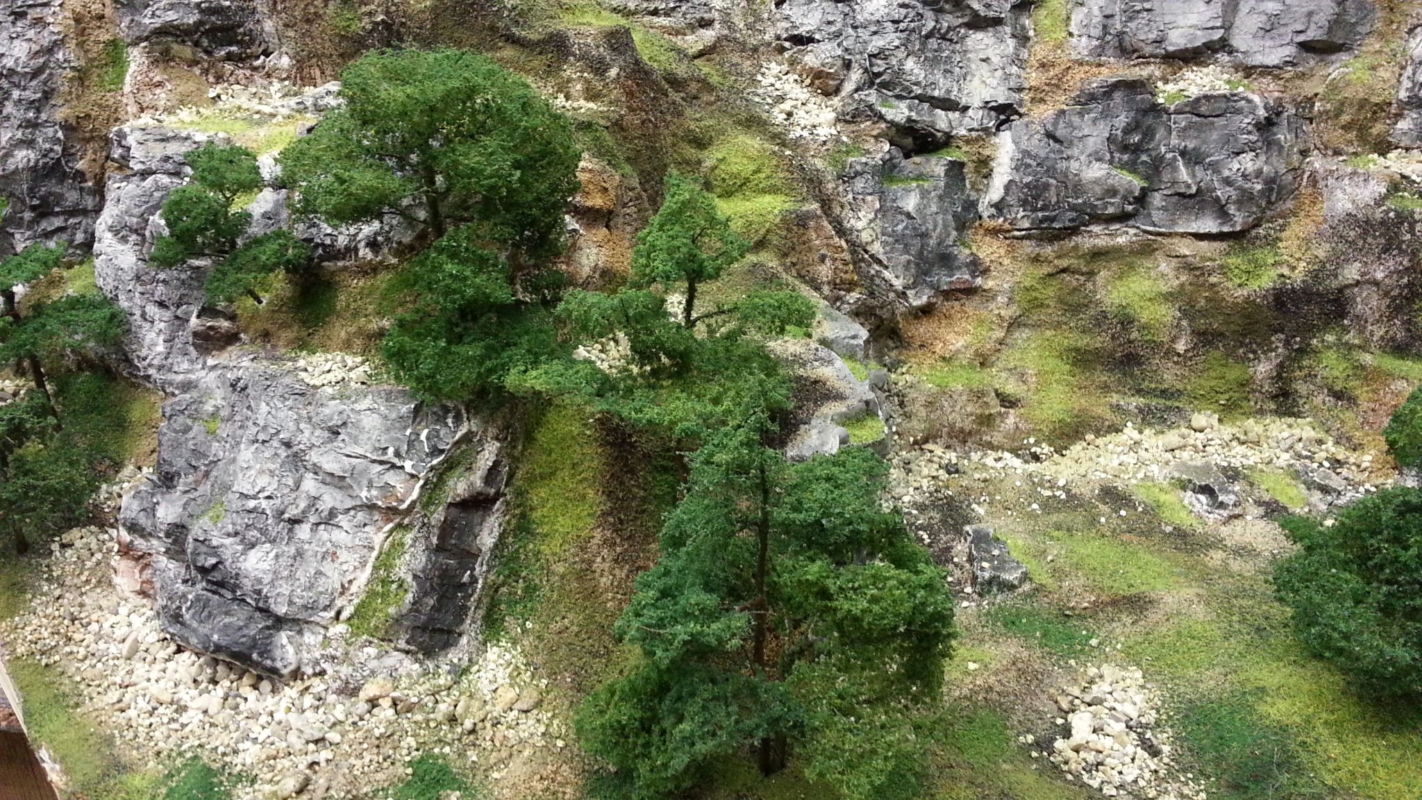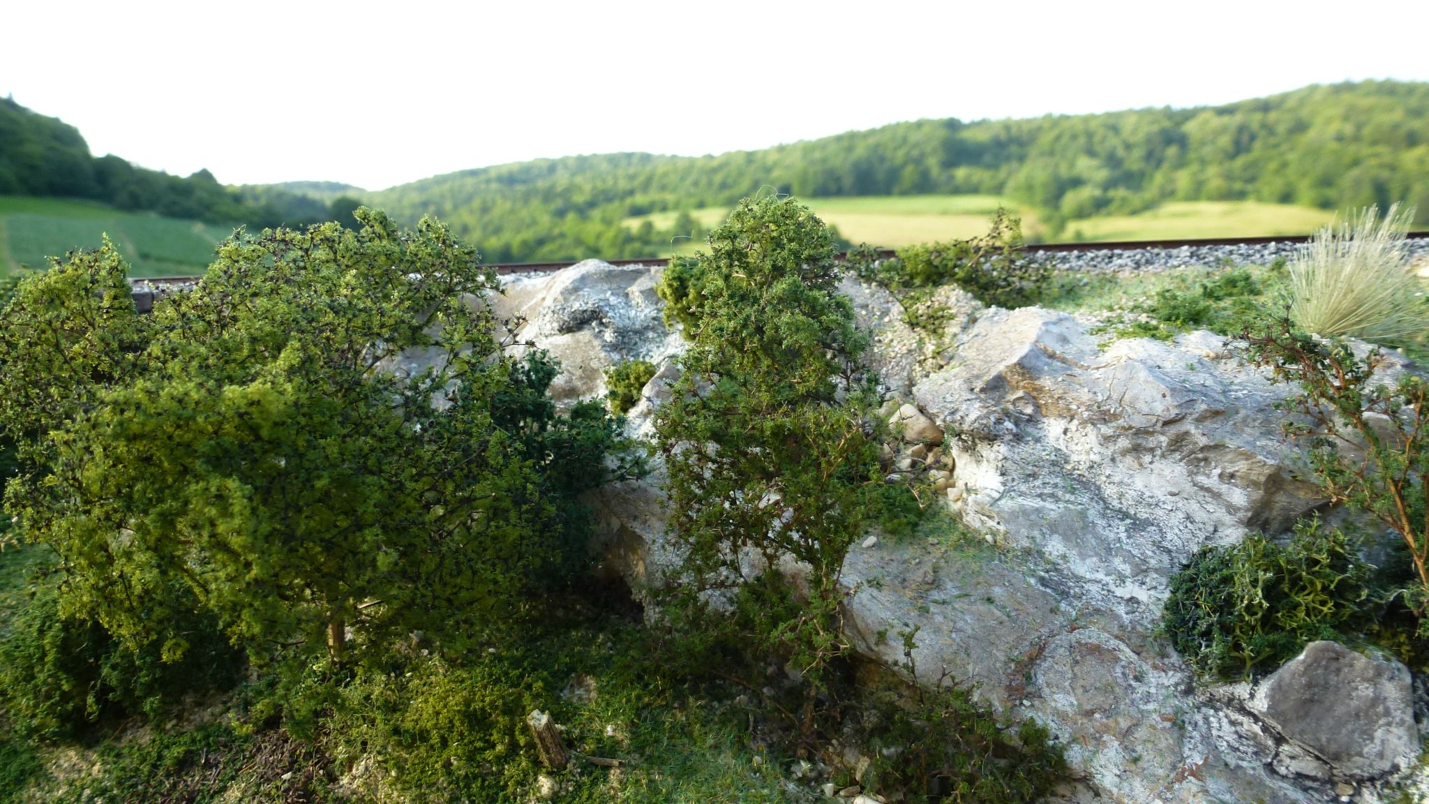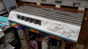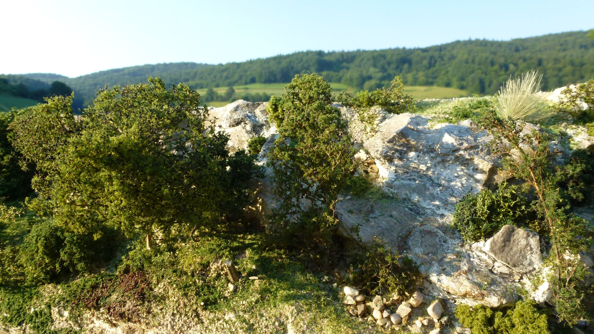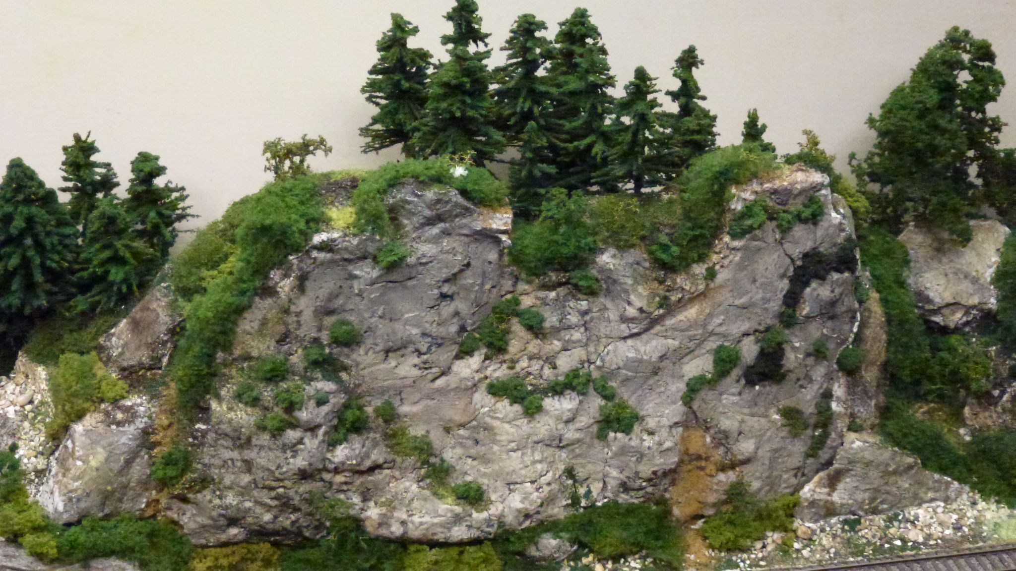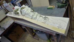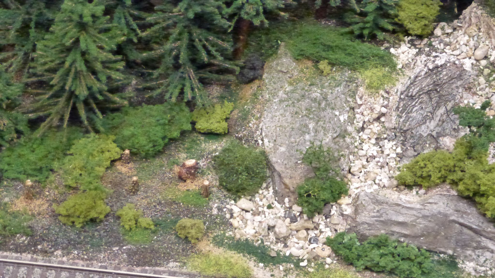 Zaradi fotografiranja lokomotiv in vagonov sem se odločil da izdelam še dodatek k diorami naprej od tirov. Odločil sem se za hrib kateri iz leve proti desni strani raste. Zamišljeno je bilo tako da je na levi strani gozd kateri se potem proti desno dviguje z hribom in gre za njim, tako da na vrhu hriba je gozd za njim. Začetek je vedno z stiroporjem in mavčnimi povoji. Skale, nekaj pravih, nehaj umetnih sem nalimal na stiroporno podlago, okoli njih in čez ves stiropor pa dal mavčne povoje.