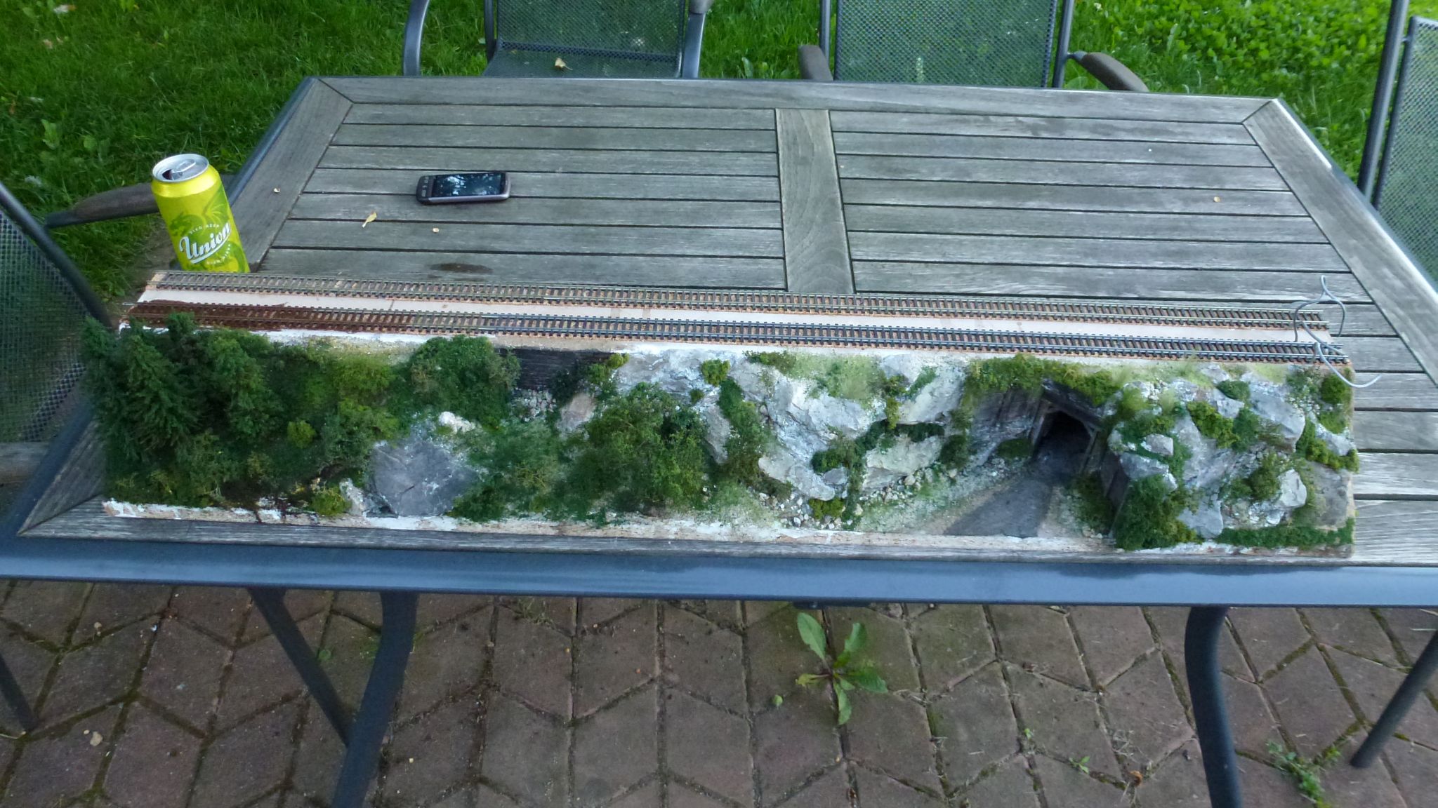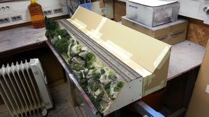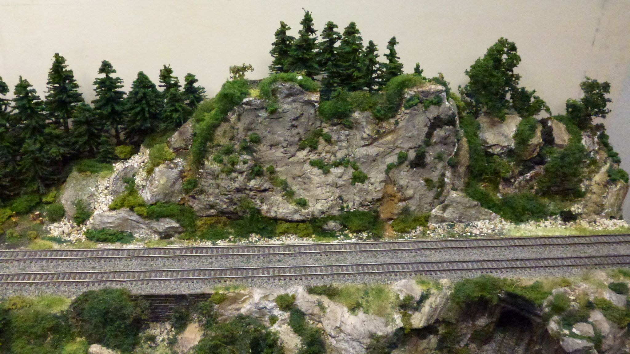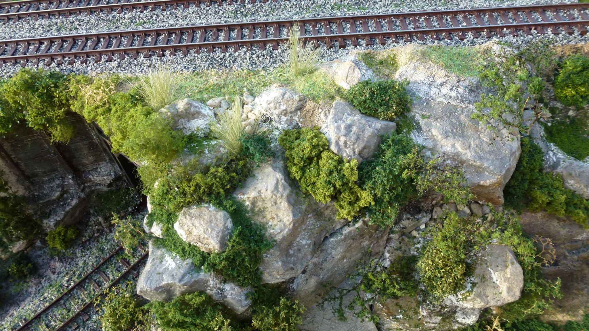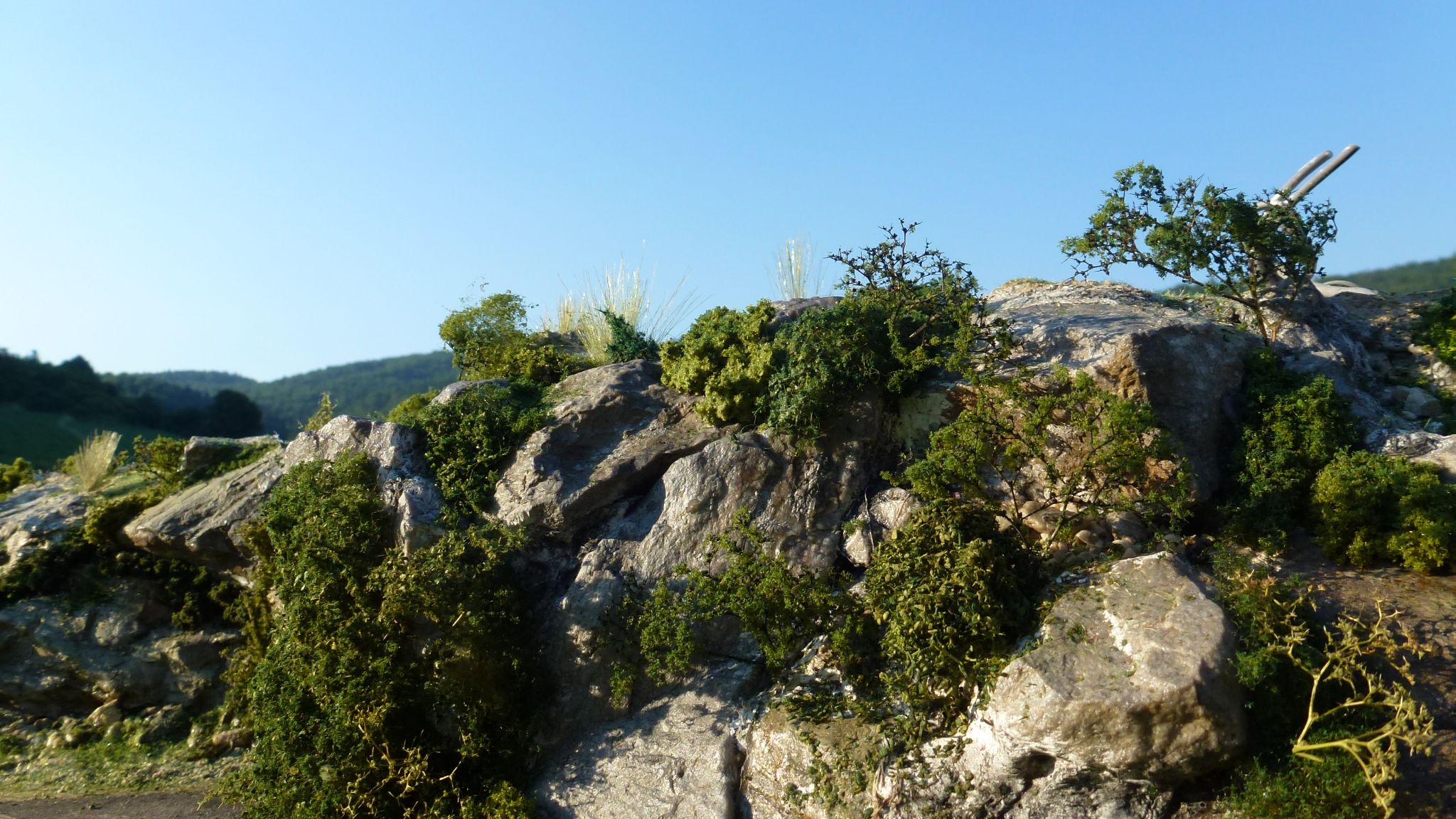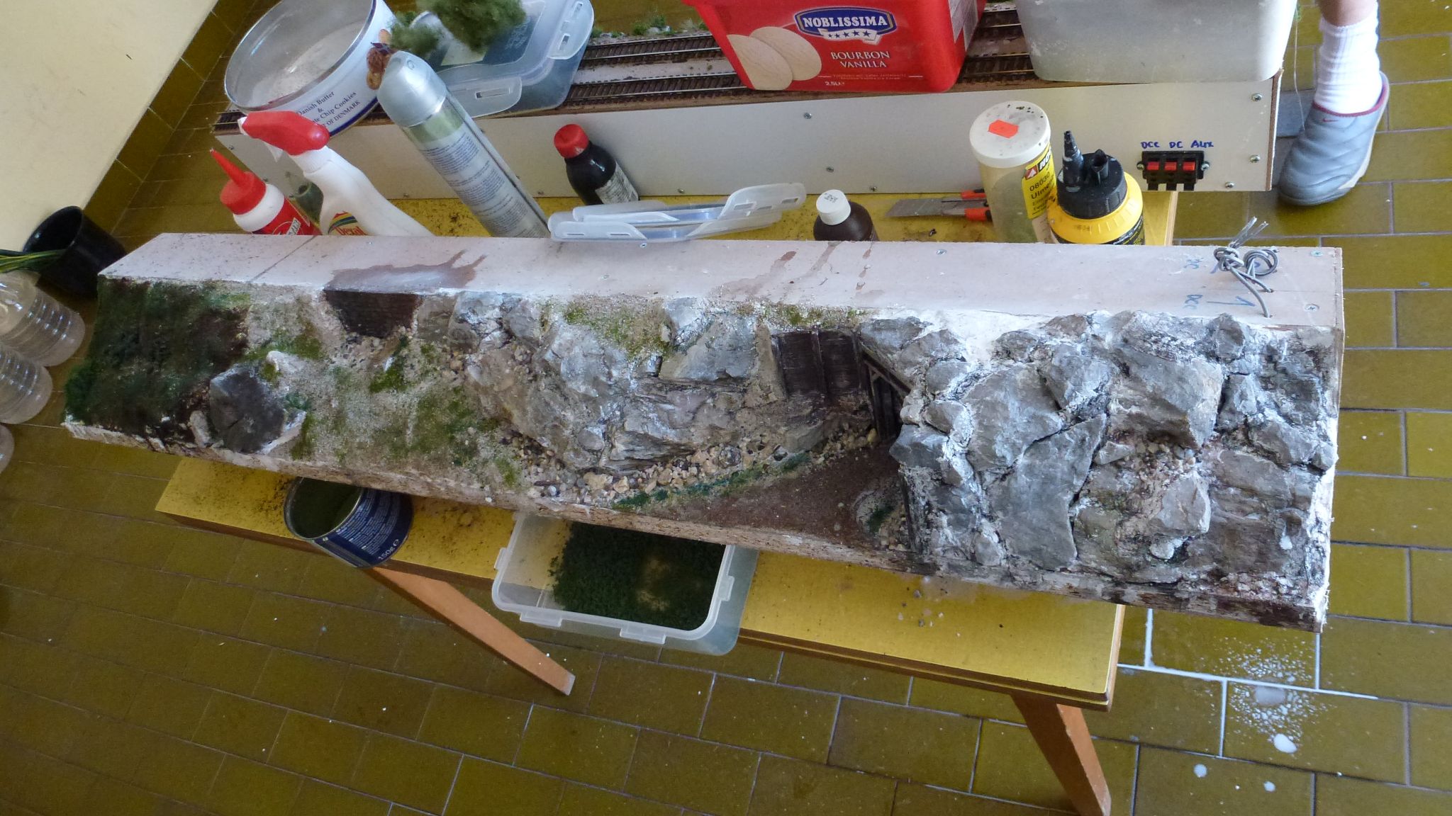 Zaradi fotografiranja lokomotiv in vagonov sem se odločil da izdelam še dodatek k diorami naprej od tirov. Odločil sem se za hrib kateri iz leve proti desni strani raste. Zamišljeno je bilo tako da je na levi strani gozd kateri se potem proti desno dviguje z hribom in gre za njim, tako da na vrhu hriba je gozd za njim. Začetek je vedno z stiroporjem in mavčnimi povoji. Skale, nekaj pravih, nehaj umetnih sem nalimal na stiroporno podlago, okoli njih in čez ves stiropor pa dal mavčne povoje.