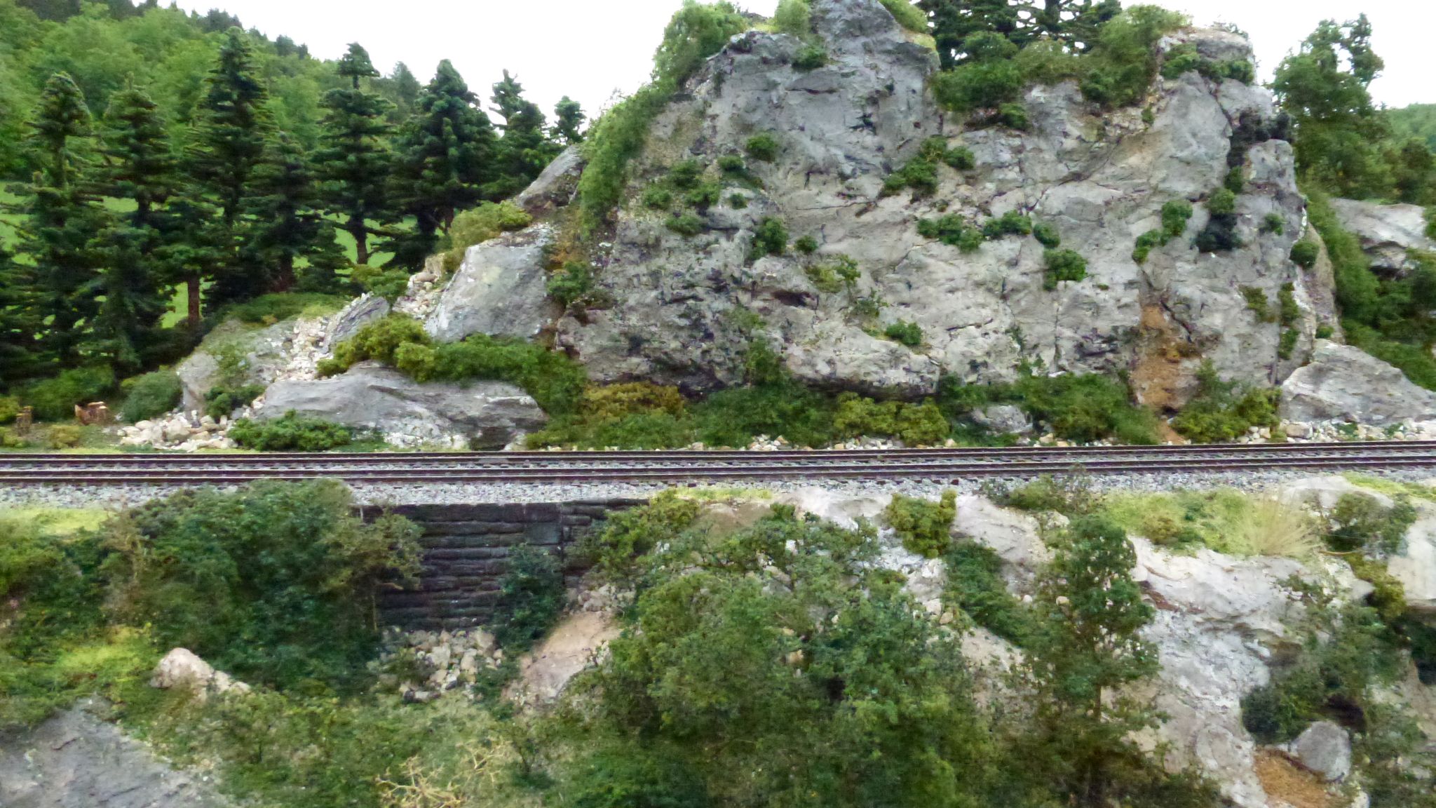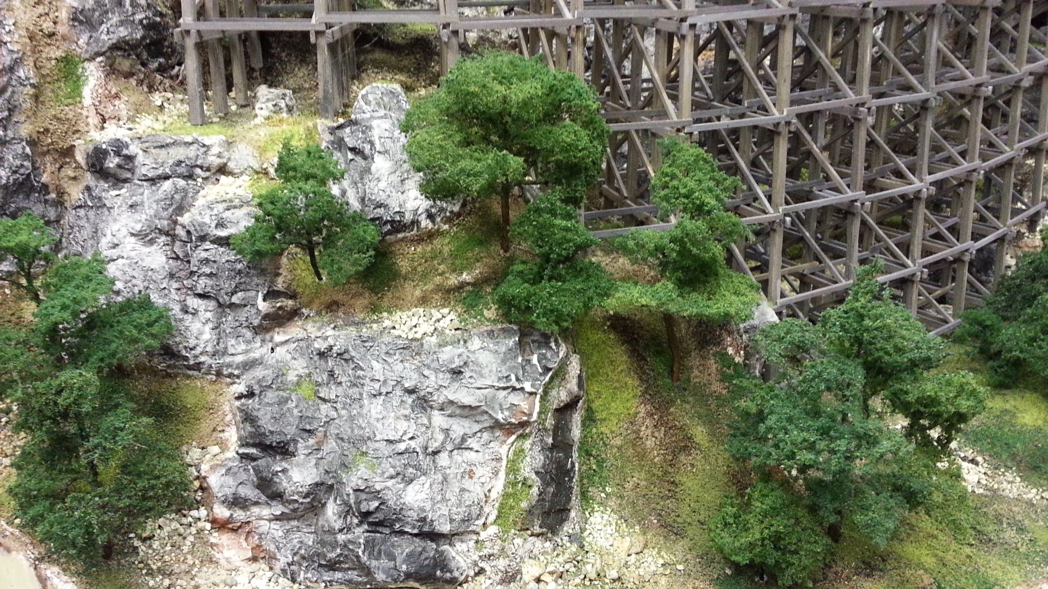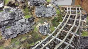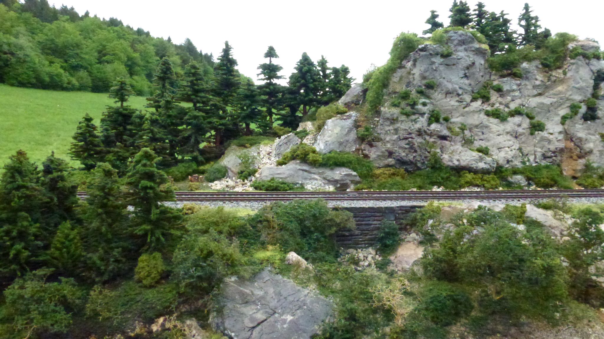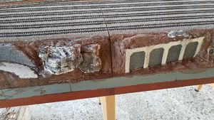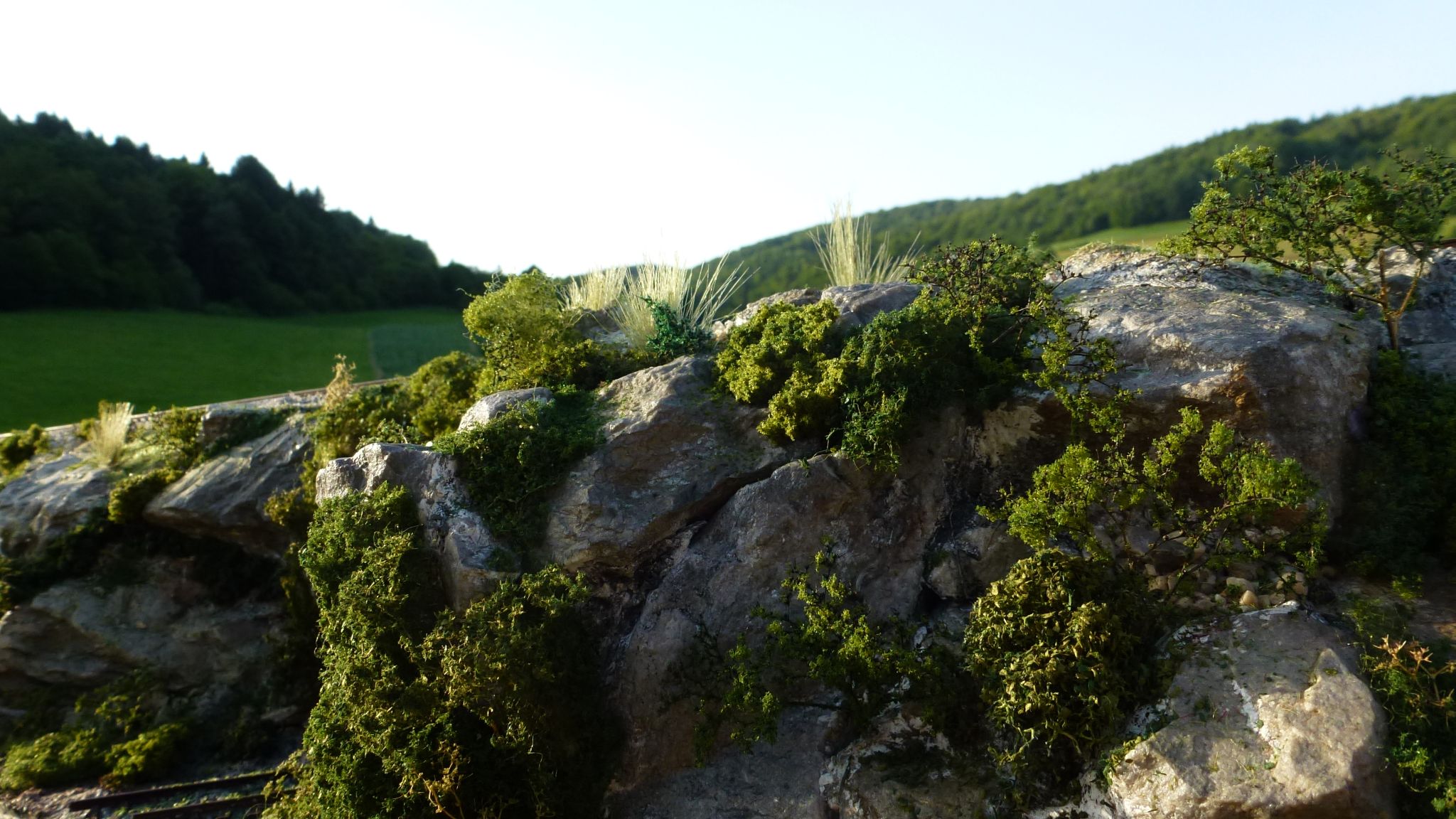 Zaradi fotografiranja lokomotiv in vagonov sem se odločil da izdelam še dodatek k diorami naprej od tirov. Odločil sem se za hrib kateri iz leve proti desni strani raste. Zamišljeno je bilo tako da je na levi strani gozd kateri se potem proti desno dviguje z hribom in gre za njim, tako da na vrhu hriba je gozd za njim. Začetek je vedno z stiroporjem in mavčnimi povoji. Skale, nekaj pravih, nehaj umetnih sem nalimal na stiroporno podlago, okoli njih in čez ves stiropor pa dal mavčne povoje.