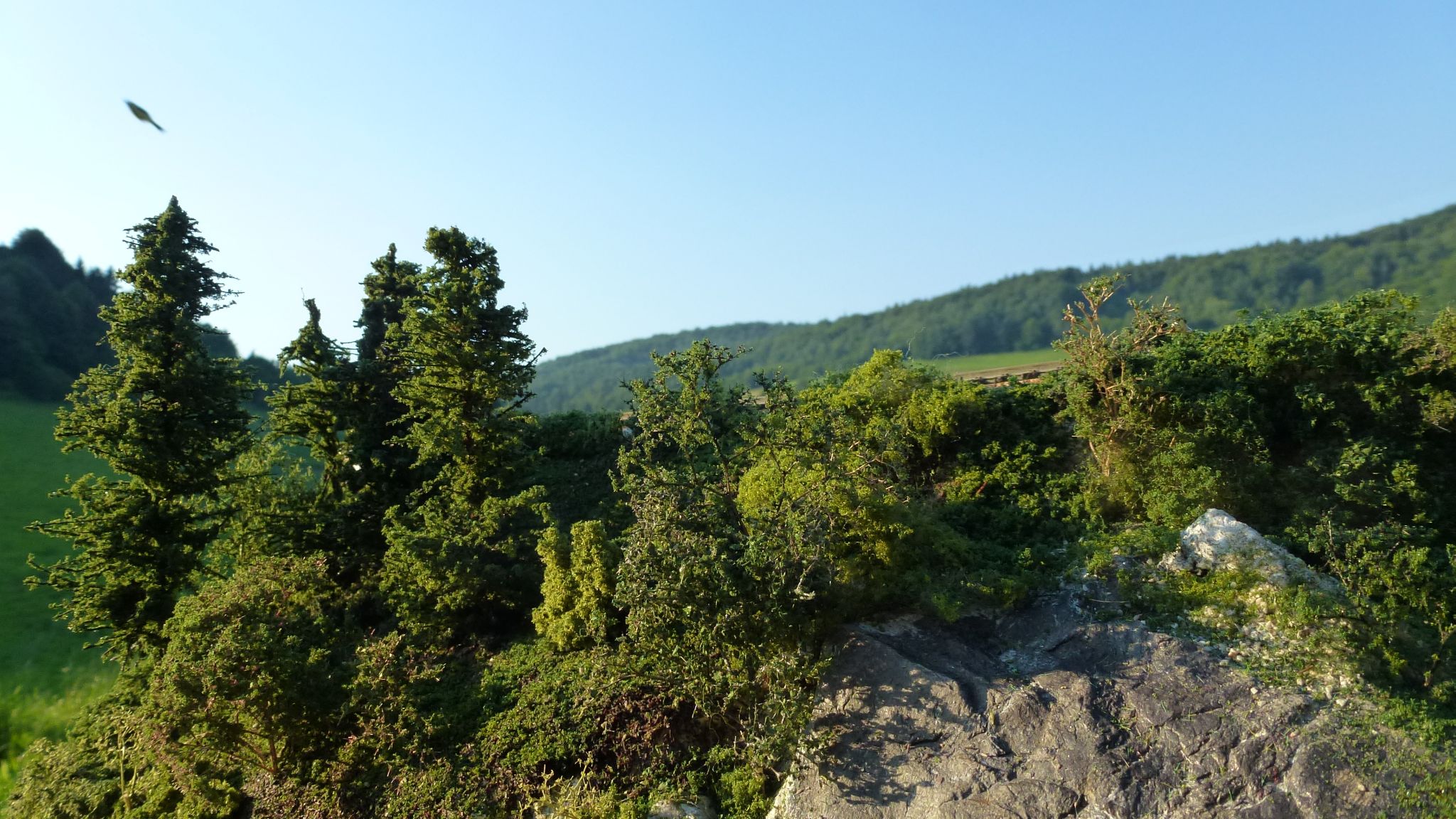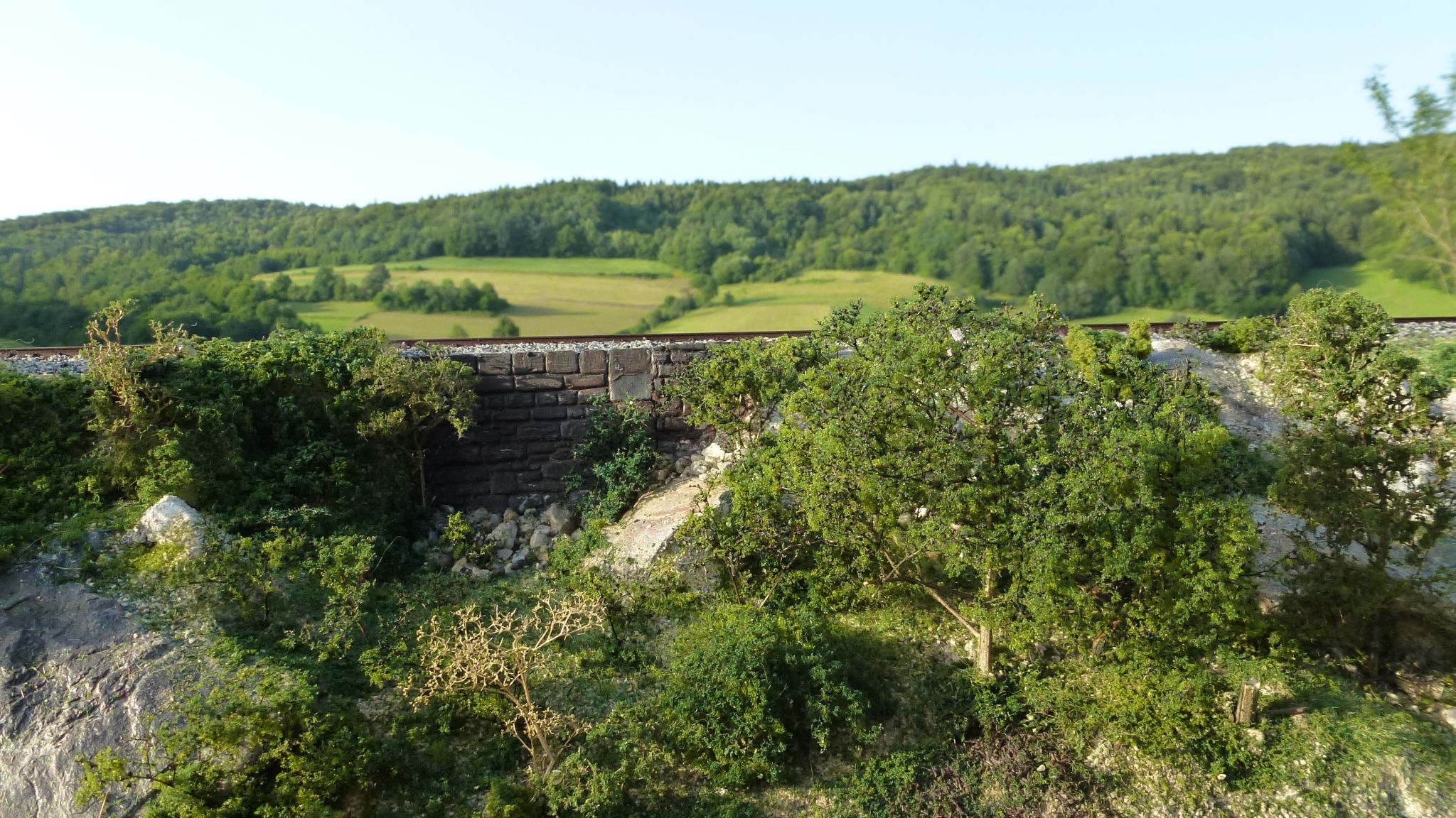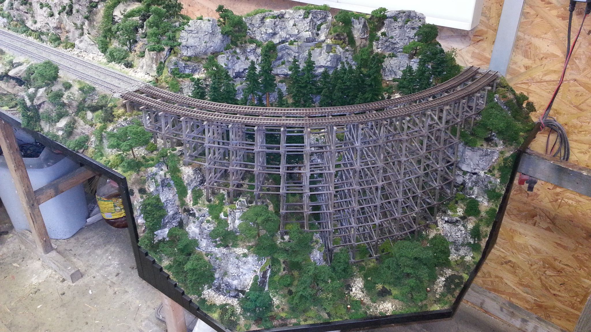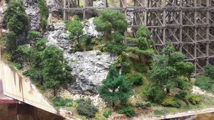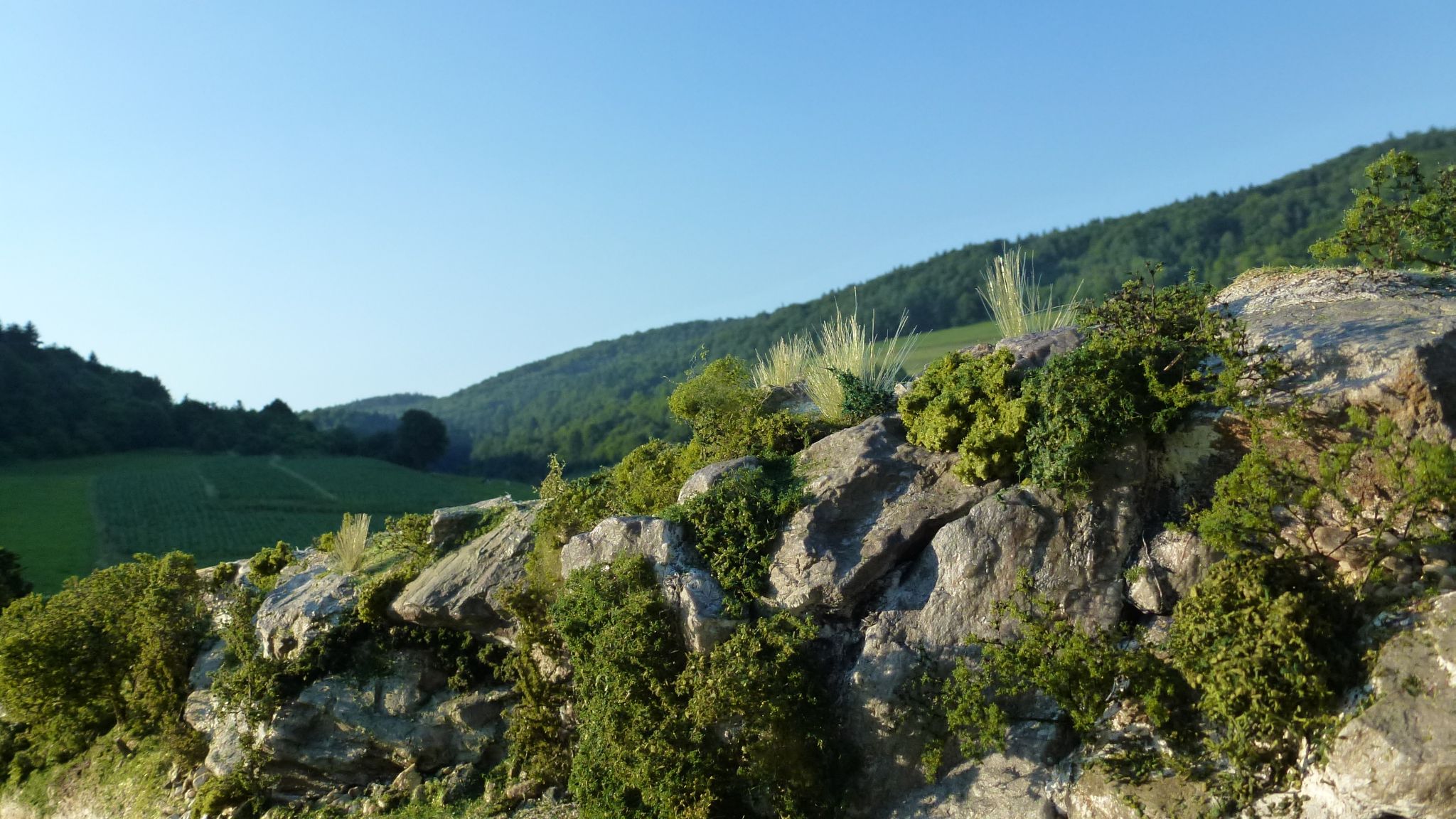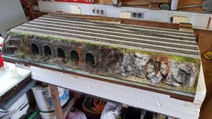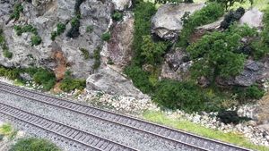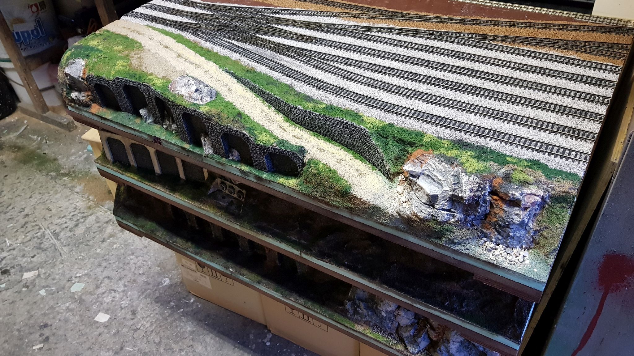 Zaradi fotografiranja lokomotiv in vagonov sem se odločil da izdelam še dodatek k diorami naprej od tirov. Odločil sem se za hrib kateri iz leve proti desni strani raste. Zamišljeno je bilo tako da je na levi strani gozd kateri se potem proti desno dviguje z hribom in gre za njim, tako da na vrhu hriba je gozd za njim. Začetek je vedno z stiroporjem in mavčnimi povoji. Skale, nekaj pravih, nehaj umetnih sem nalimal na stiroporno podlago, okoli njih in čez ves stiropor pa dal mavčne povoje.