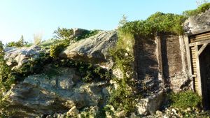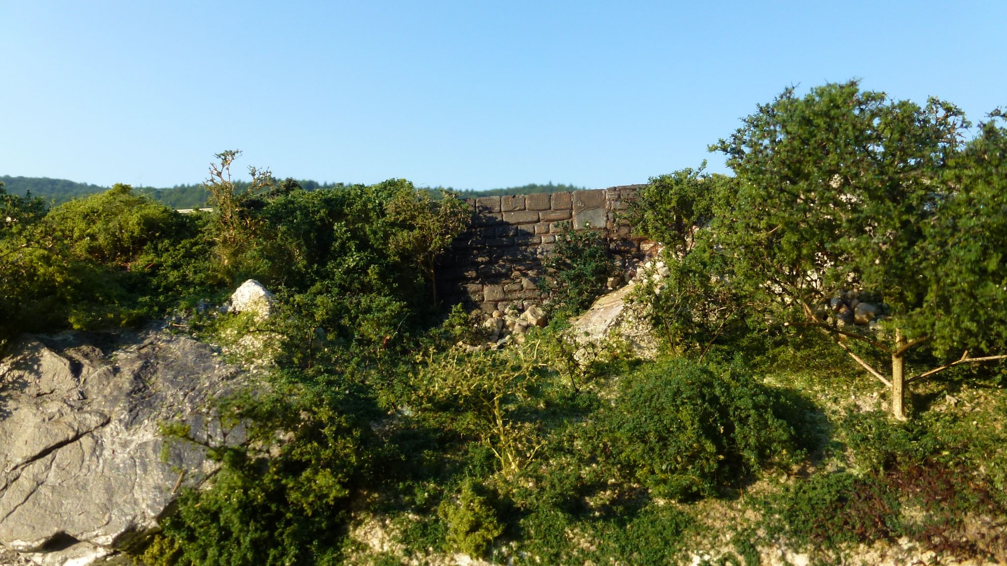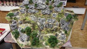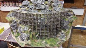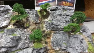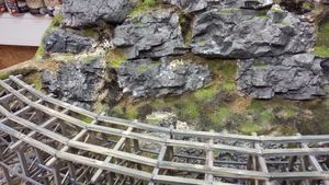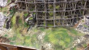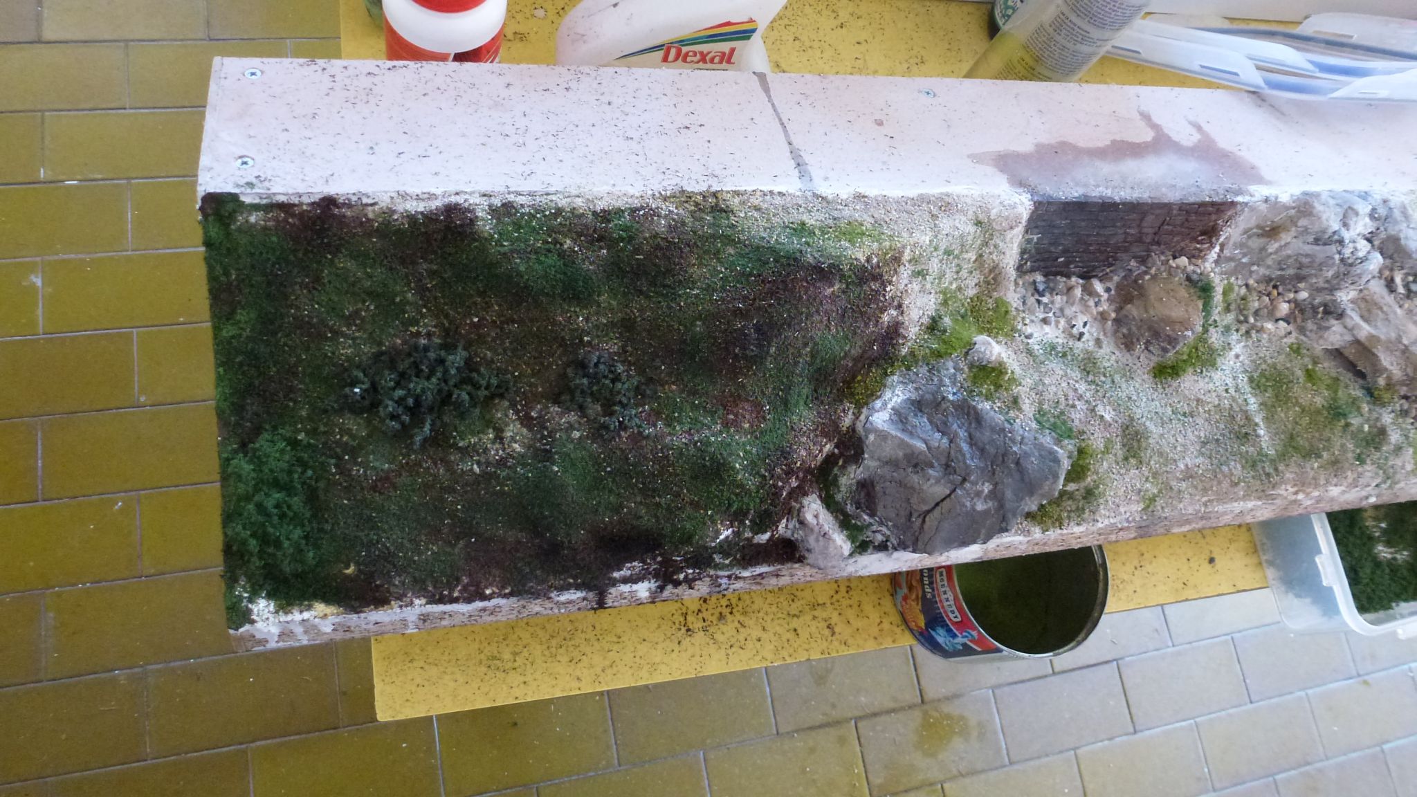 Celotno mavčno površino scen pred yardom sem pobarval. Tam kjer je zemlja sem prebarvar z rjavo, skale sem prebarval v sivo rjavkaste odtenke in seveda skušal narediti maksimalen efekt skal, škarpe so pa tudi prebarvane. Betonske z Woodlandovo barvo betona katero sem z razredčenim tušem še toniral.