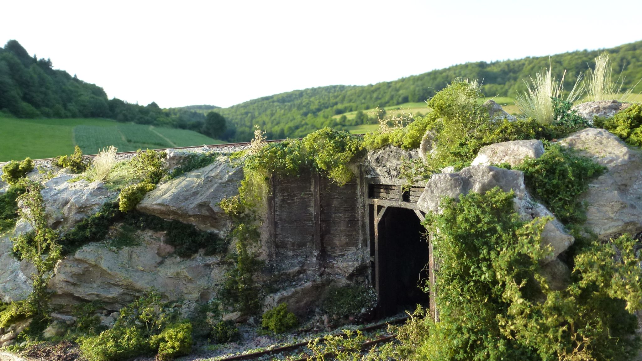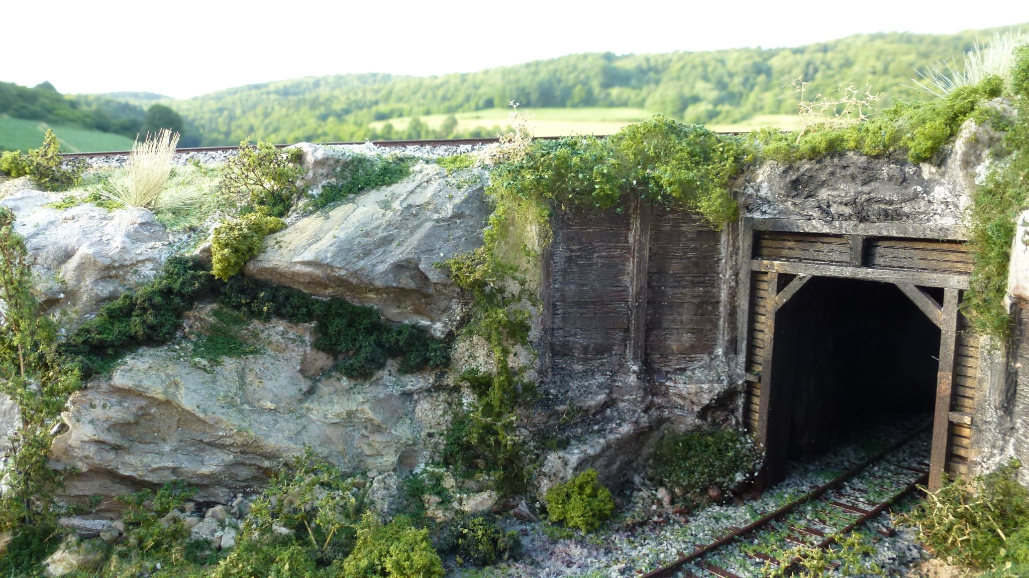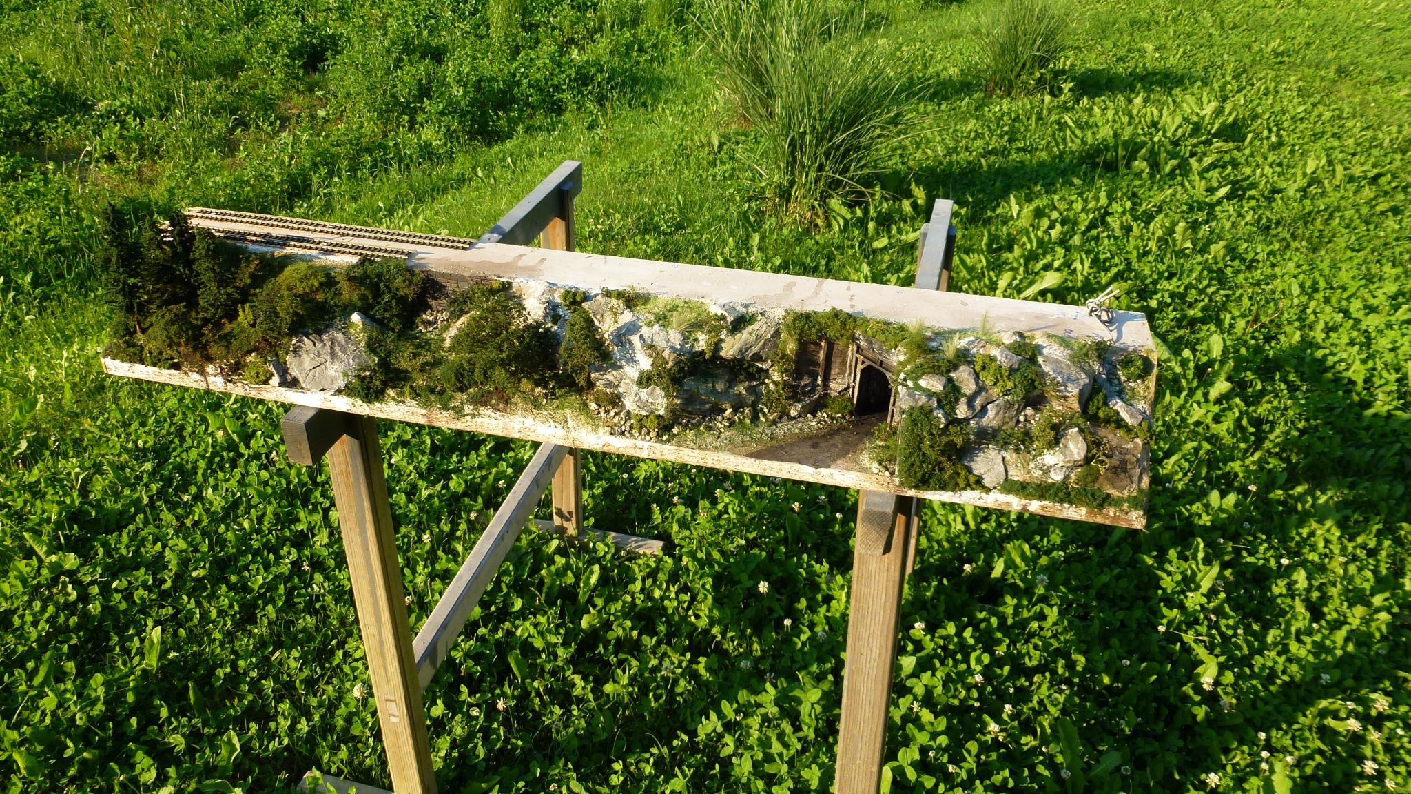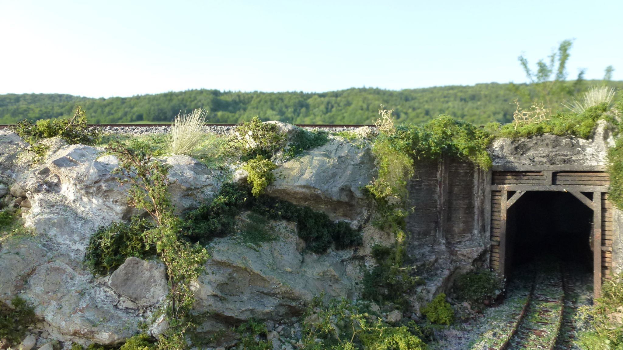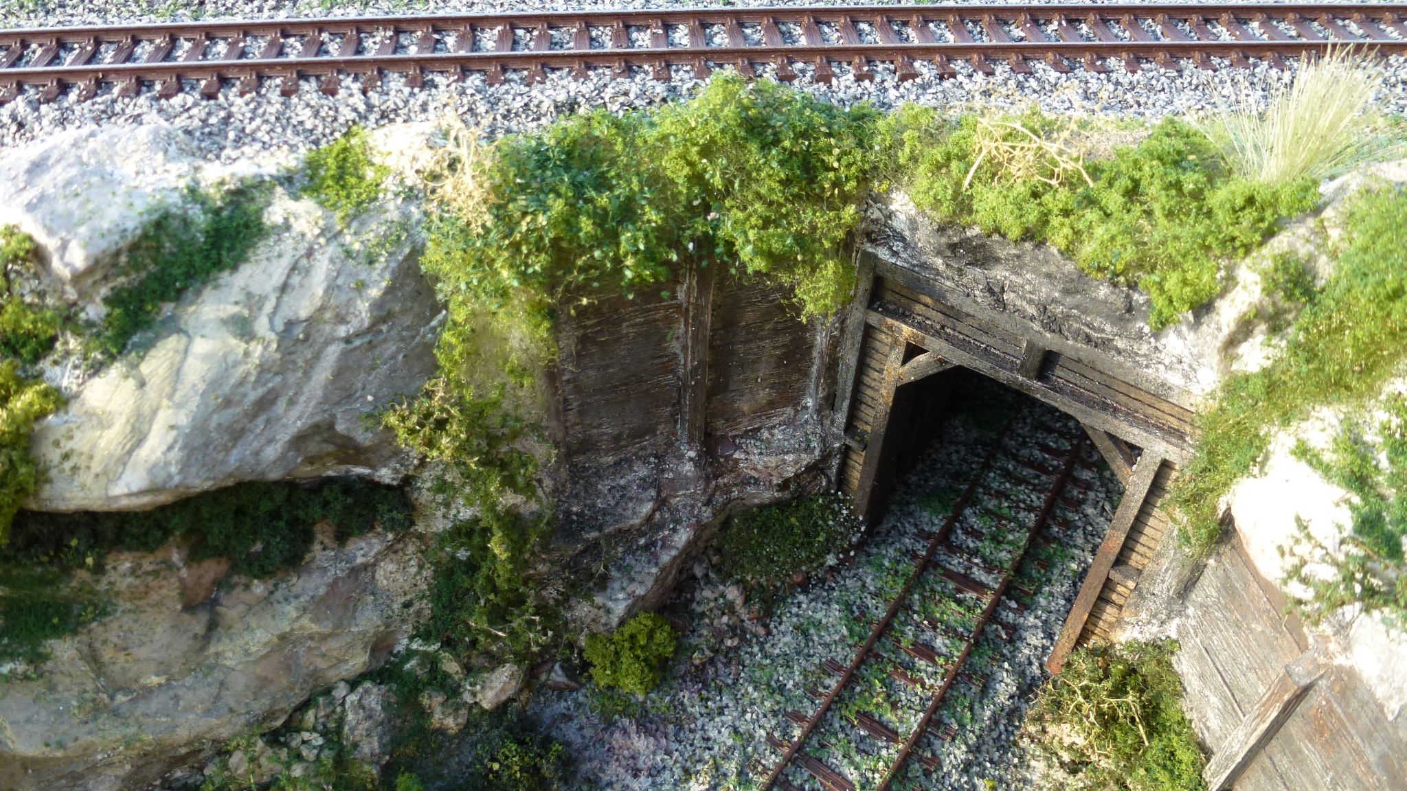 Na dioramo sem vgradil tudi opuščeni tunel, ki poteka pod glavno progo. Tunel je znotraj obložen z skalami katere sem prebarval skoraj na črno barvo, zaradi dima parnih lokomotiv.
