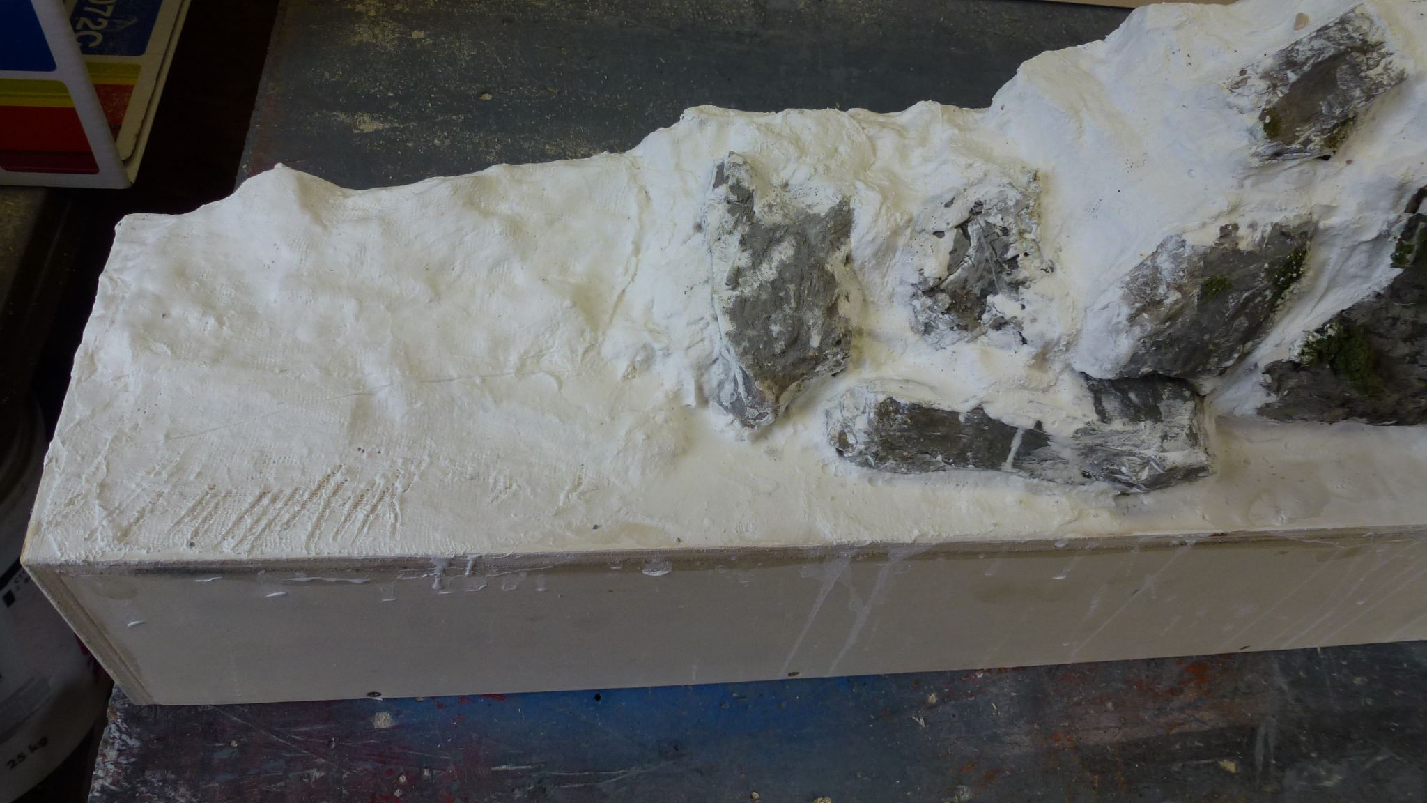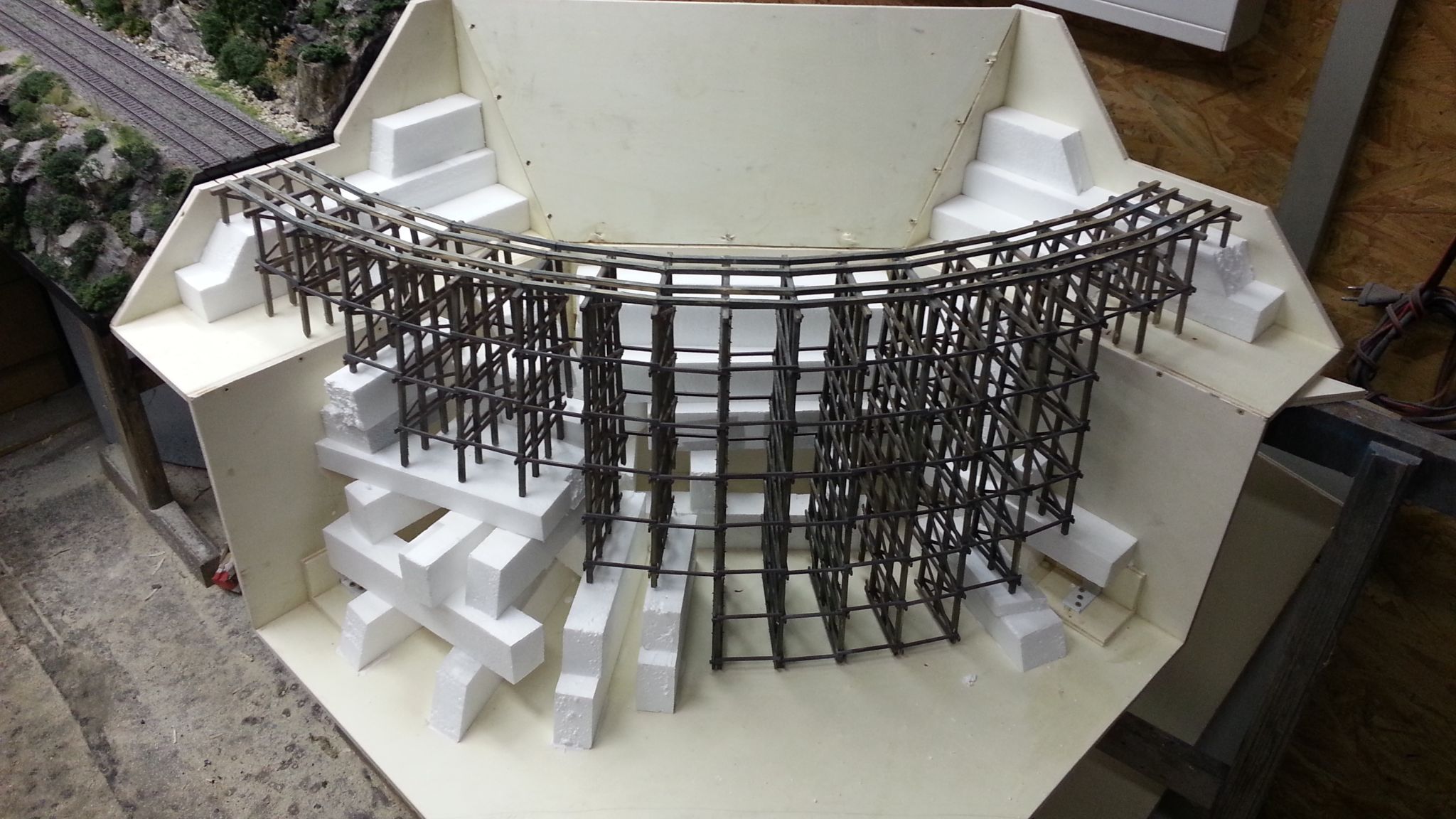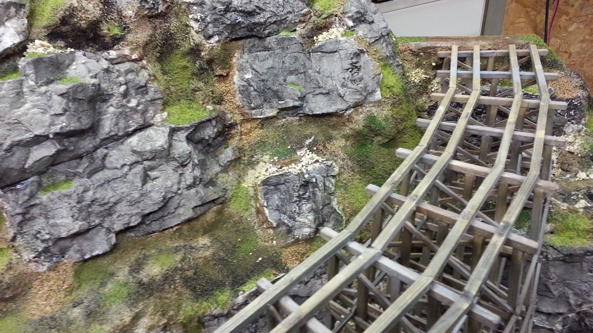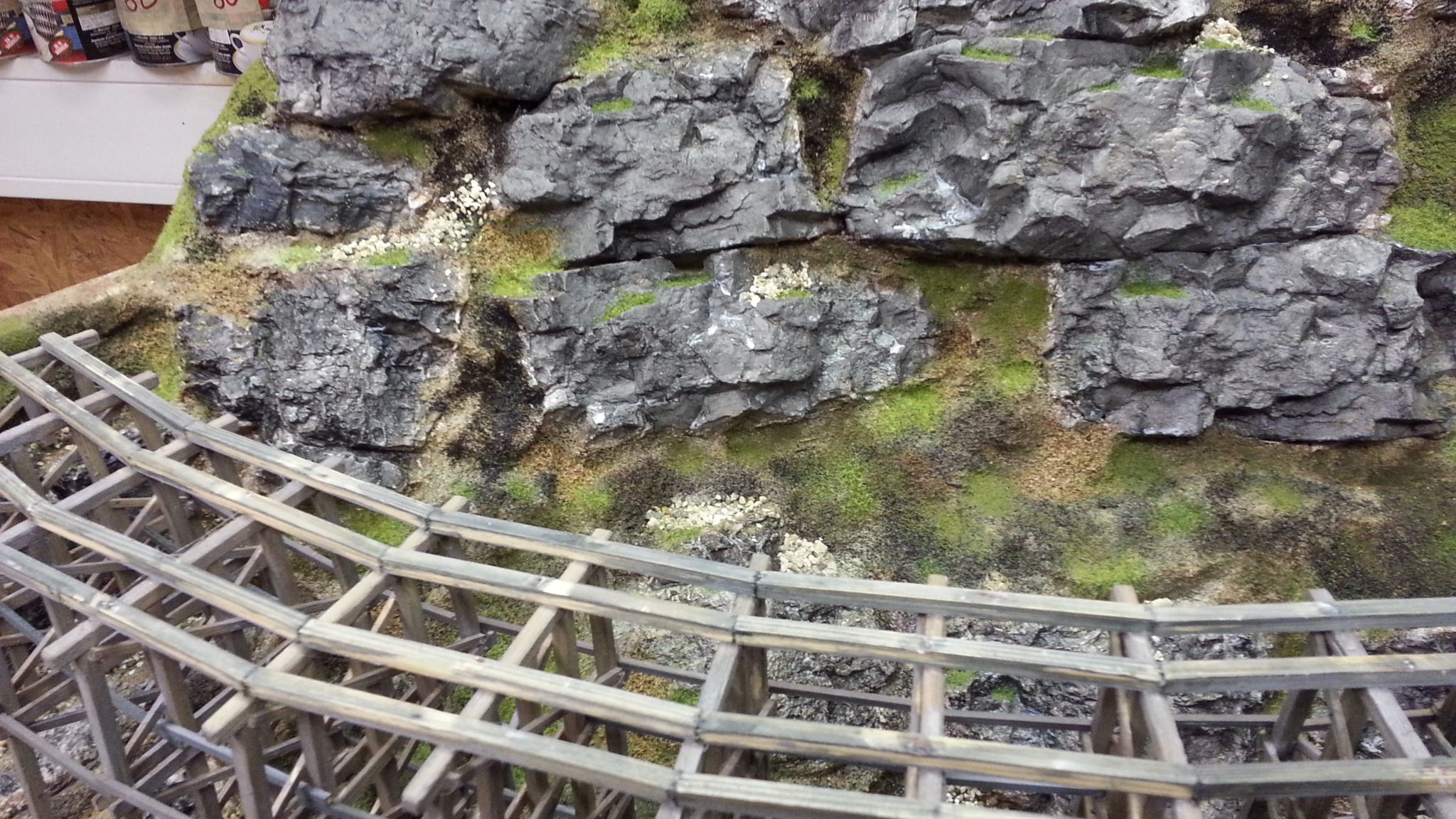 Nadaljeval sem z izdelavo podstavkov na katerih bo most stal. Naredil sem jih iz stiroporja, zatem sem vse luknje okoli nekako z stiroporjem zapolnil, z vročim lepilom zalimal in oblikoval skale katere sem naknadno utrdil tudi še z mizarskim lepilom. Prazen prostor med skalami zapolnite ponovno z stiroporjem. Vse preveč ravne dele tudi prelimajte z grobimi stiropornimi odpadki. Zatem prihaja na vrsto gipsanje. Mavčne povoje narežite na 10-20cm dolge kose. Vzamite en tak kos, namočite zelo hitro v vodo in ga dajte na mesto kjer želite prekriti stiropor. Ves stiropor morate prekriti z mavčnimi povoji. Ta del je malenkost umazano delo, toda rezultat si poglejte na sliki. Dobili boste lepe skale umes pa povezavo z mavčnimi povoji kateri dodatno utrjujejo same skale.
