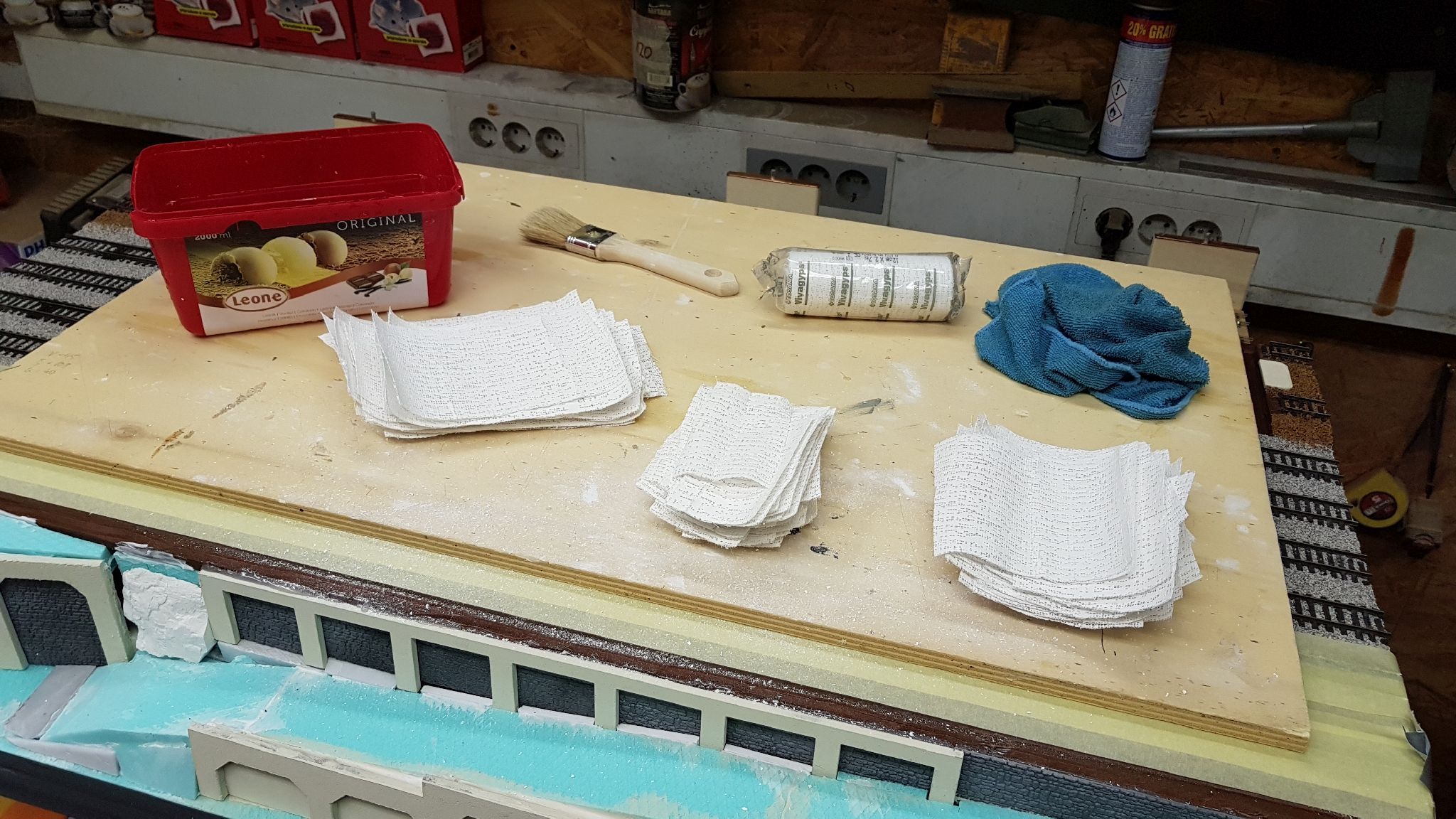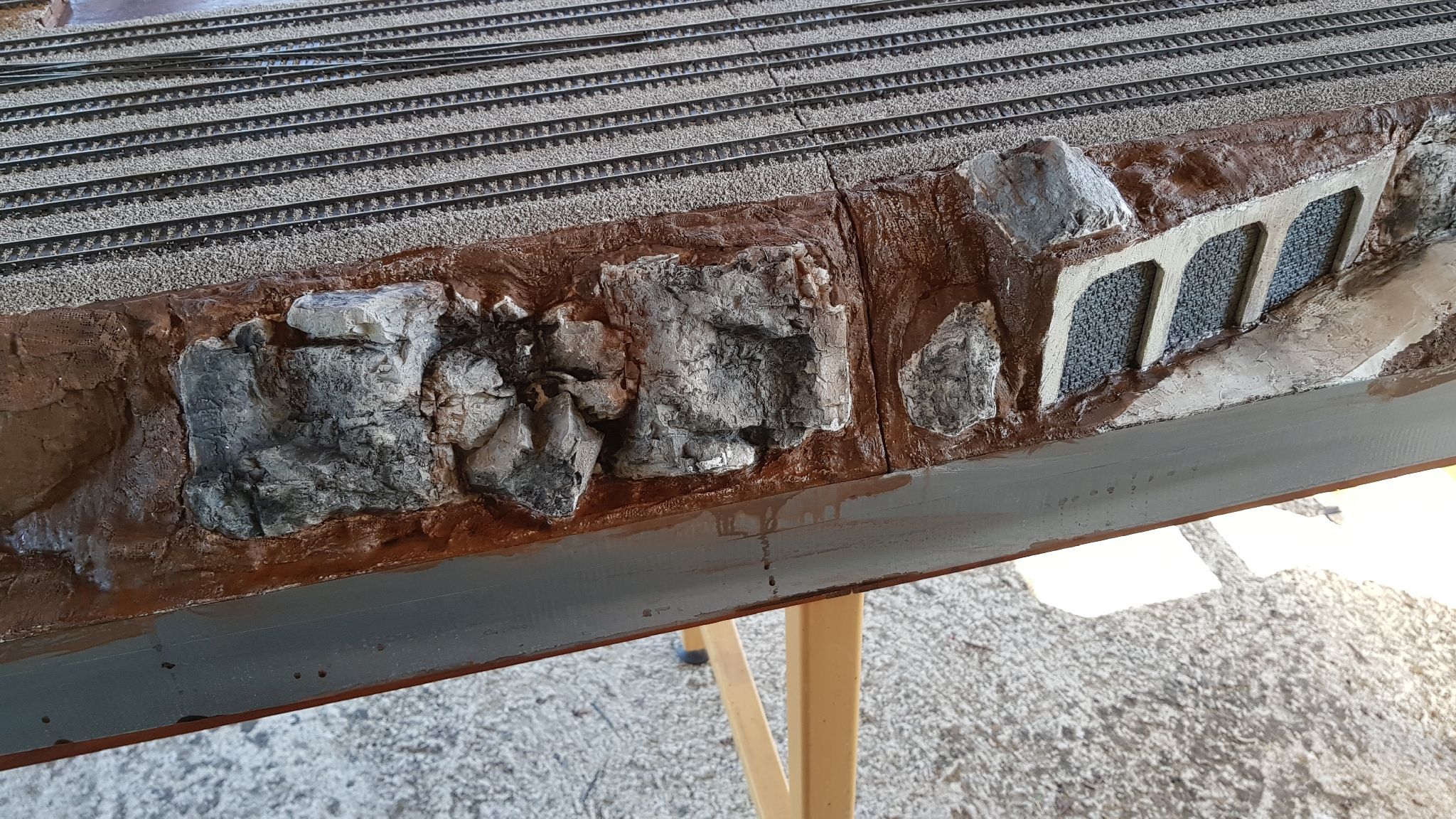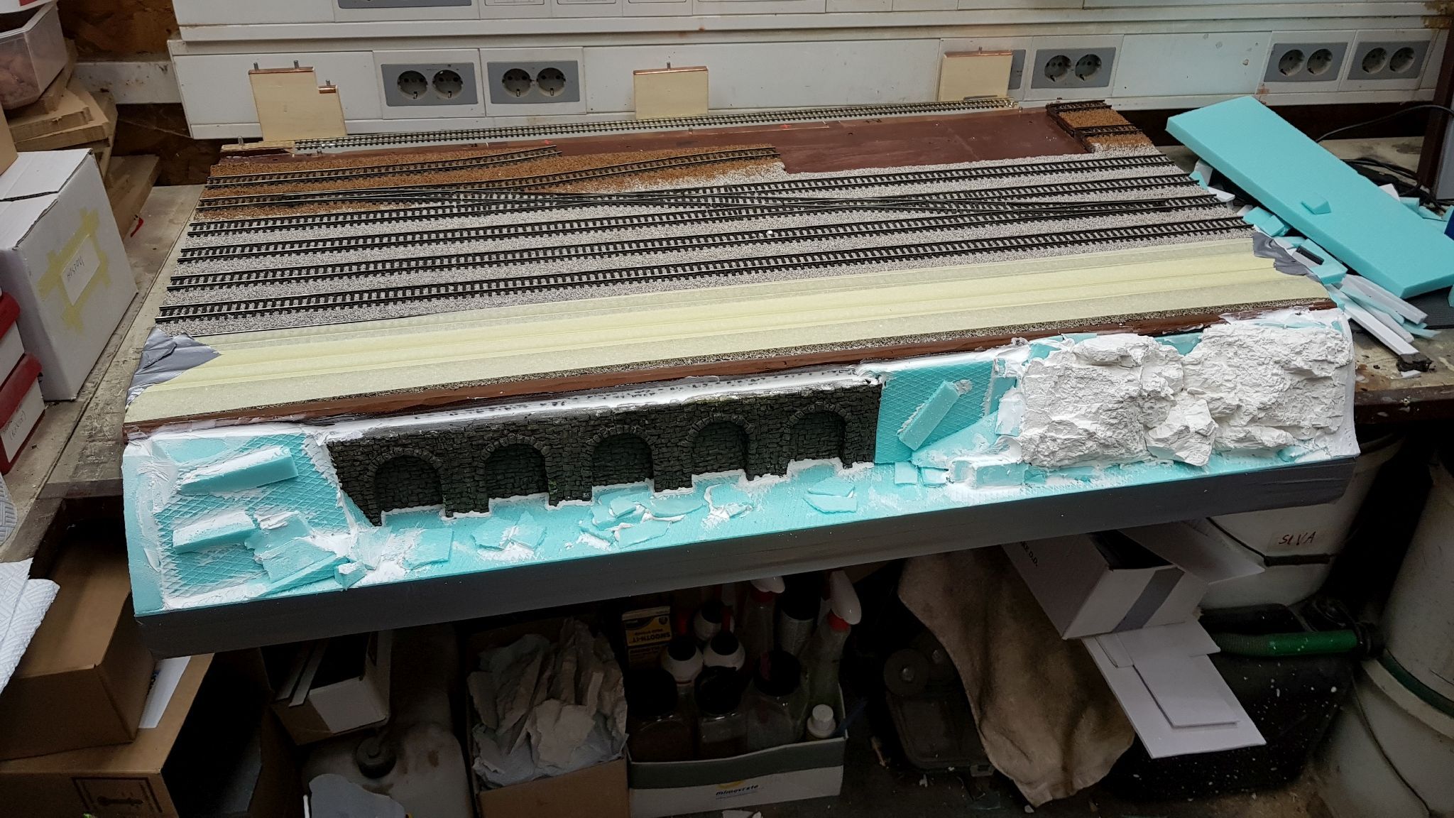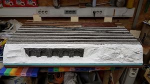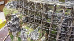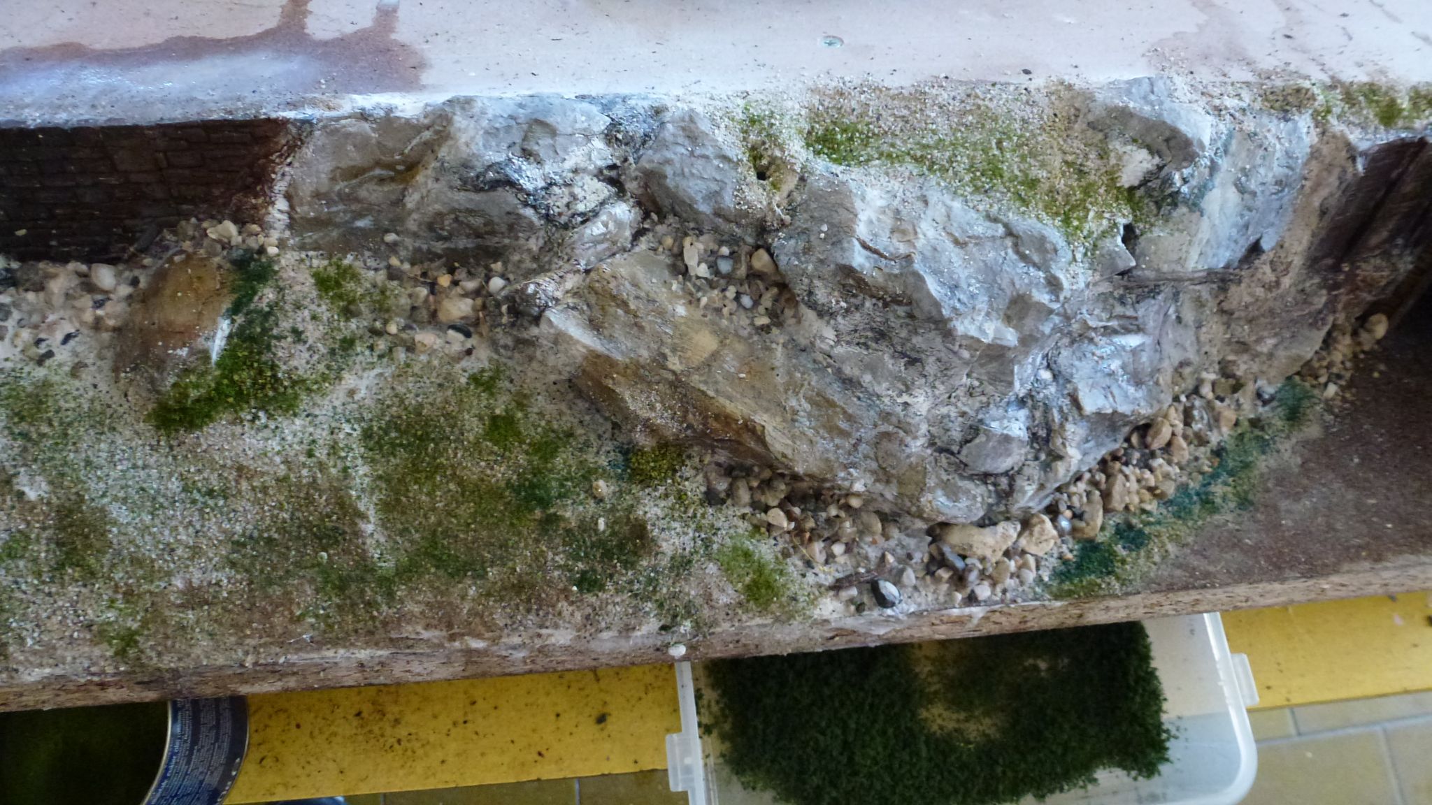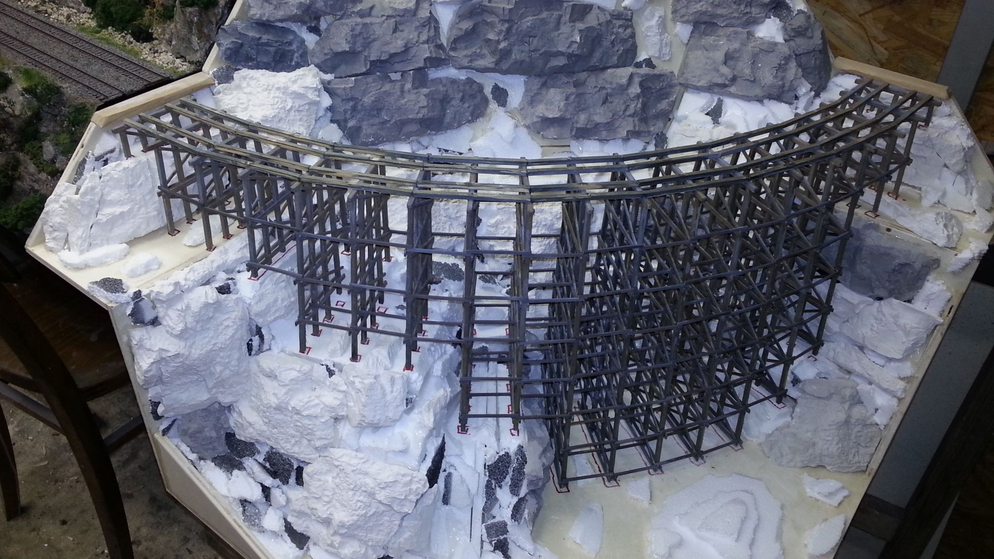 Nadaljeval sem z izdelavo podstavkov na katerih bo most stal. Naredil sem jih iz stiroporja, zatem sem vse luknje okoli nekako z stiroporjem zapolnil, z vročim lepilom zalimal in oblikoval skale katere sem naknadno utrdil tudi še z mizarskim lepilom. Prazen prostor med skalami zapolnite ponovno z stiroporjem. Vse preveč ravne dele tudi prelimajte z grobimi stiropornimi odpadki. Zatem prihaja na vrsto gipsanje. Mavčne povoje narežite na 10-20cm dolge kose. Vzamite en tak kos, namočite zelo hitro v vodo in ga dajte na mesto kjer želite prekriti stiropor. Ves stiropor morate prekriti z mavčnimi povoji. Ta del je malenkost umazano delo, toda rezultat si poglejte na sliki. Dobili boste lepe skale umes pa povezavo z mavčnimi povoji kateri dodatno utrjujejo same skale.