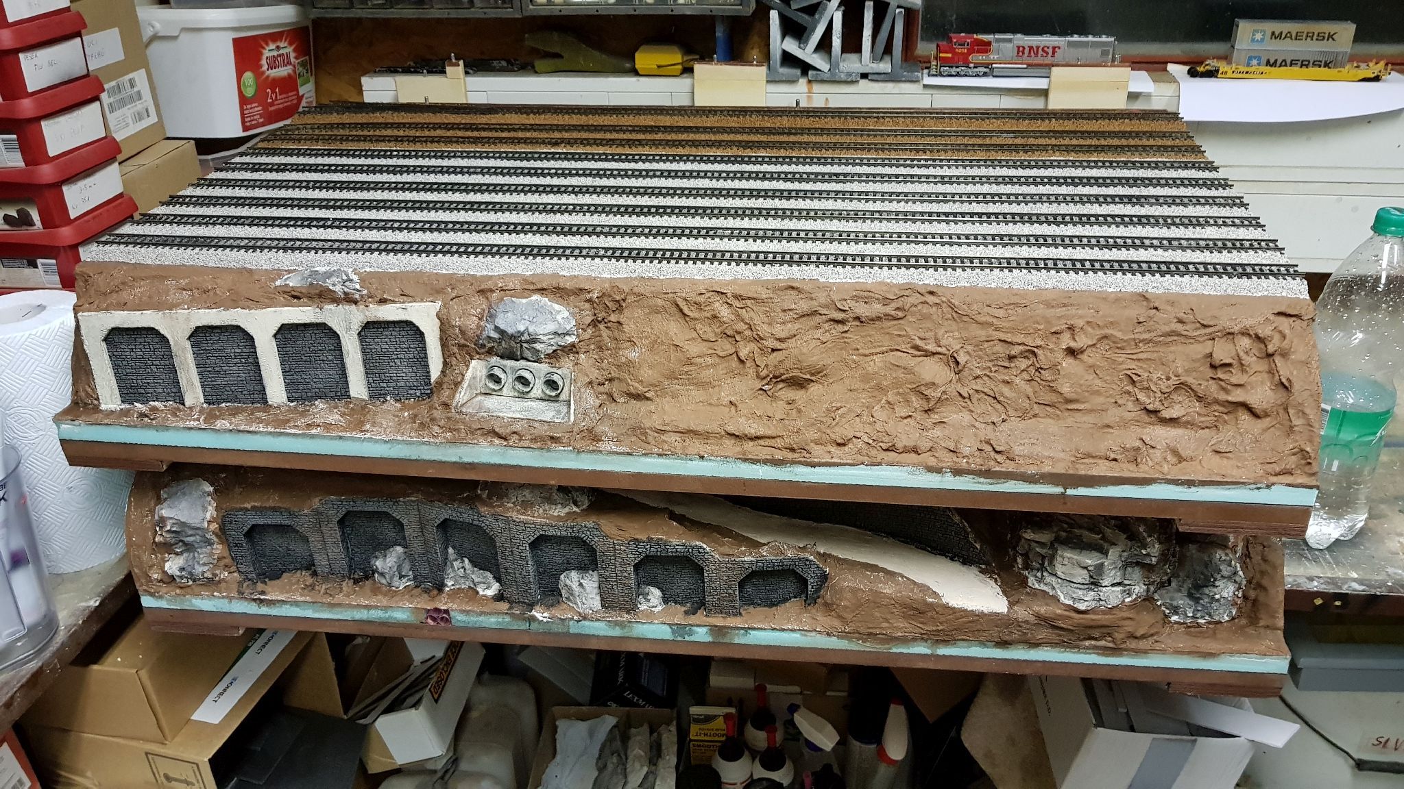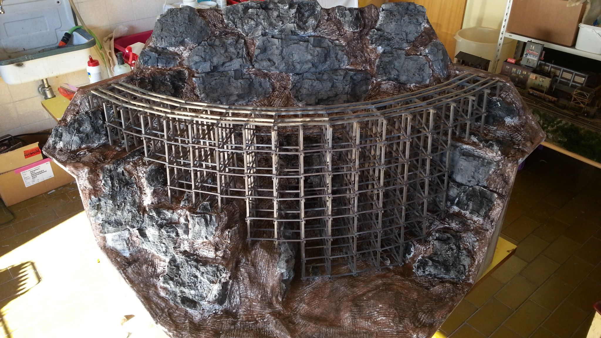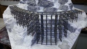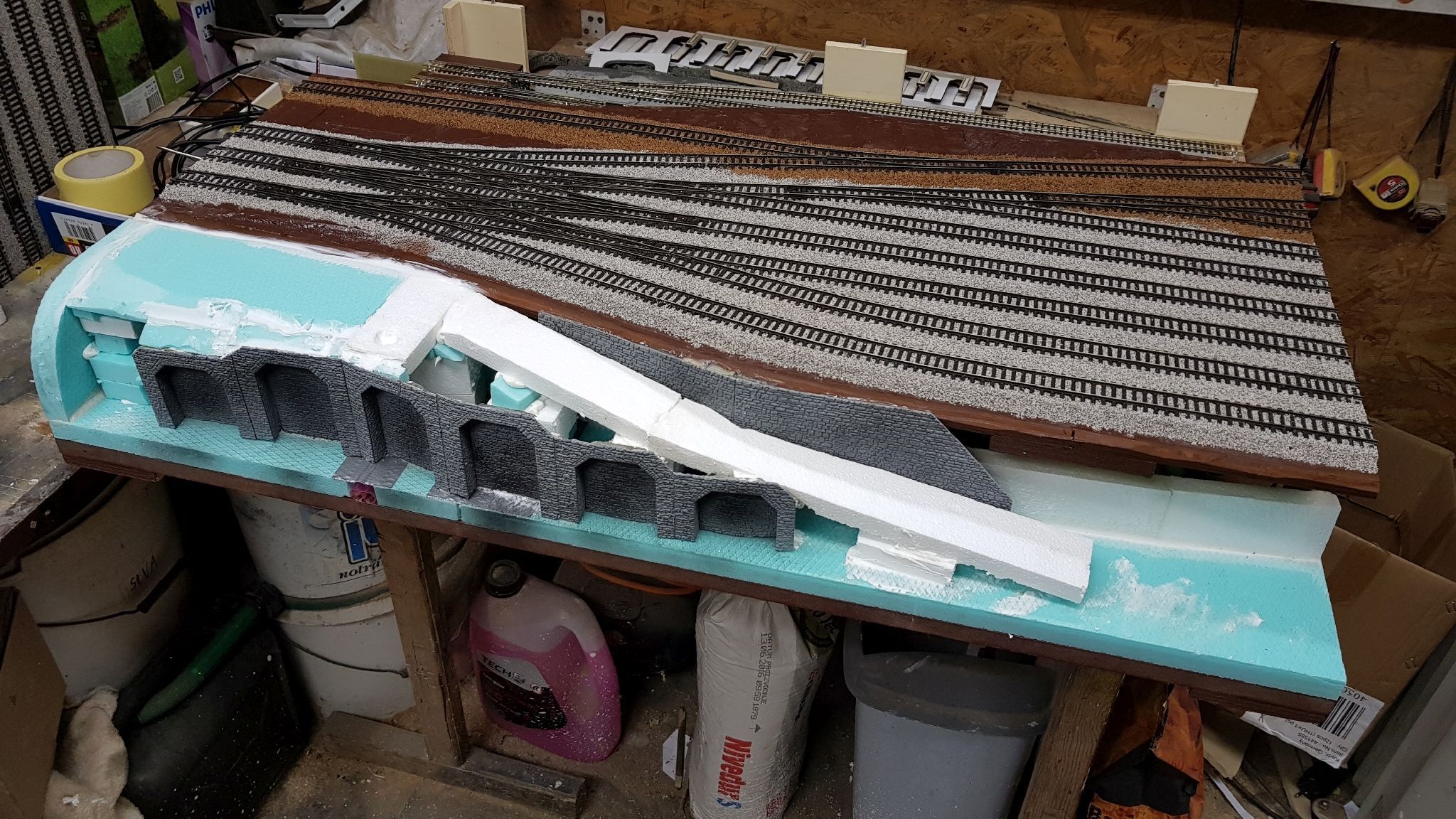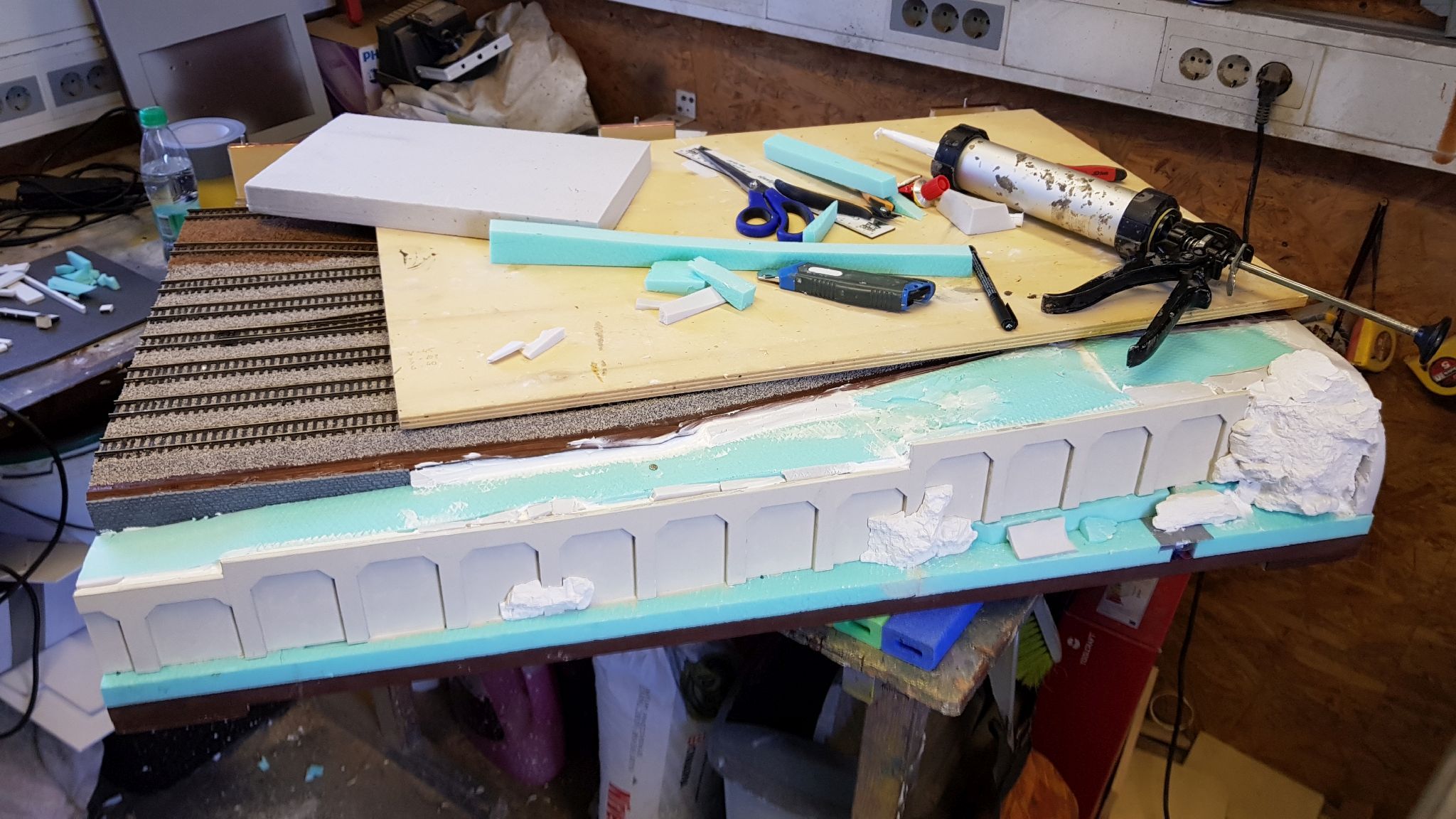 Nadaljeval sem z izdelavo podstavkov na katerih bo most stal. Naredil sem jih iz stiroporja, zatem sem vse luknje okoli nekako z stiroporjem zapolnil, z vročim lepilom zalimal in oblikoval skale katere sem naknadno utrdil tudi še z mizarskim lepilom. Prazen prostor med skalami zapolnite ponovno z stiroporjem. Vse preveč ravne dele tudi prelimajte z grobimi stiropornimi odpadki. Zatem prihaja na vrsto gipsanje. Mavčne povoje narežite na 10-20cm dolge kose. Vzamite en tak kos, namočite zelo hitro v vodo in ga dajte na mesto kjer želite prekriti stiropor. Ves stiropor morate prekriti z mavčnimi povoji. Ta del je malenkost umazano delo, toda rezultat si poglejte na sliki. Dobili boste lepe skale umes pa povezavo z mavčnimi povoji kateri dodatno utrjujejo same skale.