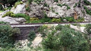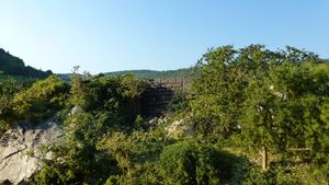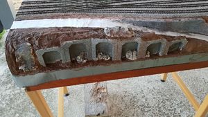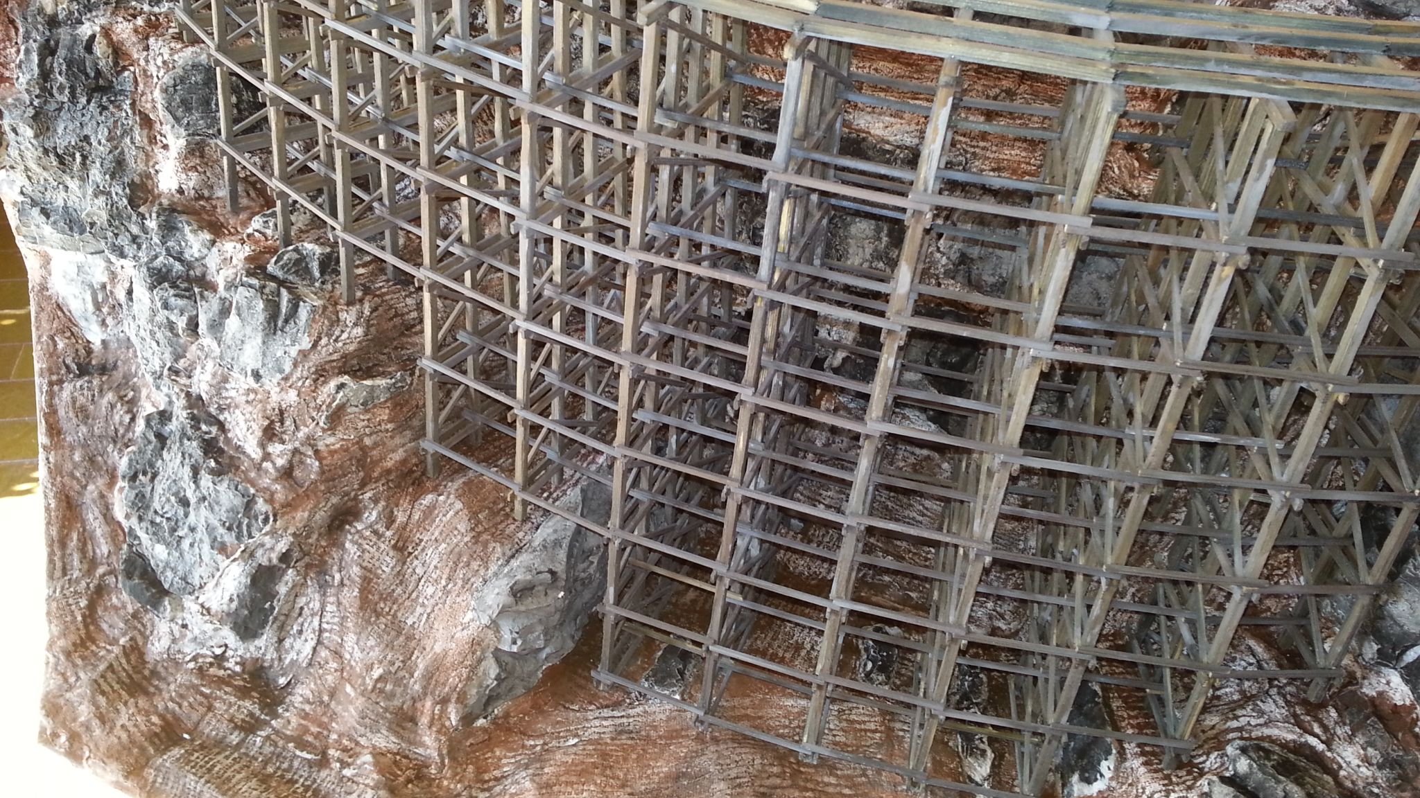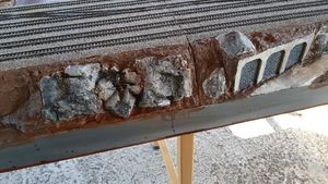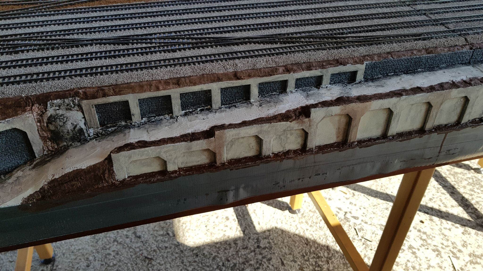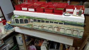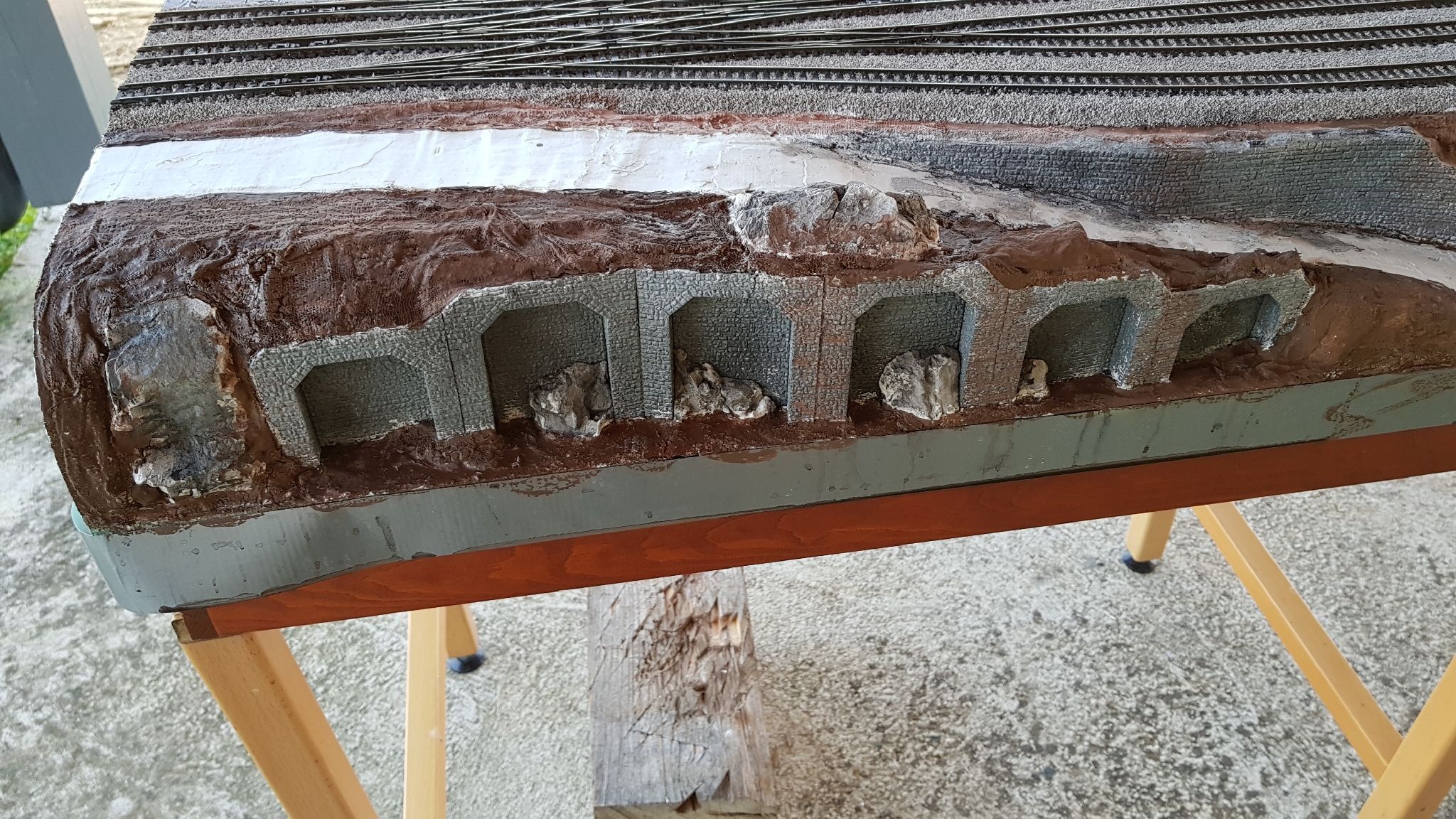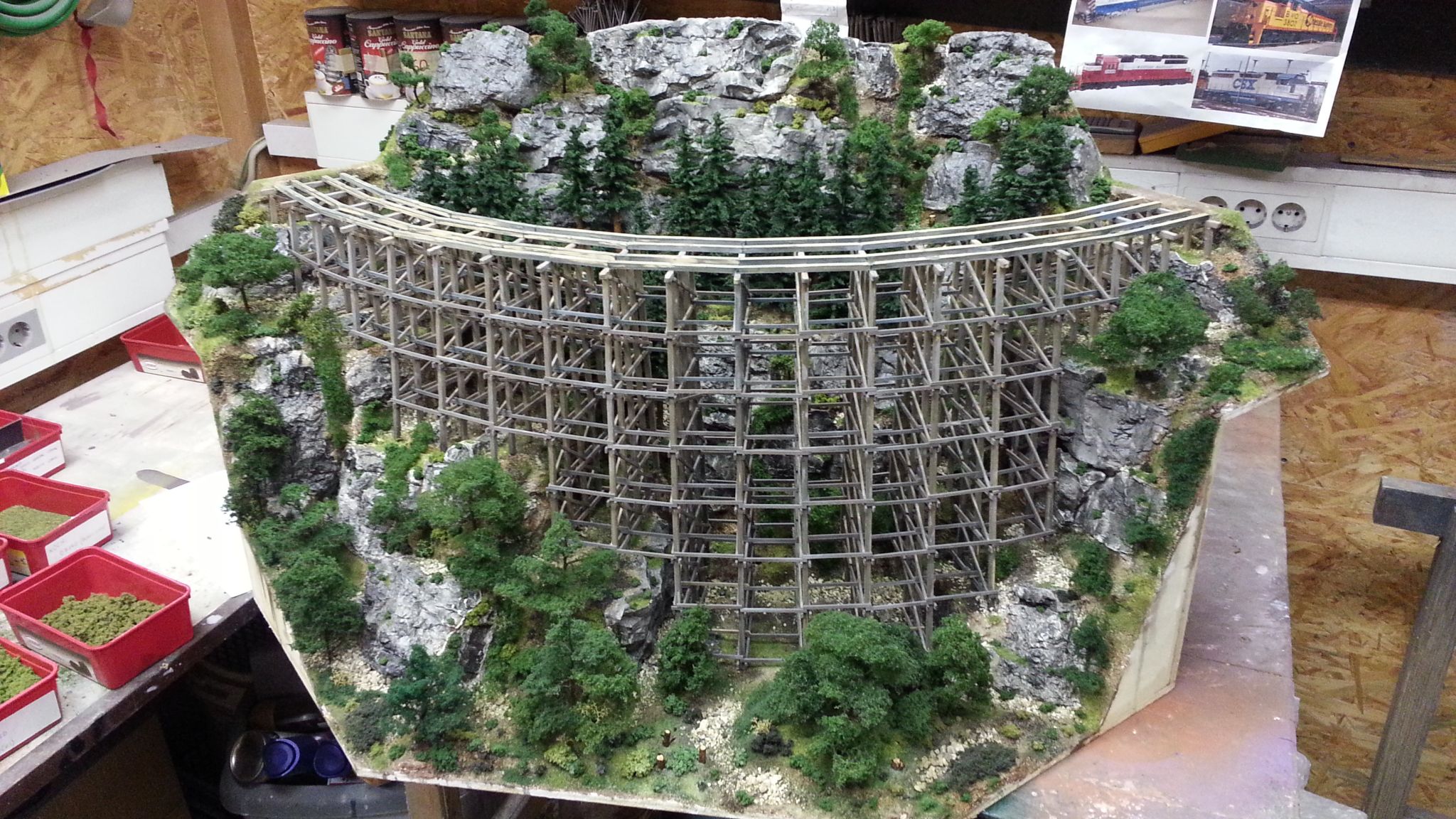 Nadaljeval sem z izdelavo podstavkov na katerih bo most stal. Naredil sem jih iz stiroporja, zatem sem vse luknje okoli nekako z stiroporjem zapolnil, z vročim lepilom zalimal in oblikoval skale katere sem naknadno utrdil tudi še z mizarskim lepilom. Prazen prostor med skalami zapolnite ponovno z stiroporjem. Vse preveč ravne dele tudi prelimajte z grobimi stiropornimi odpadki. Zatem prihaja na vrsto gipsanje. Mavčne povoje narežite na 10-20cm dolge kose. Vzamite en tak kos, namočite zelo hitro v vodo in ga dajte na mesto kjer želite prekriti stiropor. Ves stiropor morate prekriti z mavčnimi povoji. Ta del je malenkost umazano delo, toda rezultat si poglejte na sliki. Dobili boste lepe skale umes pa povezavo z mavčnimi povoji kateri dodatno utrjujejo same skale.