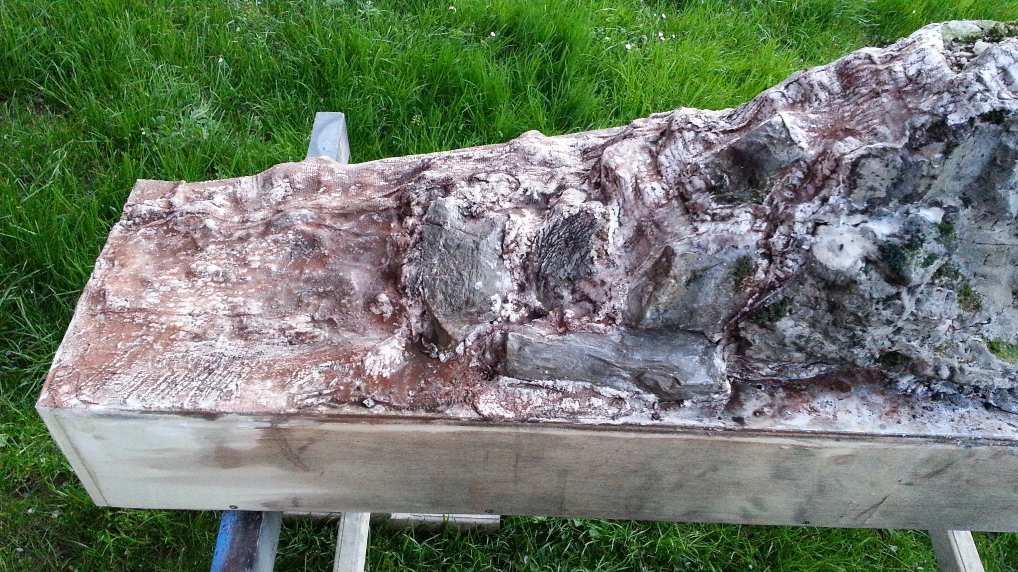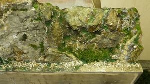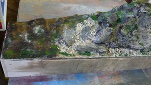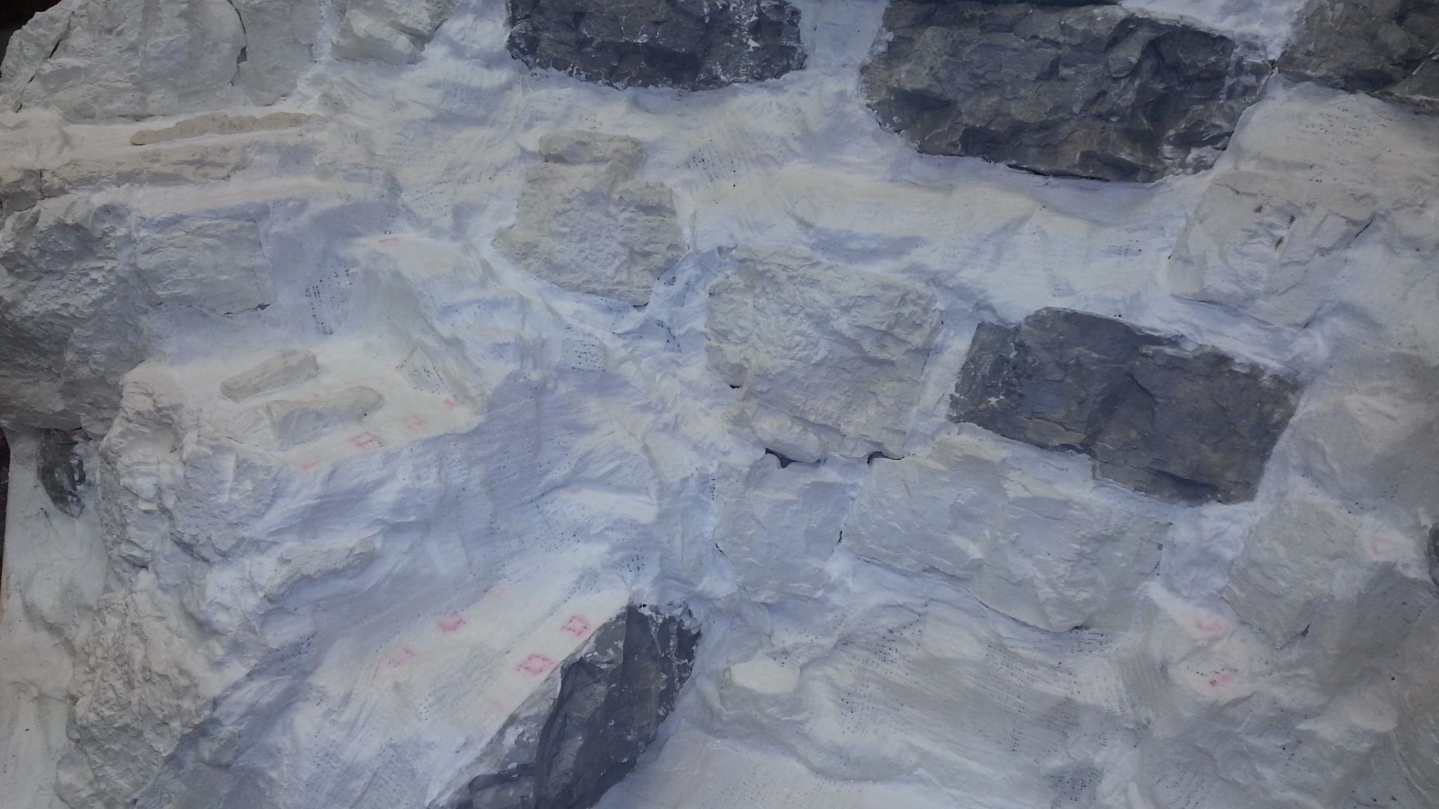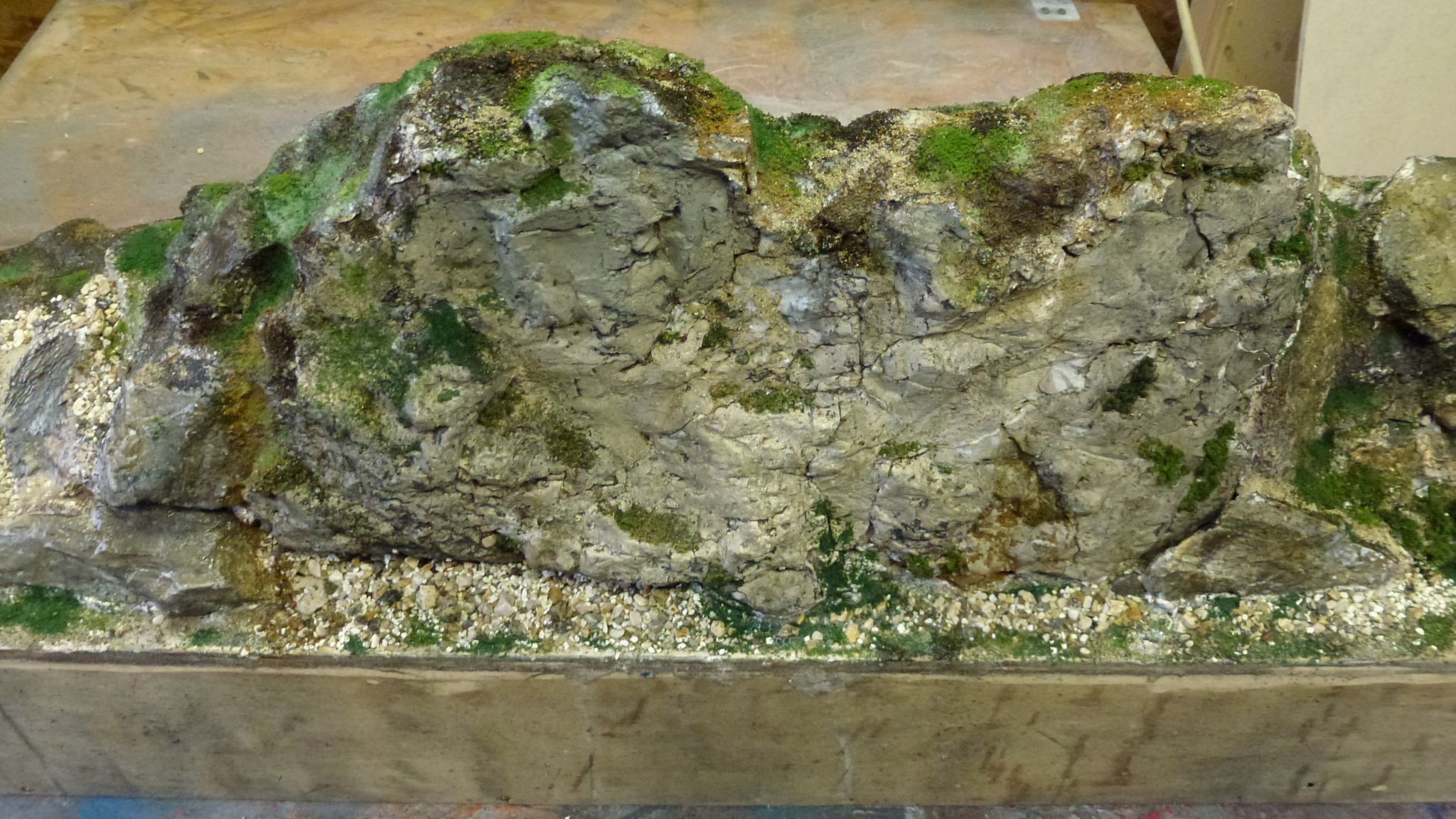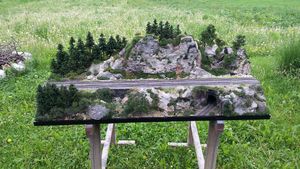 Ko se mavčni povoj posuši je na vrsti barvanje skal. Uporabljal sem črno in rjavo barvo za pridobivanje čimbolj realne barve naravnih skal. Ko se barve posušijo so na vrsti male skale, ter razno odpadlo kamenje. Sledi podlaga v gozdu in travnikih, torej razni rjavi, oker in zeleni posipi.