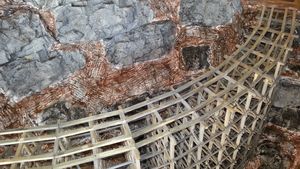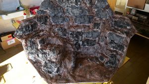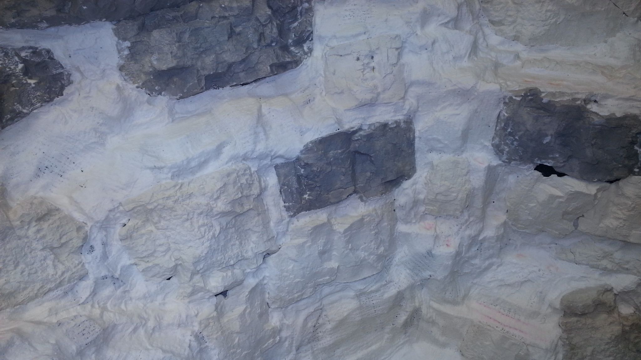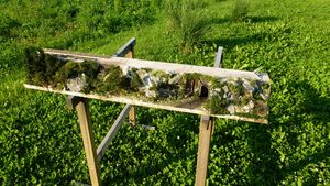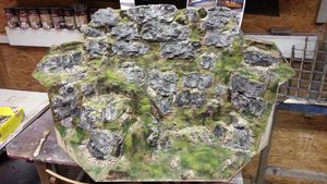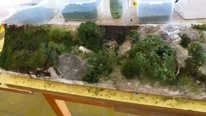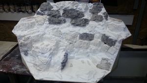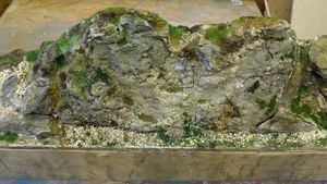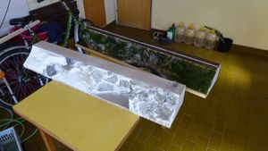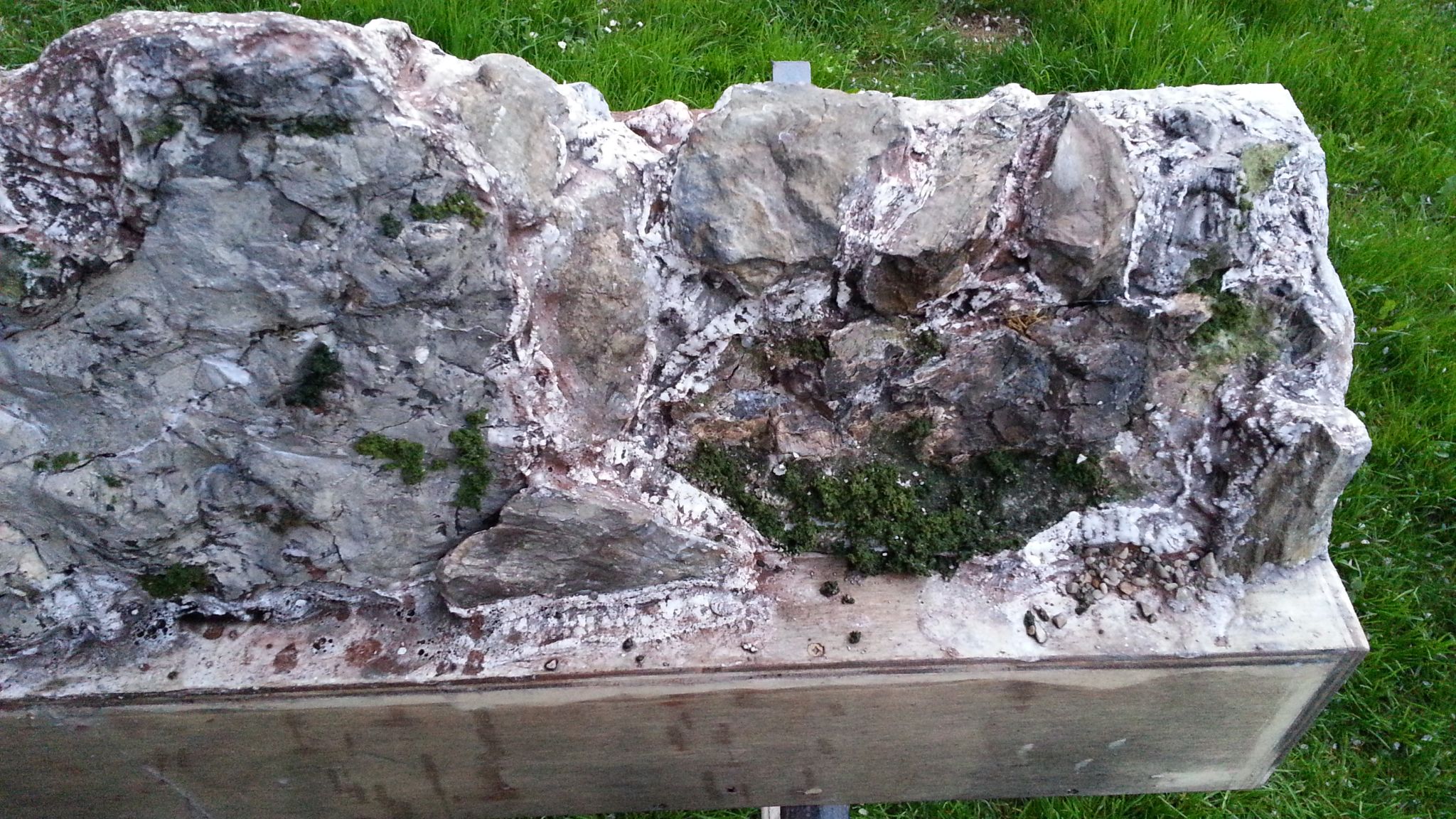 Ko se mavčni povoj posuši je na vrsti barvanje skal. Uporabljal sem črno in rjavo barvo za pridobivanje čimbolj realne barve naravnih skal. Ko se barve posušijo so na vrsti male skale, ter razno odpadlo kamenje. Sledi podlaga v gozdu in travnikih, torej razni rjavi, oker in zeleni posipi.