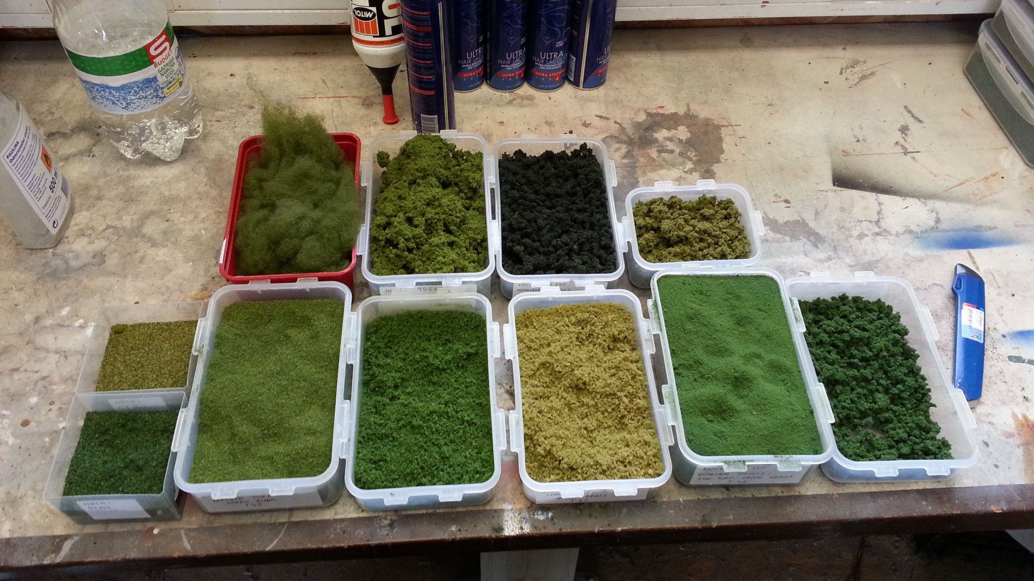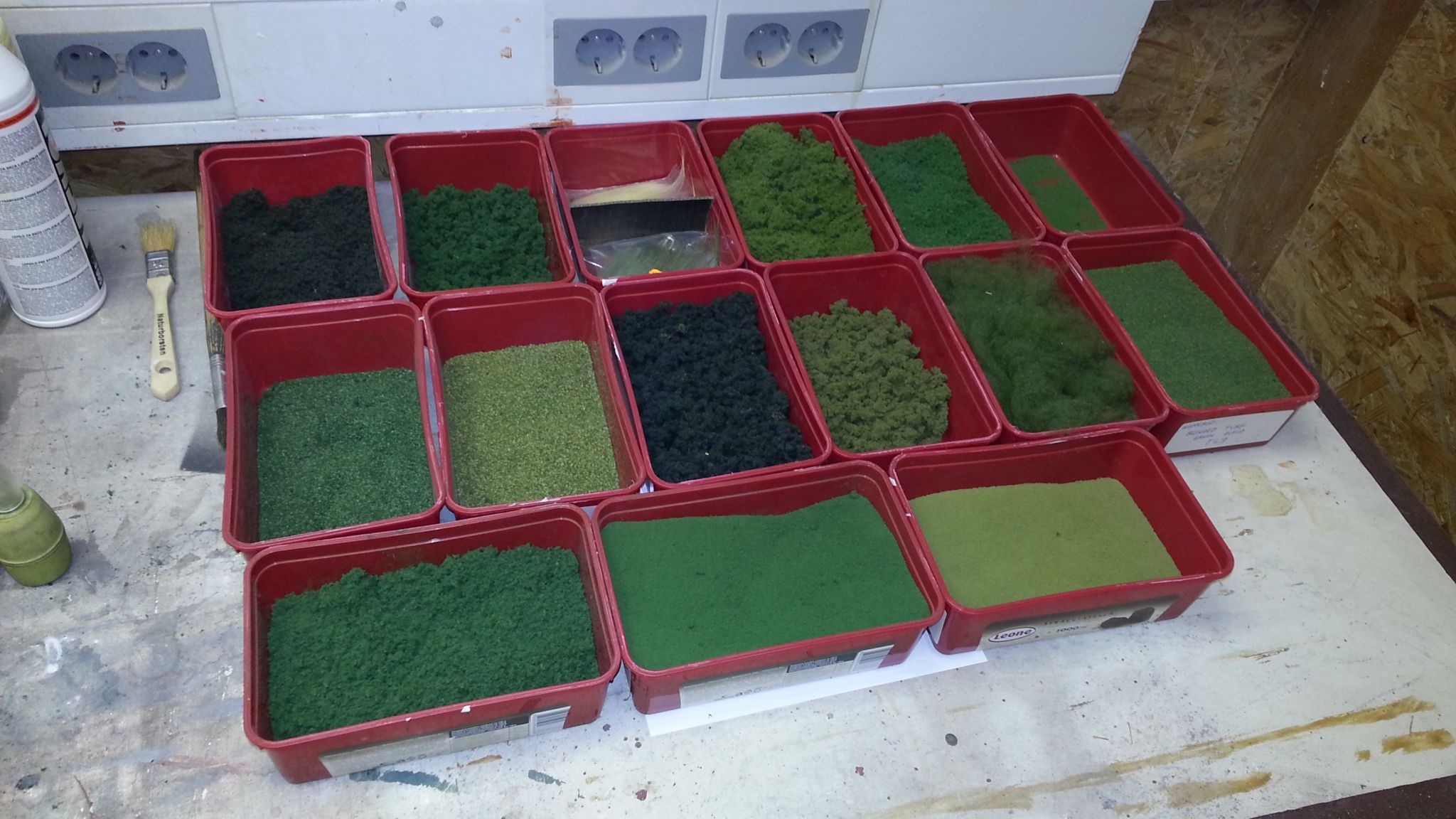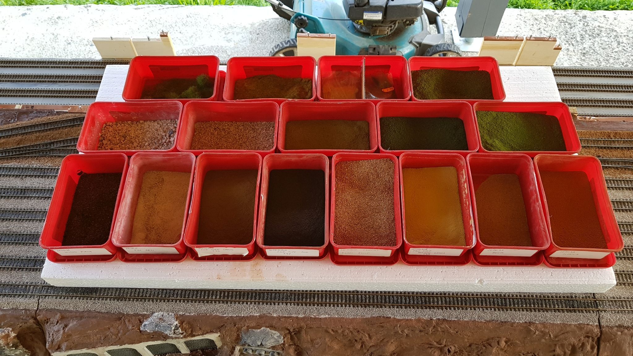 Prva slika kaže katere vse odtenke peskov in nizkih travnatih površin sem uporabil za primarne posipe na sceni pred yardom. Super delo, veliko veselja, priporočam vsakemu modelarju da se loti česa podobnega.
