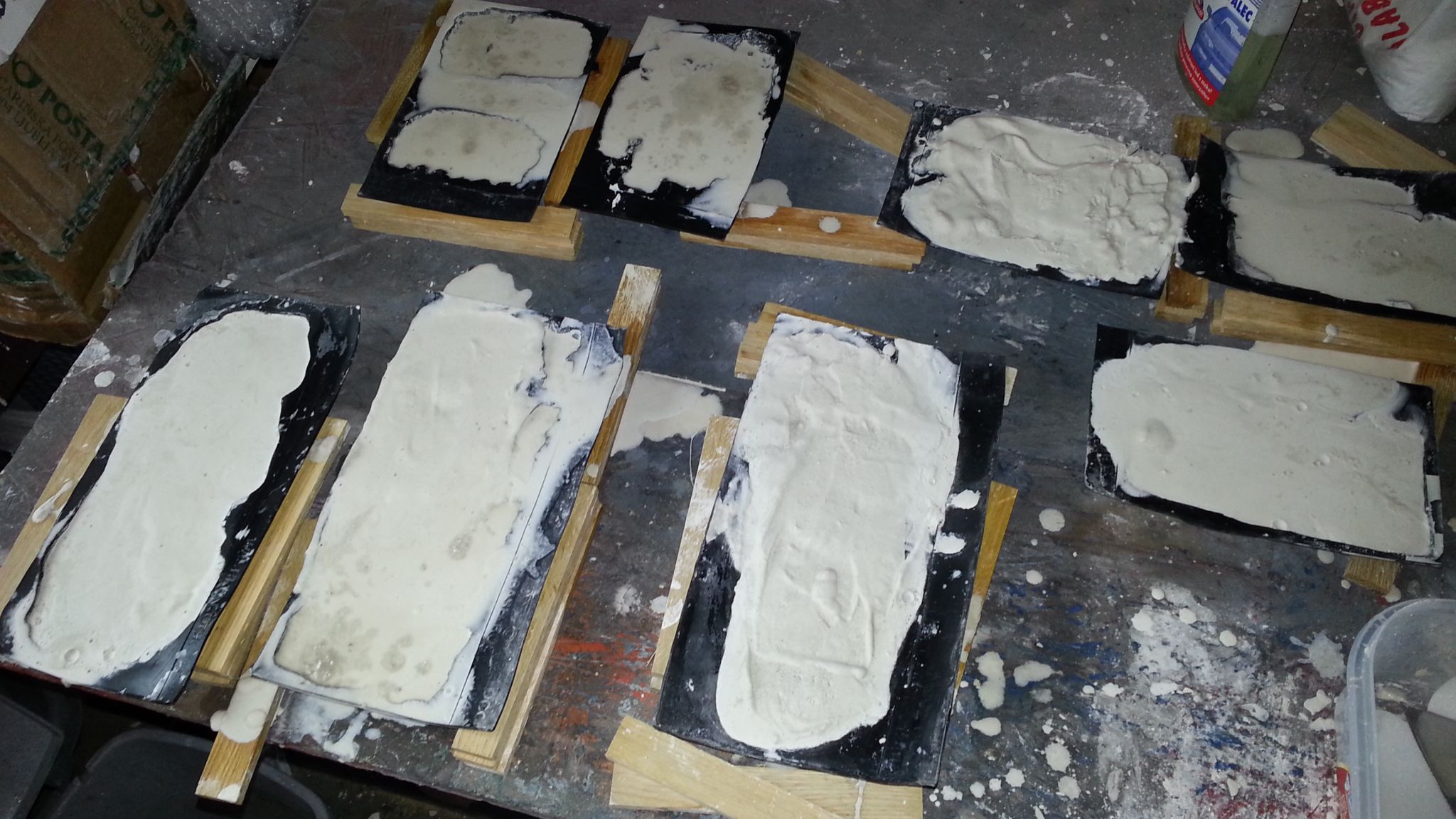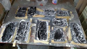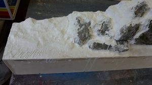 Skale sem izdelal iz navadnega mavca. Modelarji so mi svetovali naj kupim posebni mavec za te reči, toda sam sem uporabil kar navadnega gradbinskega in zadeva je izpadla perfektno, brez ene same napake. Preden vlijete mavec v gumijaste kalupe obvezno poškropite kalupe z razstopino vode in čistila za posodo, da razbijete površinsko napetost gume in s tem se bo mavec resnično vlil v vse špranje. To je zelo pomembno, v nasprotnem primeru boste imeli veliko zračnih mehurčkov kar na skalah res ne izgleda ok.