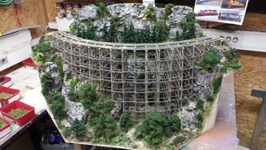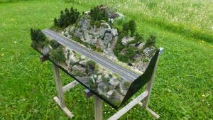 Dioramo sem začel ustvarjati skupaj s prijateljem Erikom. Zamislila sva si vsak po 110 cm dolgo dioramo, katera nam bo vsakemu posebej služila za slikanje lokomotiv in vagonov, zunaj na soncu v naravi, ko bi pa šla na kak sejem, pa lahko obe polovici sestaviva v večjo celoto in na njej voziva vlake. Na prvi sliki vidite nekoliko bolj izdelano Erikovo dioramo, moja je pa na začetku. Dioramo sva začela z izdelavo lesenega dela, nadaljevala z izdelavo podlage iz stiroporja. Na to podlago sem limal prave skale, in kasneje ko so bile skale vse postavljene sem z mavčnimi zavoji ves stiropor prekril da sem dobil tako lepo belo oblikovano pokraino iz katere pa ven strlijo skale.
