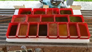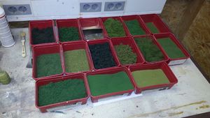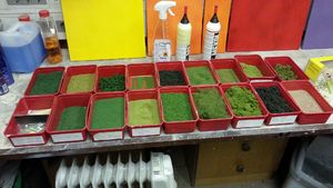 Na vrsti je barvanje skal in mavčnih povojev. Skale sem barval z črnim tušem (wash) in hkrati škropil vse skup z veliko vode (še bolje je medicinski alkohol), da se barva ne prime preveč močno in globoko v skale. Umesne prostore sem pa prebarval večinoma z rjavo in dodal tudi sem in tja malo črne barve. Sedaj so na vrsi posipi različnih zemljajstih in peščenih odtenkov. Uporabil sem črne, temno rjave, rjave in več odtenkov oker posipoe. Na določenih mestih sem dal tudi temno zelene posipe. En del posipov katere sem uporablal vidite na sliki.