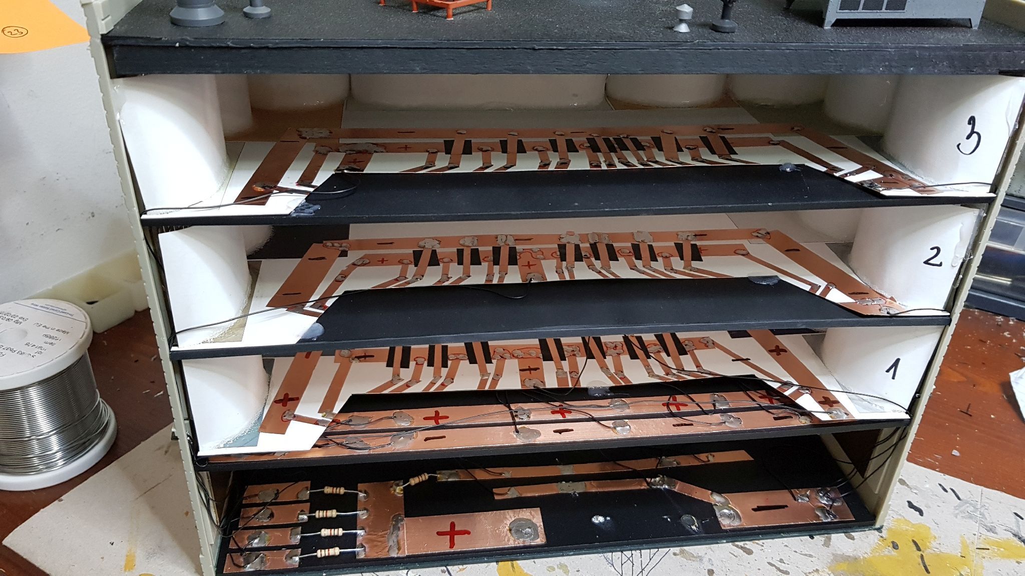 Tu sem začel izdelovati leseni del oziroma omarico za komandno ploščo v kateri bo vsa elektronika in na kateri bodo vse komande. Zadnja slika prikazuje tiskana vezja za eletroniko za vožnjo vlakov žez zanko.