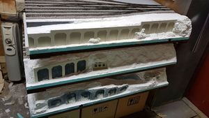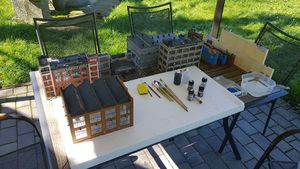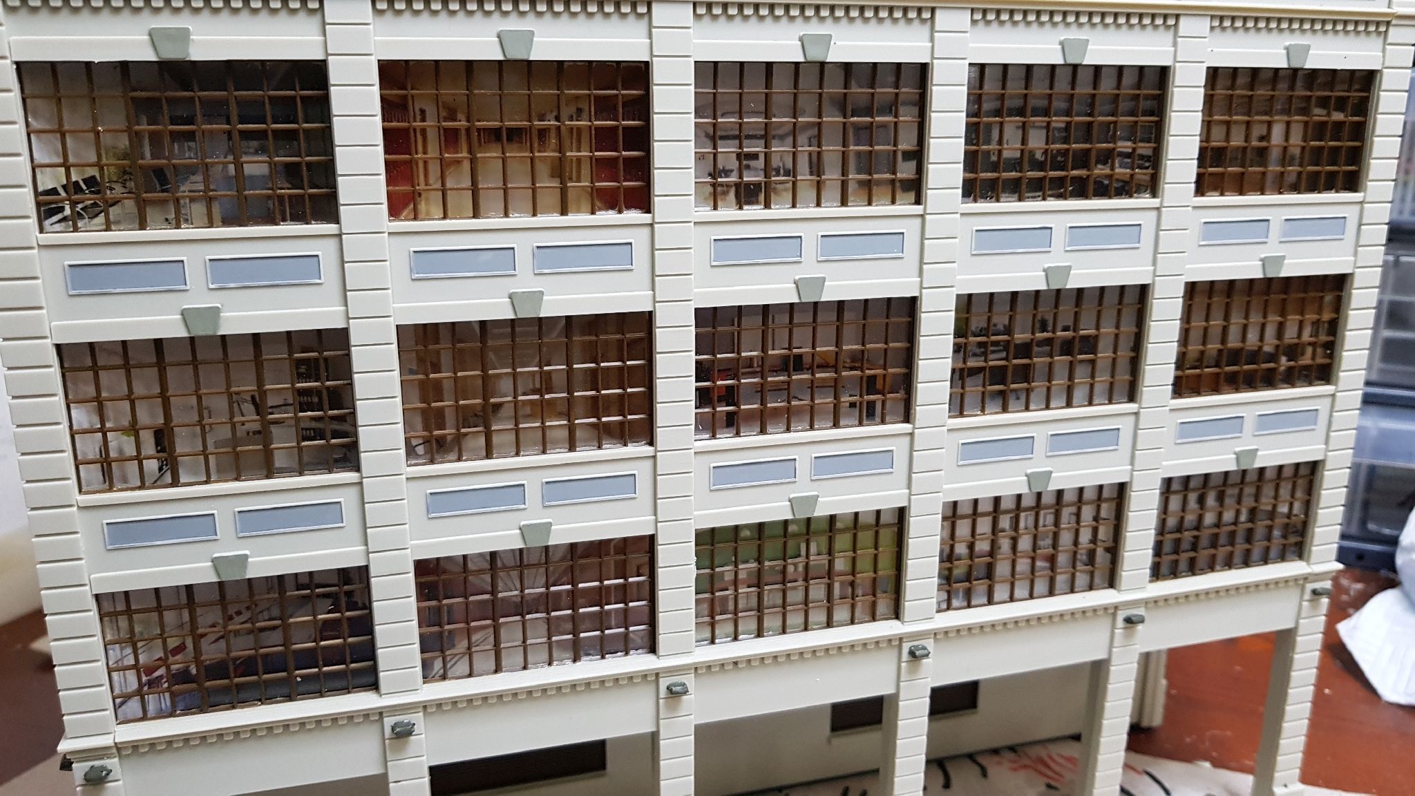 Tu sem naredil vse notranjosti objektov. Skoraj sako okno ima svojo notranjost invsaj po eno LED diodo za osvetlitev. Na zadnji strani enega od teh objektovv je vidno da sem za vsako okno na podlago v polkrogu nalepil sliko notranjosti in na prvo steno objekta dal svetlečo diodo da je učinek maksimalen. Ko so vsi objekti bili sestavljeni je sledilo staranje objektov in primer enega je na zadnji sliki.