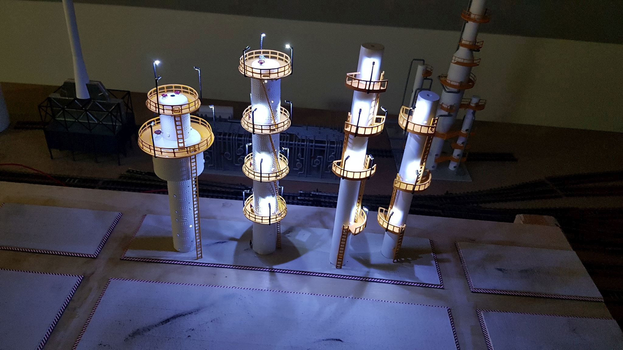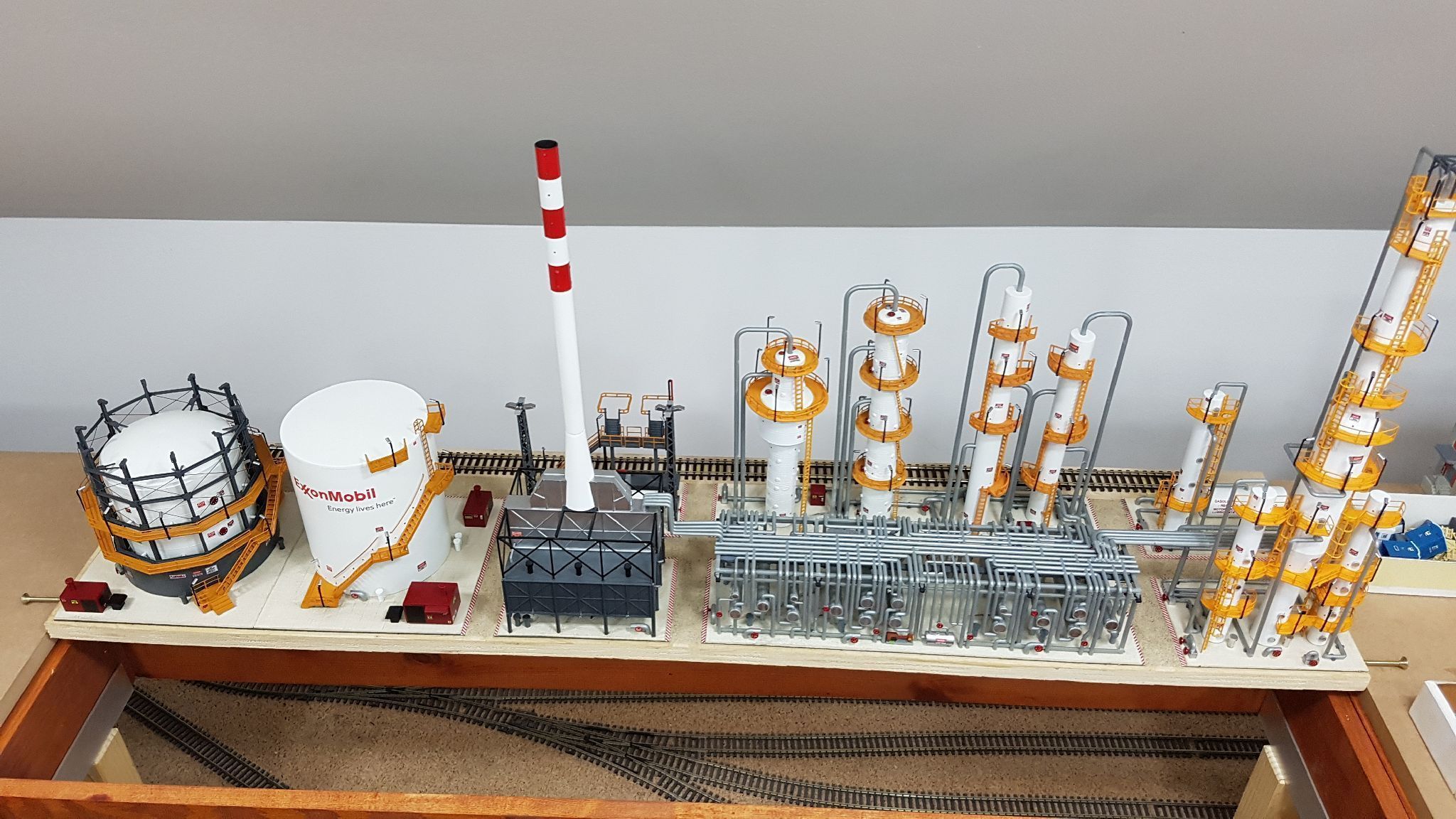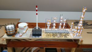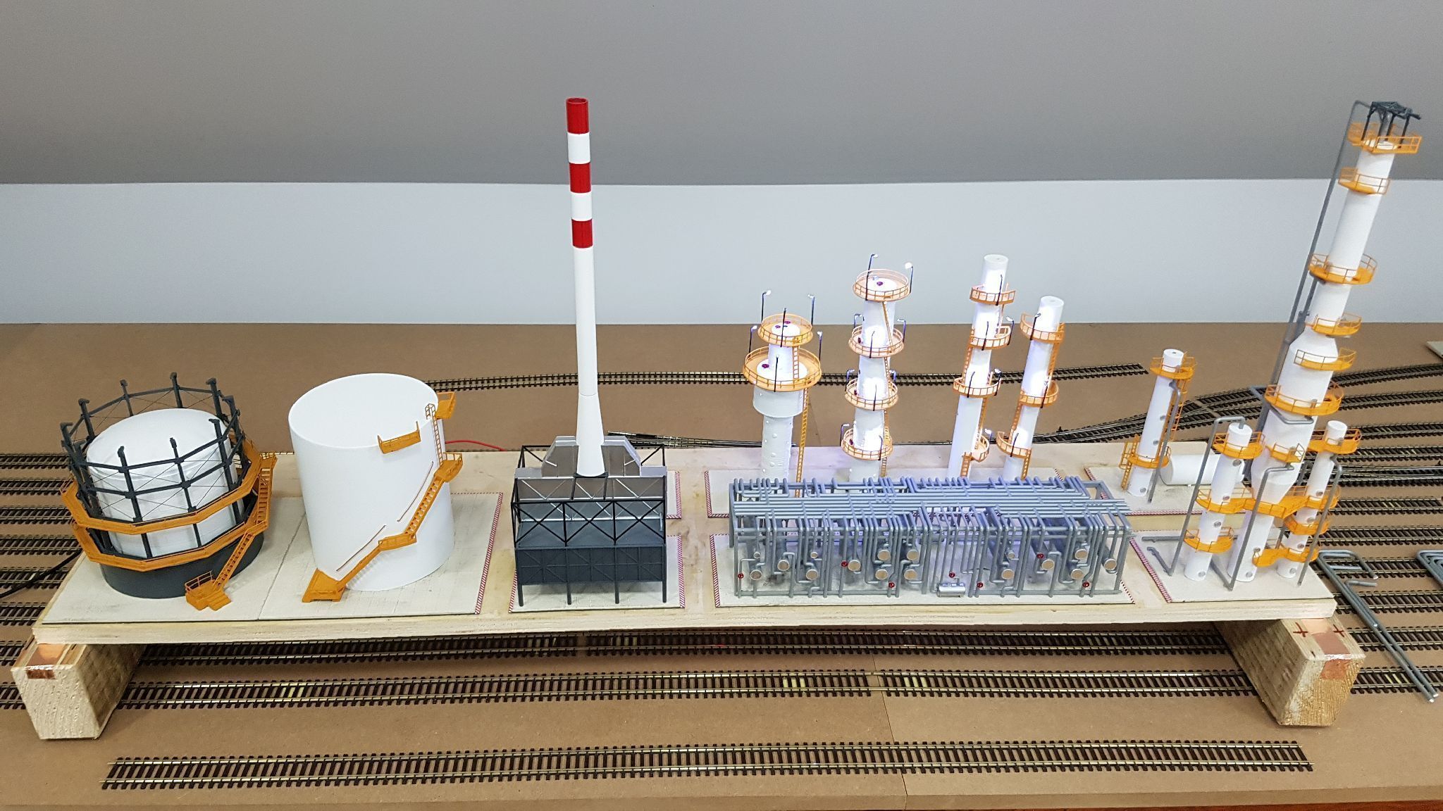 To je par slikic izdelave rafinerije. Dolga je en meter široka pa 25 cm. Tu na tem mestu sem imel še namen za rafinerijo samo dodati tir da tja pridejo cisterne kasneje sem to opustil. Rafinerija je lepo napredovala, vgrajenih je bilo okoli 300 svetlobnih teles. Večinoma so to LED diode, vseh dimenzij in različnih belih barvnih odtenkov da se dobi realistični občutek. Izdelava je trajala cca tri mesece v popodanskih urah. Mnogo "lučk" je narejenih z optičnimi vlakni in ta način dela se mi je zdel perfekten in bolj enostaven kot da bi za vsako lučko dajal LED diodo. Na ta način sem recimo naredil 10 lučk osvetljene so pa z eno samo LED diodo.