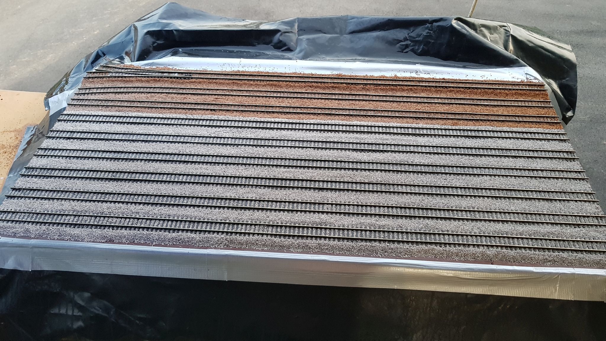 Peskanje je zahtevna operacija pri maketi železnice. Posebaj moram opozoriti da je treba paziti pri peskanju kretnic, njenih premičnih delov. namreč z lepilom se lahko ti zlimajo in nastane problem. Ponovno sem uporabil trik z oljem in sem na vsa mesta kjer je možnost da se kretnice zlimajo nakapal olje in vse je bilo super. Vsak modul sem posebej oblekel z polivinilom, da odvečna voda od lepila ne pride na lesno površino zaradi možnosti krivljenja in deformiranja. Dolgotrajno in mučno delo, katerega je pa potrebno opraviti da se pridobi realističen izgled. Yard sem razdelil na dva dela, in sicer gledano od spredaj prvih 6 tirov je v svetlejšem sivem pesku, ostali tiri so v temnejšem, rjavem. Naknadno bom naredil lepe prehode in tega rjavega na sivega, posvatlil rjavega z navadnim domačim presejanim peskom fine granulacije da dobimo lep odtenek rjavo-sivo umazanega peska. Siv pesek sem naknadno z zelo razredčenim tušem umazal da dobi izgled rabe in umazanije od olja.
